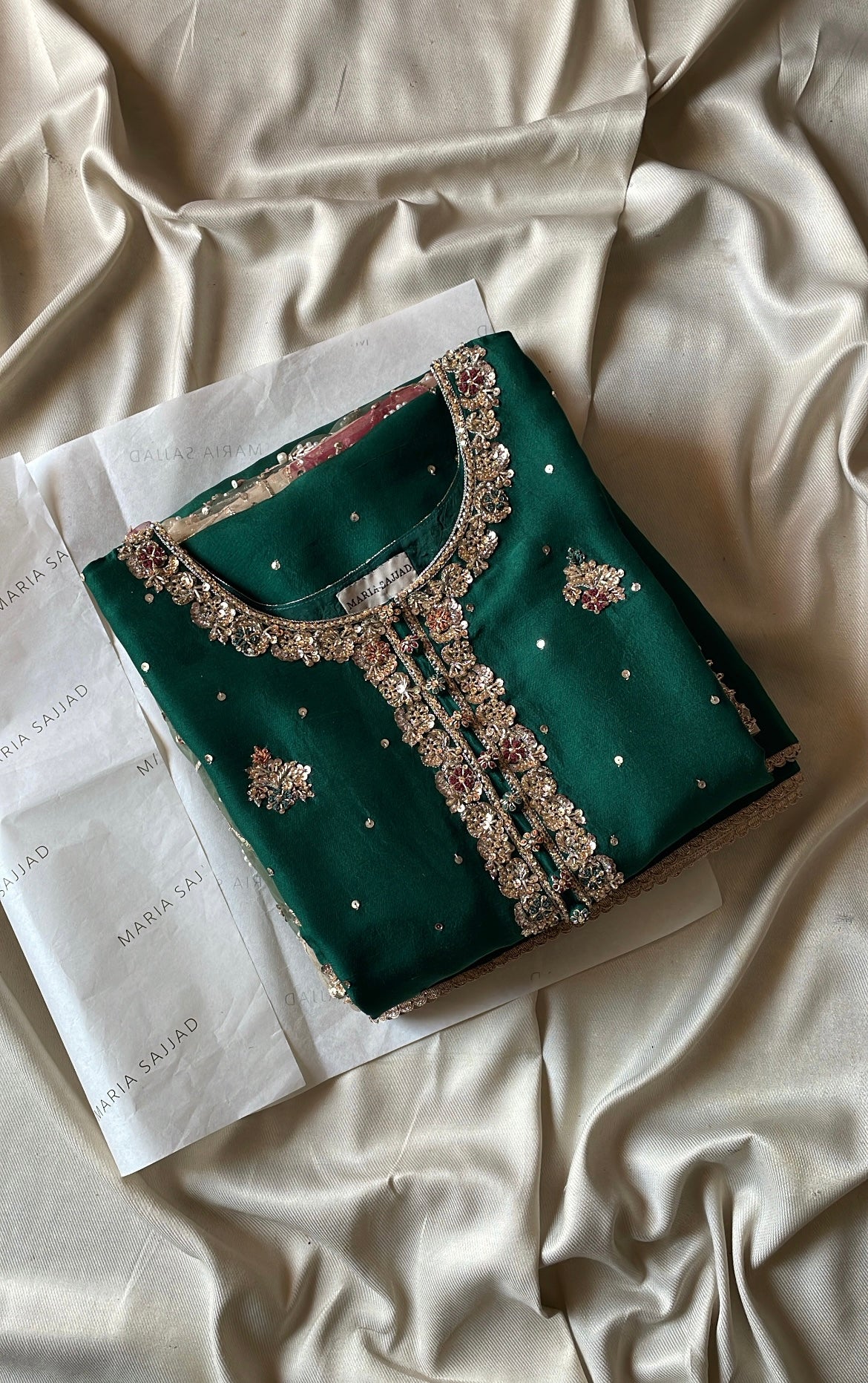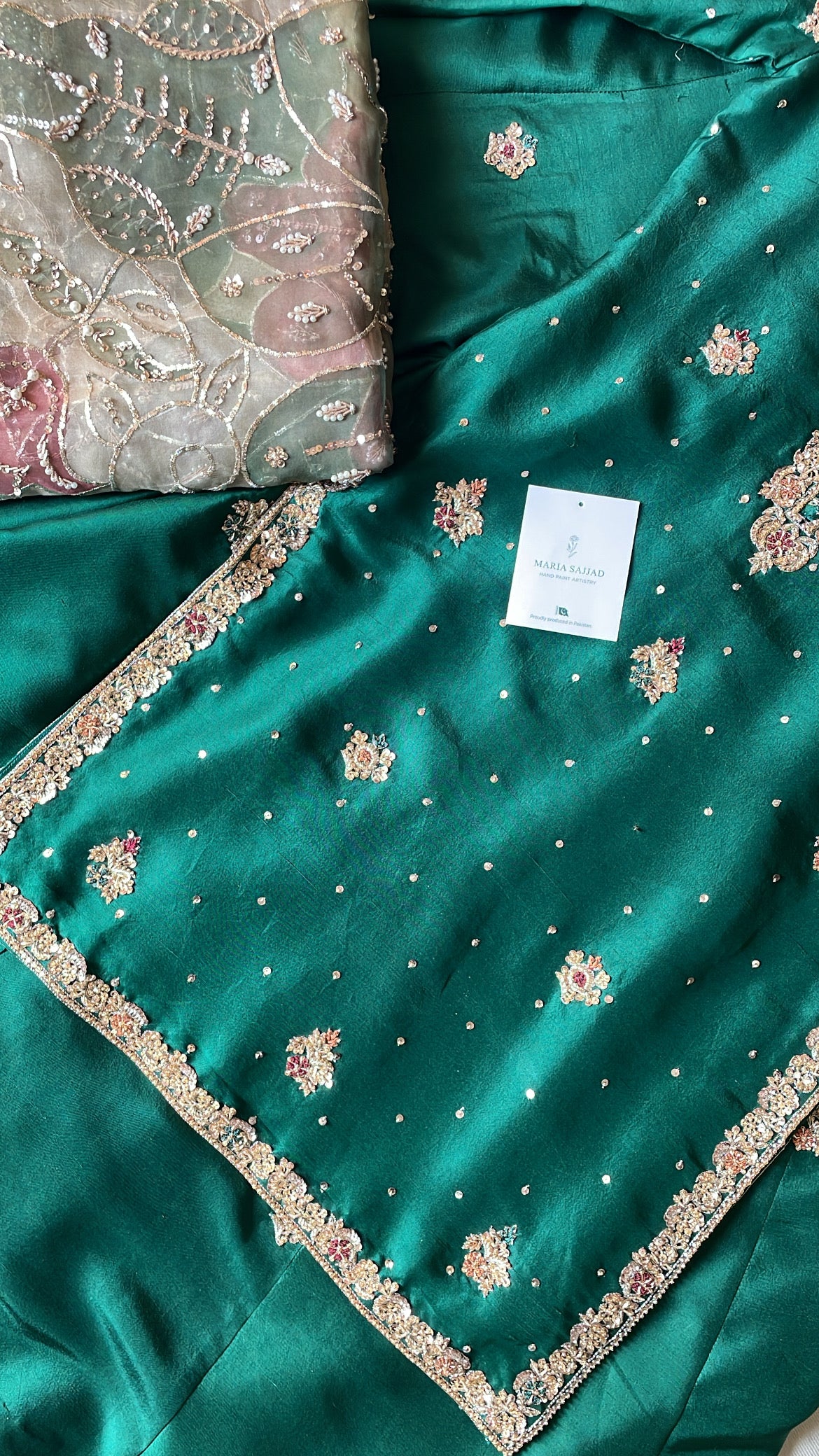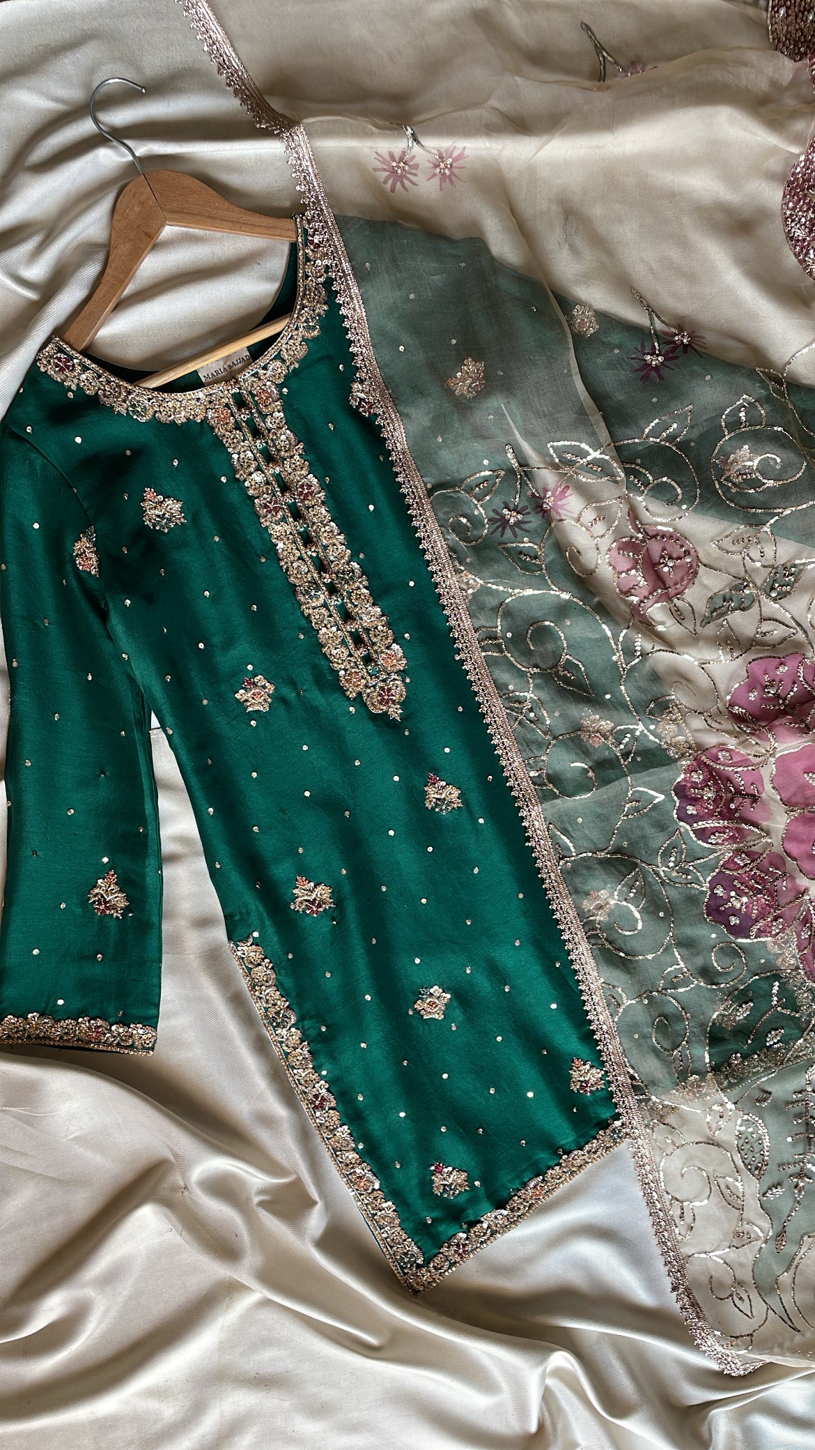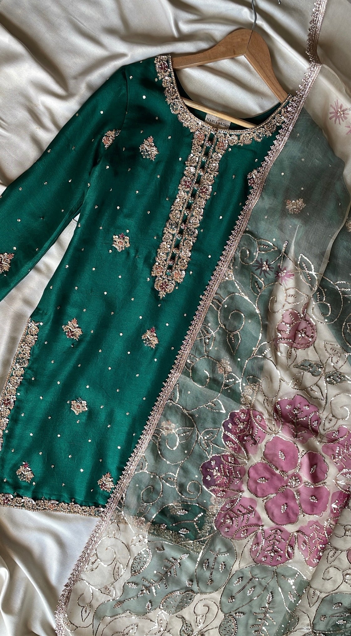 Embrace timeless sophistication with Batool, a meticulously crafted three-piece festive ensemble tailored for life's most memorable moments. This distinguished collection unites a hand-painted pure organza dupatta with an intricately embellished raw silk shirt and coordinating raw silk sharara, each element reflecting superior artisanal technique. Designed for weddings, engagements, and celebratory occasions, the ensemble combines luxurious natural fabrics with refined embellishment work to deliver an understated yet commanding presence that honors traditional aesthetics while elevating your personal style.