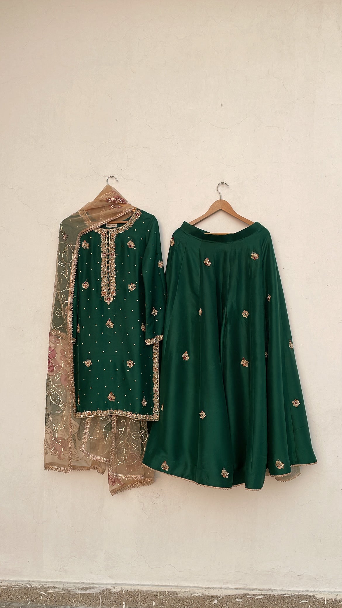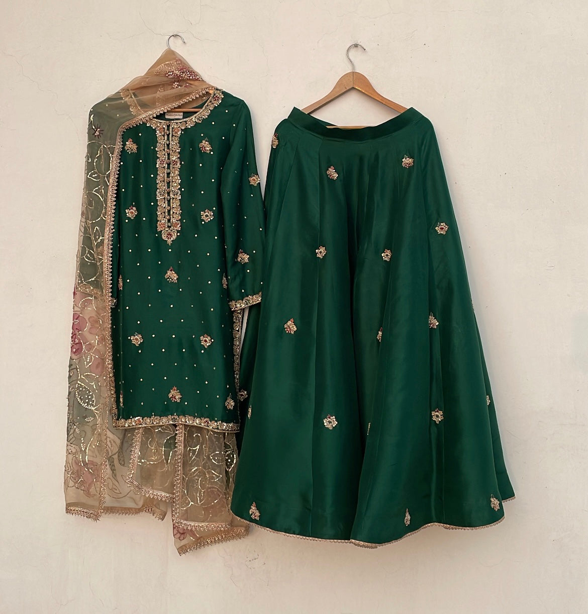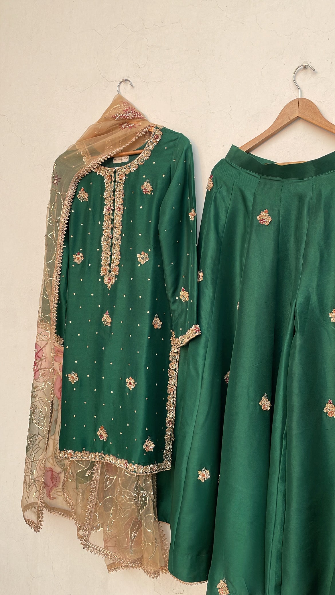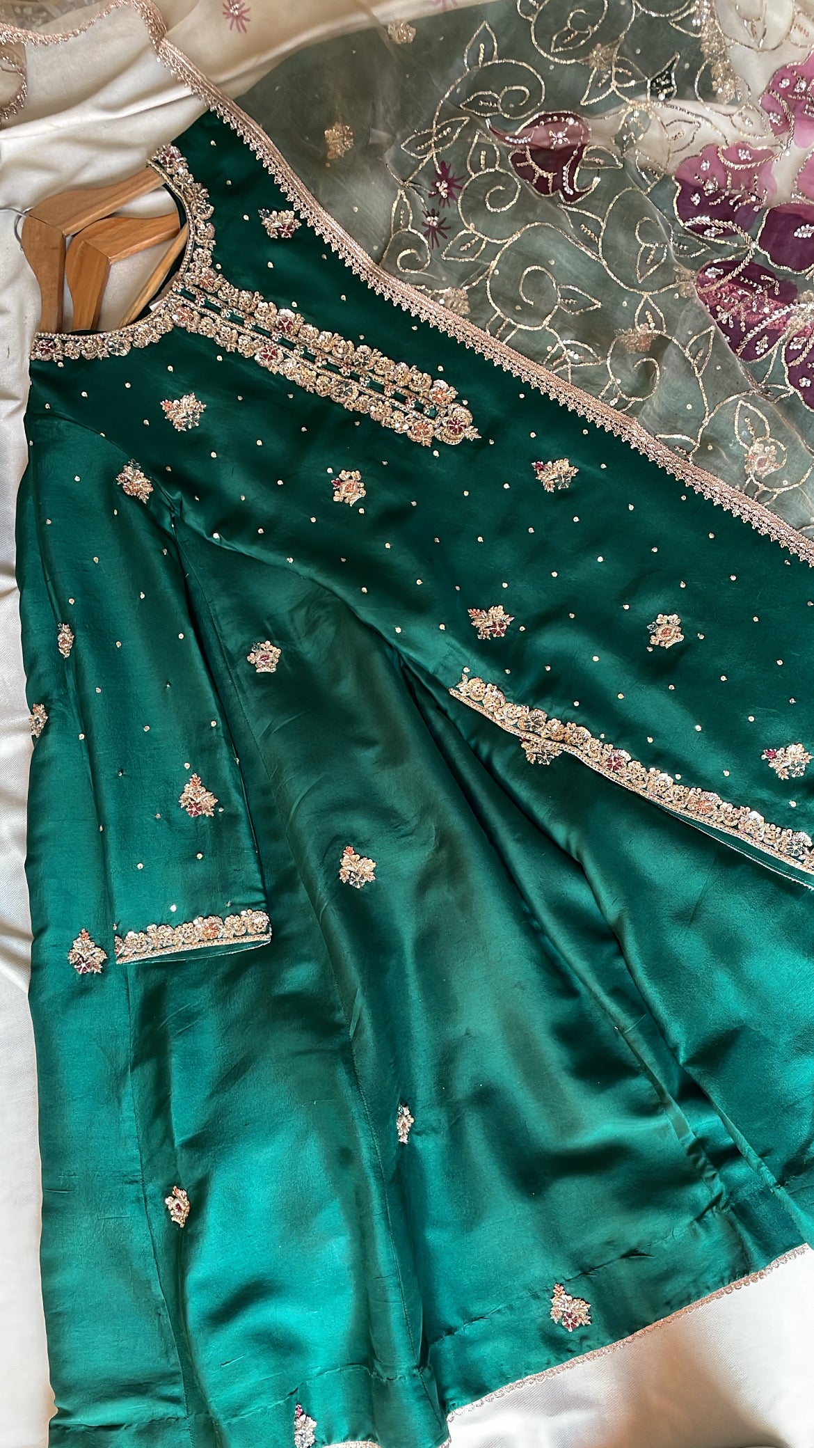Embrace timeless sophistication with Batool, a meticulously crafted three-piece festive ensemble tailored for life's most memorable moments. This distinguished collection unites a hand-painted pure organza dupatta with an intricately embellished raw silk shirt and coordinating raw silk sharara, each element reflecting superior artisanal technique. Designed for weddings, engagements, and celebratory occasions, the ensemble combines luxurious natural fabrics with refined embellishment work to deliver an understated yet commanding presence that honors traditional aesthetics while elevating your personal style.