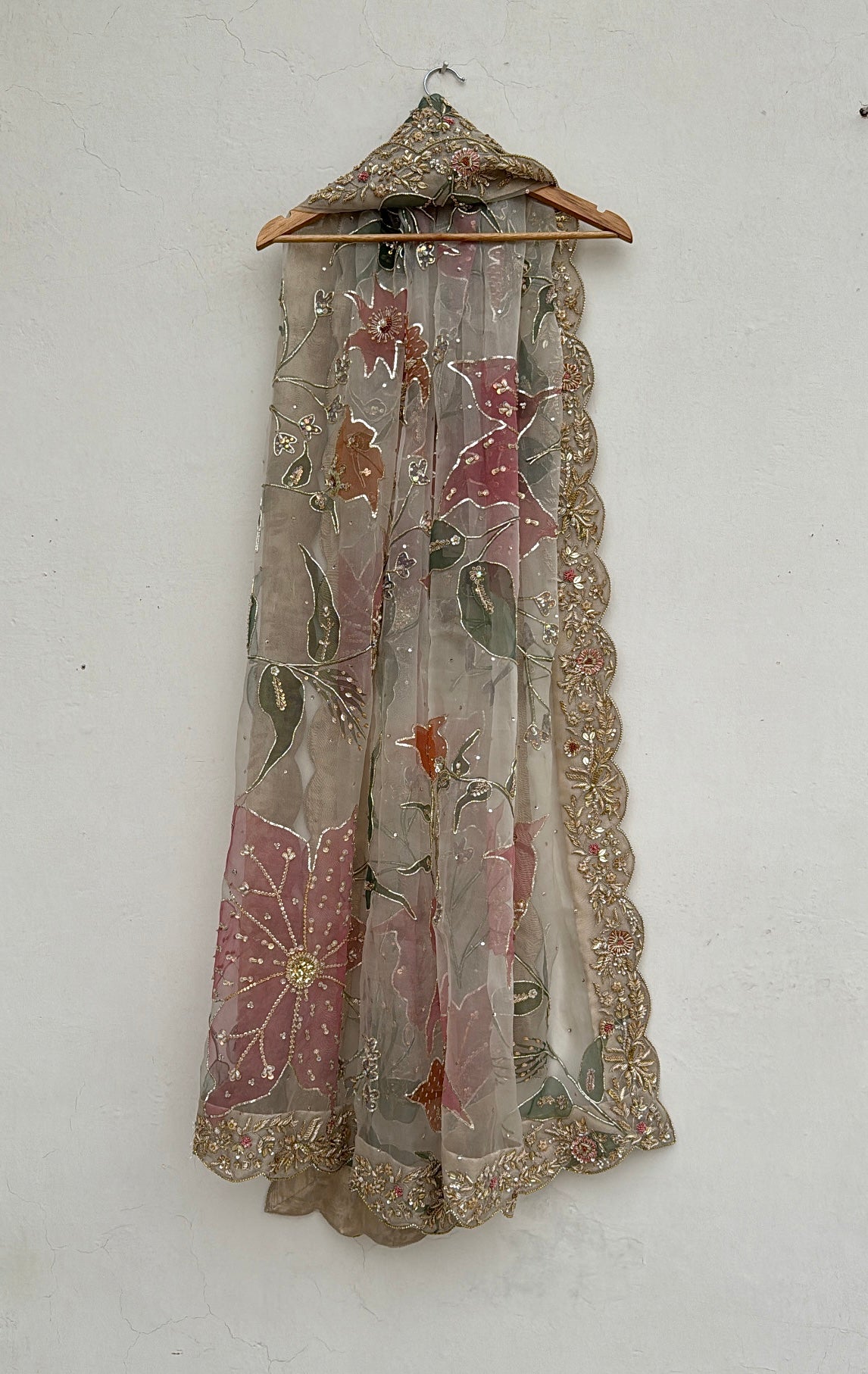 Elevate your bridal look with this exquisite Handpainted Dupatta, where traditional craftsmanship meets contemporary elegance. Each piece is individually adorned by master artisans using time-honored techniques, ensuring no two dupattas are identical. This wearable art form celebrates the bride's individuality while honoring cultural heritage, transforming your wedding day ensemble into a distinctive statement of personal style and refined taste.