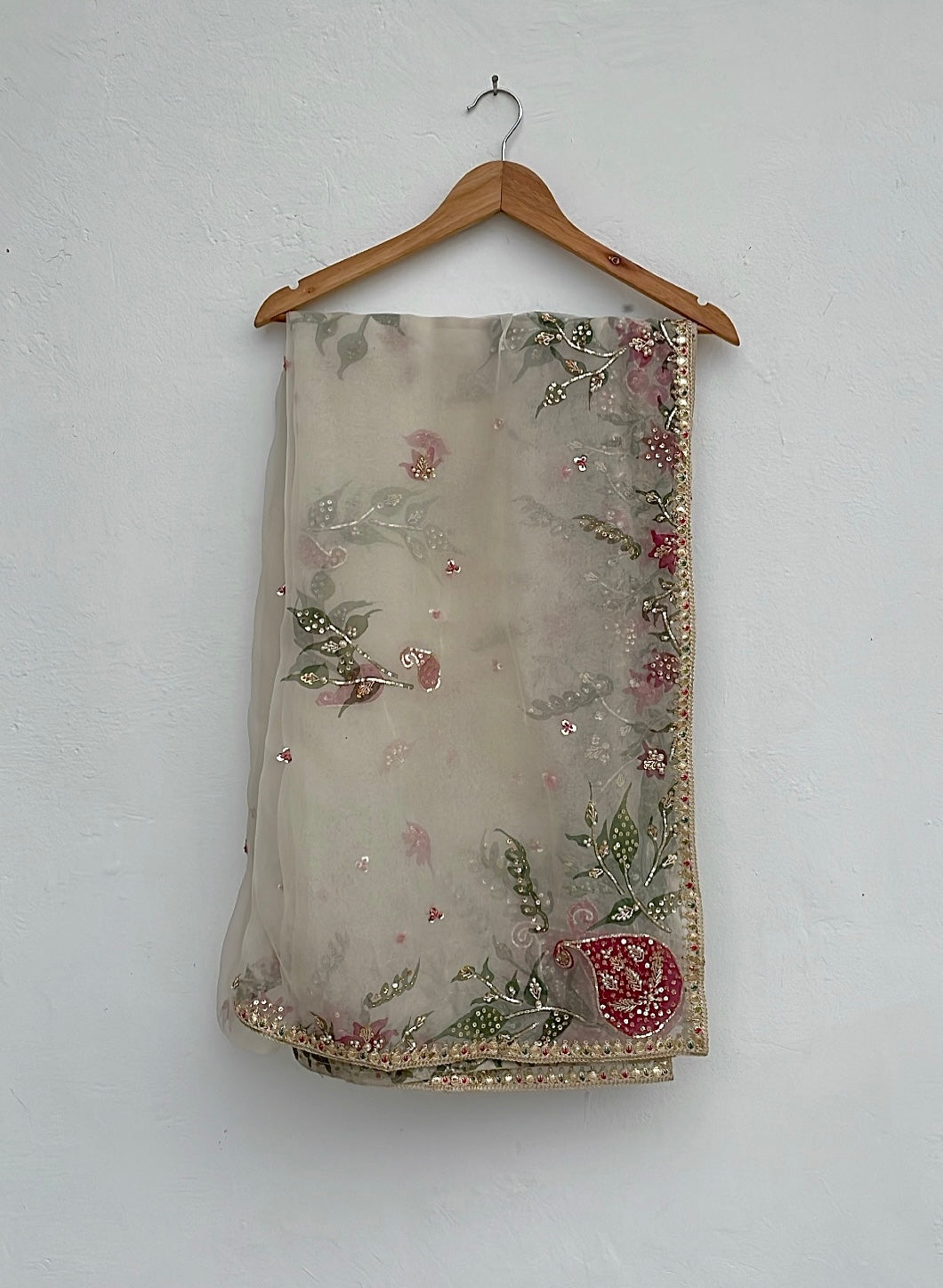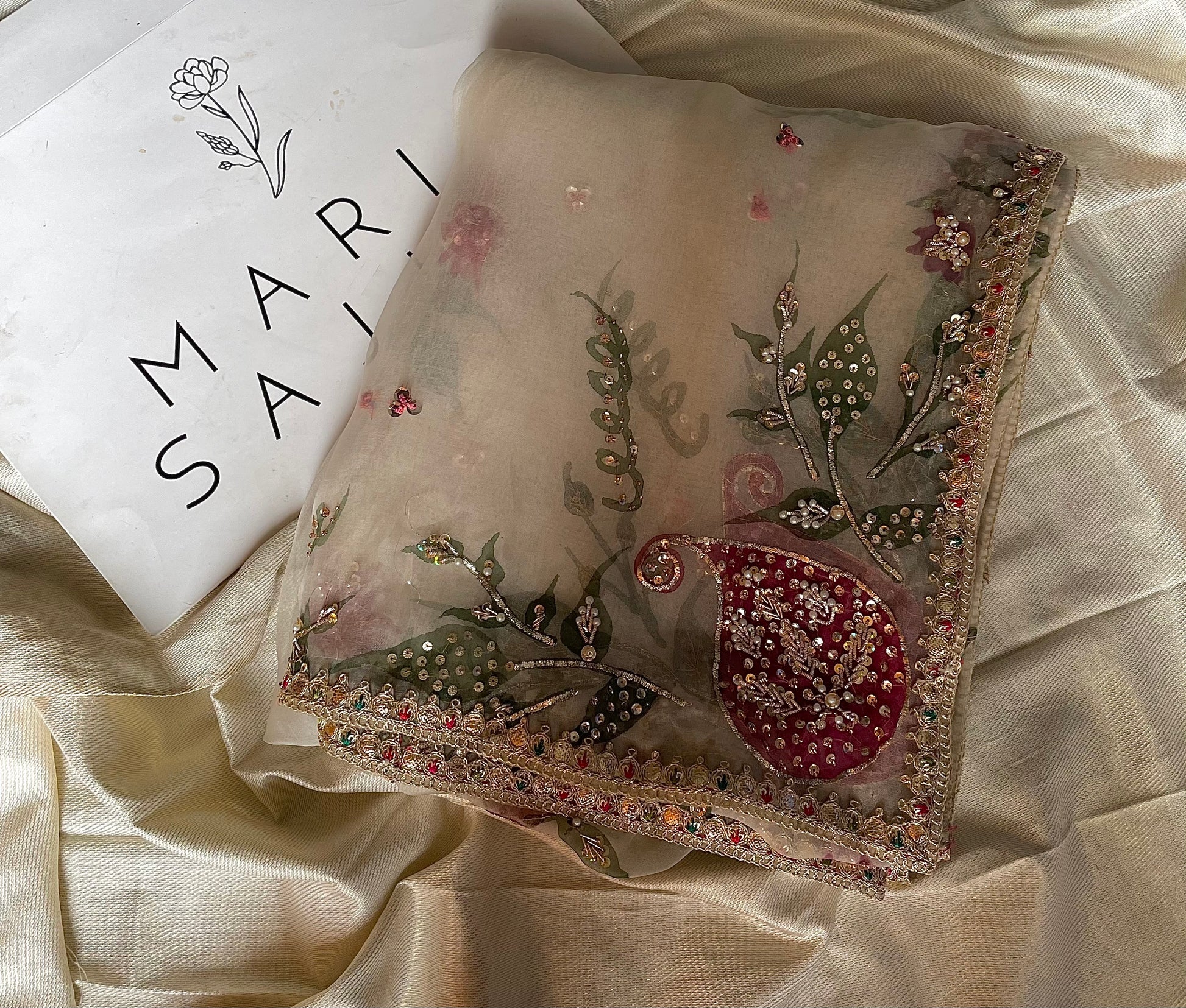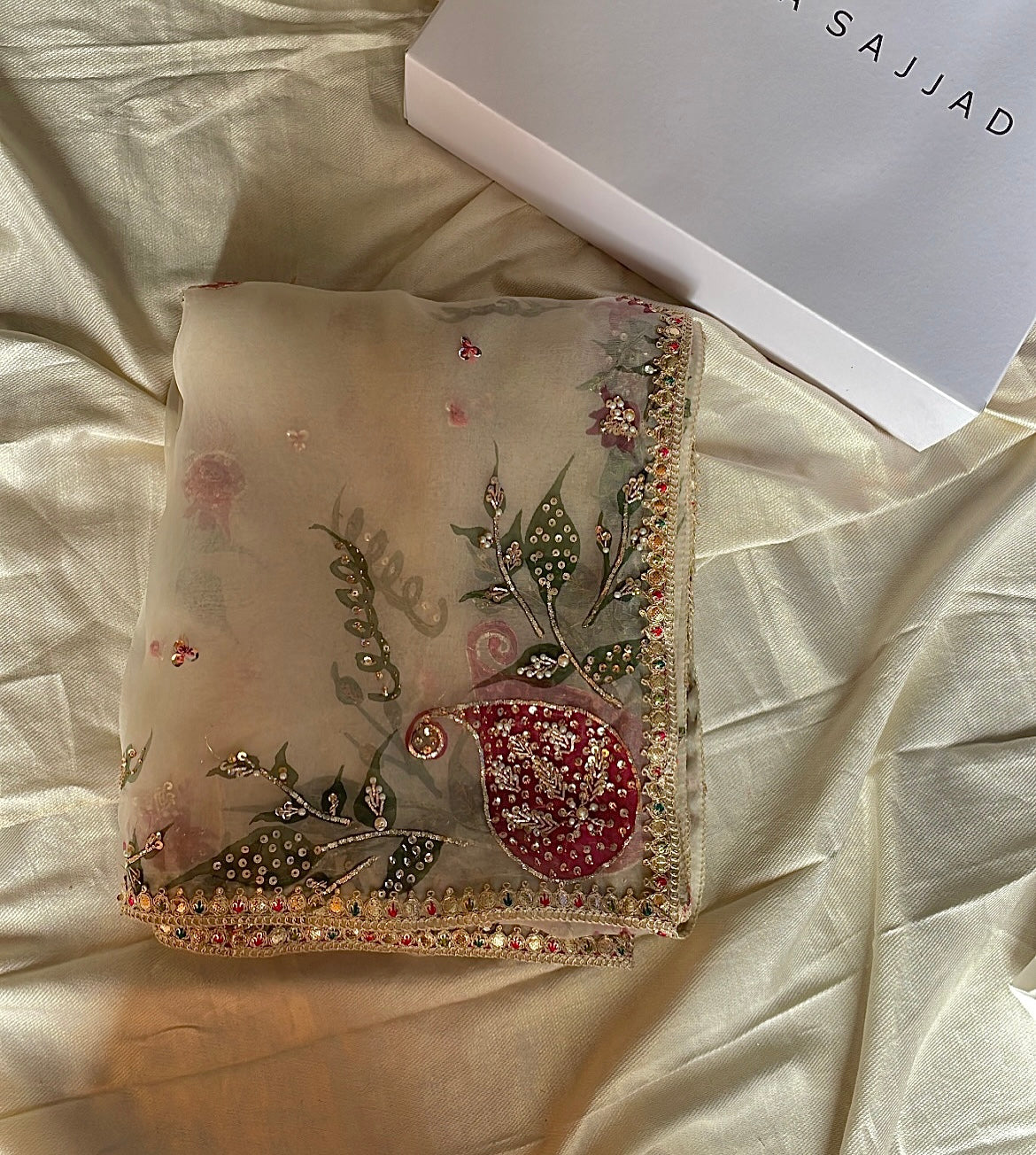 This exquisite handpainted dupatta merges cultural heritage with contemporary artistry, offering a sophisticated accessory for your formal ethnic ensemble. Each piece showcases meticulous craftsmanship, individually painted by experienced artisans on premium fabric to ensure distinctive character and authenticity. A timeless investment for those who appreciate bespoke, handcrafted textiles.