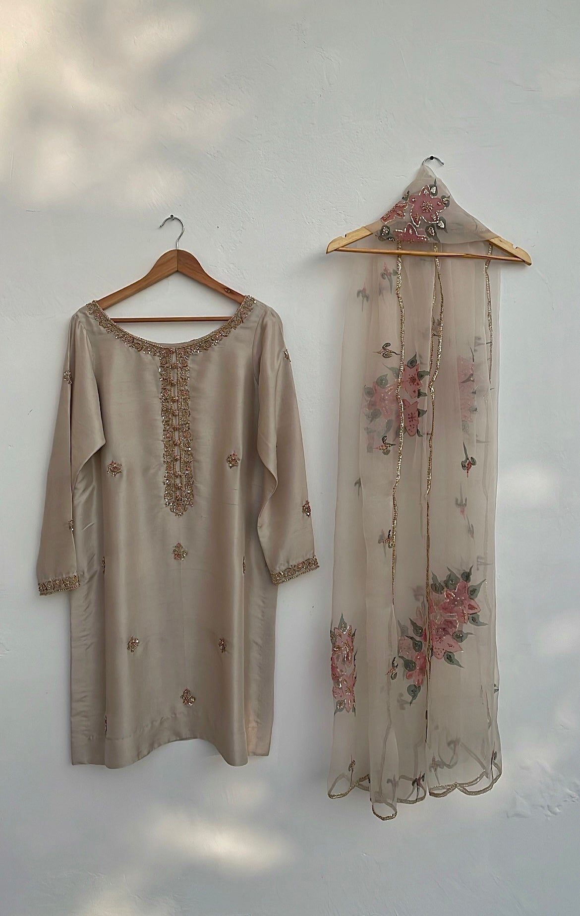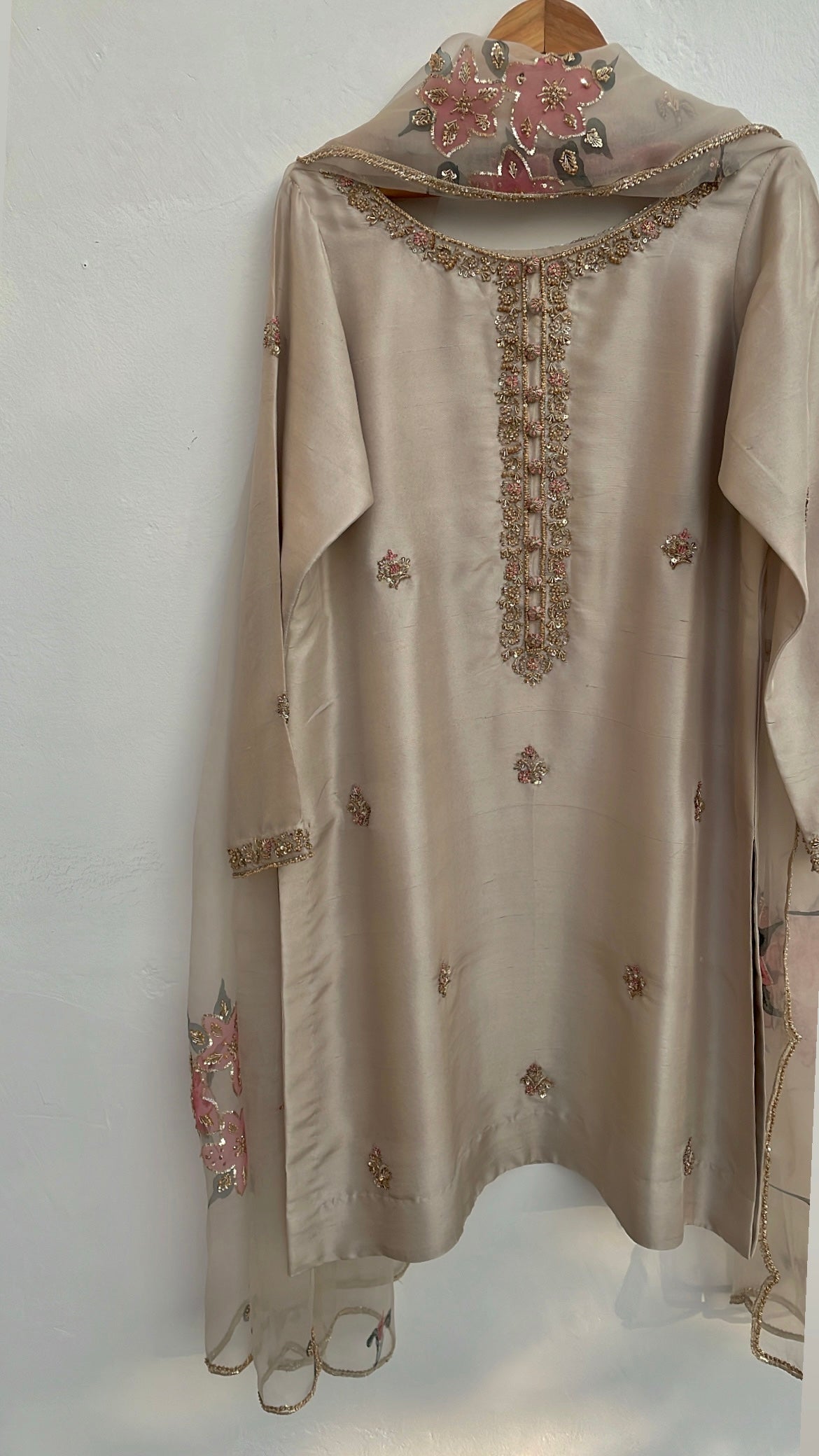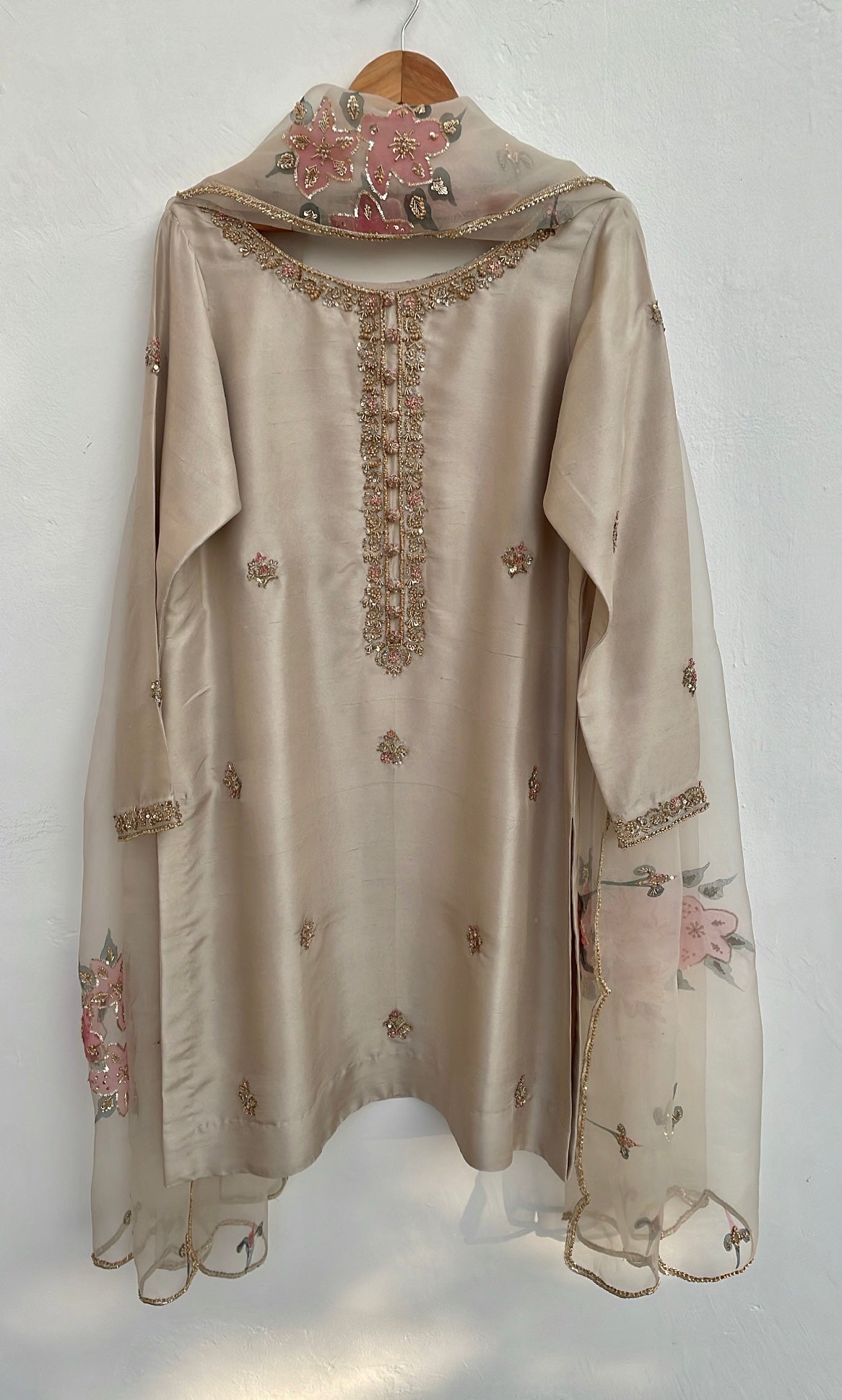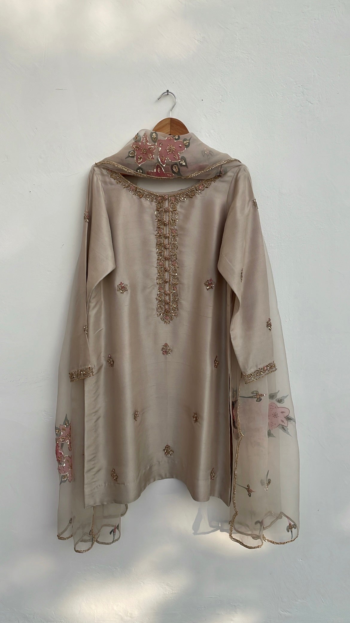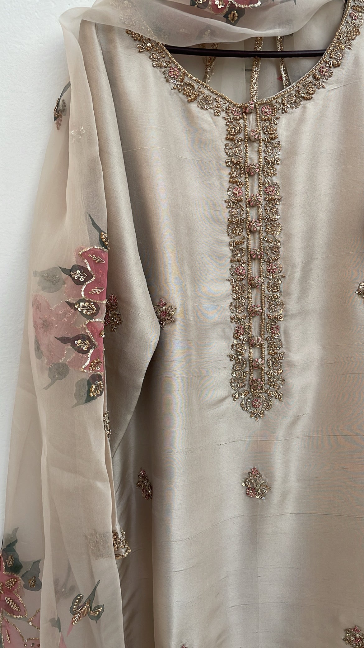 Embrace timeless sophistication with Iffat, a meticulously crafted three-piece festive ensemble tailored for life's most memorable moments. This distinguished collection unites a hand-painted pure organza dupatta with an intricately embellished raw silk shirt and coordinating raw silk trousers, each element reflecting superior artisanal quality. Designed for weddings, engagements, and celebratory occasions, the ensemble harmonizes luxurious natural fabrics with refined embellishment techniques, delivering an understated yet commanding presence that honors traditional aesthetics while maintaining contemporary elegance.