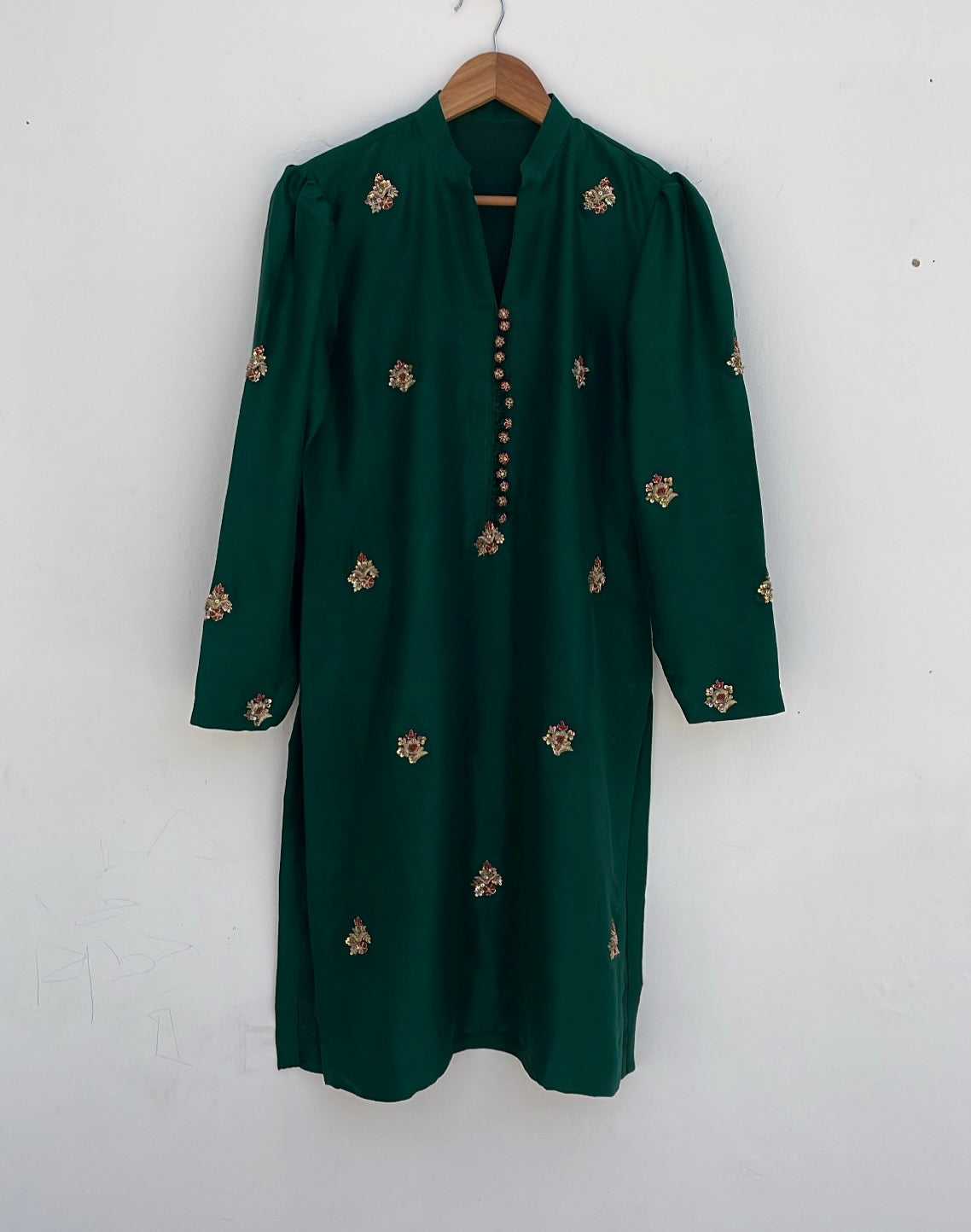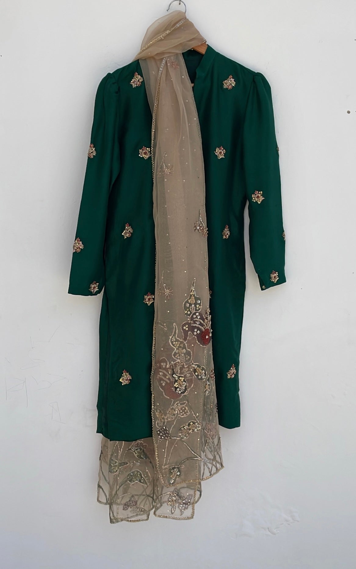 Experience understated luxury with the Kubra collection, a thoughtfully assembled three-piece ensemble tailored for momentous celebrations. This sophisticated set combines a handpainted pure organza dupatta with an intricately embellished raw silk kurta and coordinating raw silk trousers, creating a harmonious composition. Engineered for weddings, engagements, and festive occasions, the ensemble demonstrates superior craftsmanship through premium textiles and refined detailing, allowing you to embody grace and cultural authenticity.