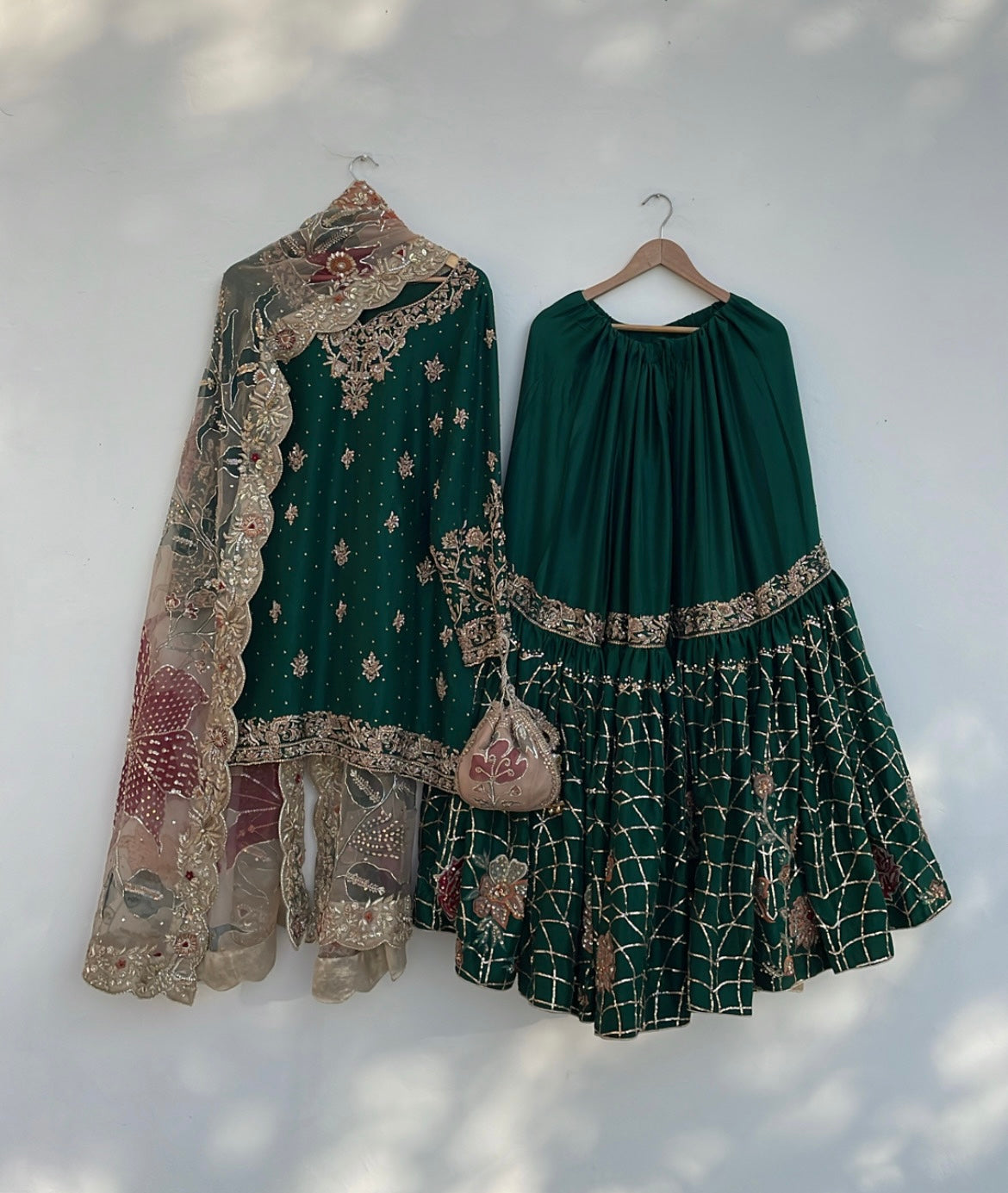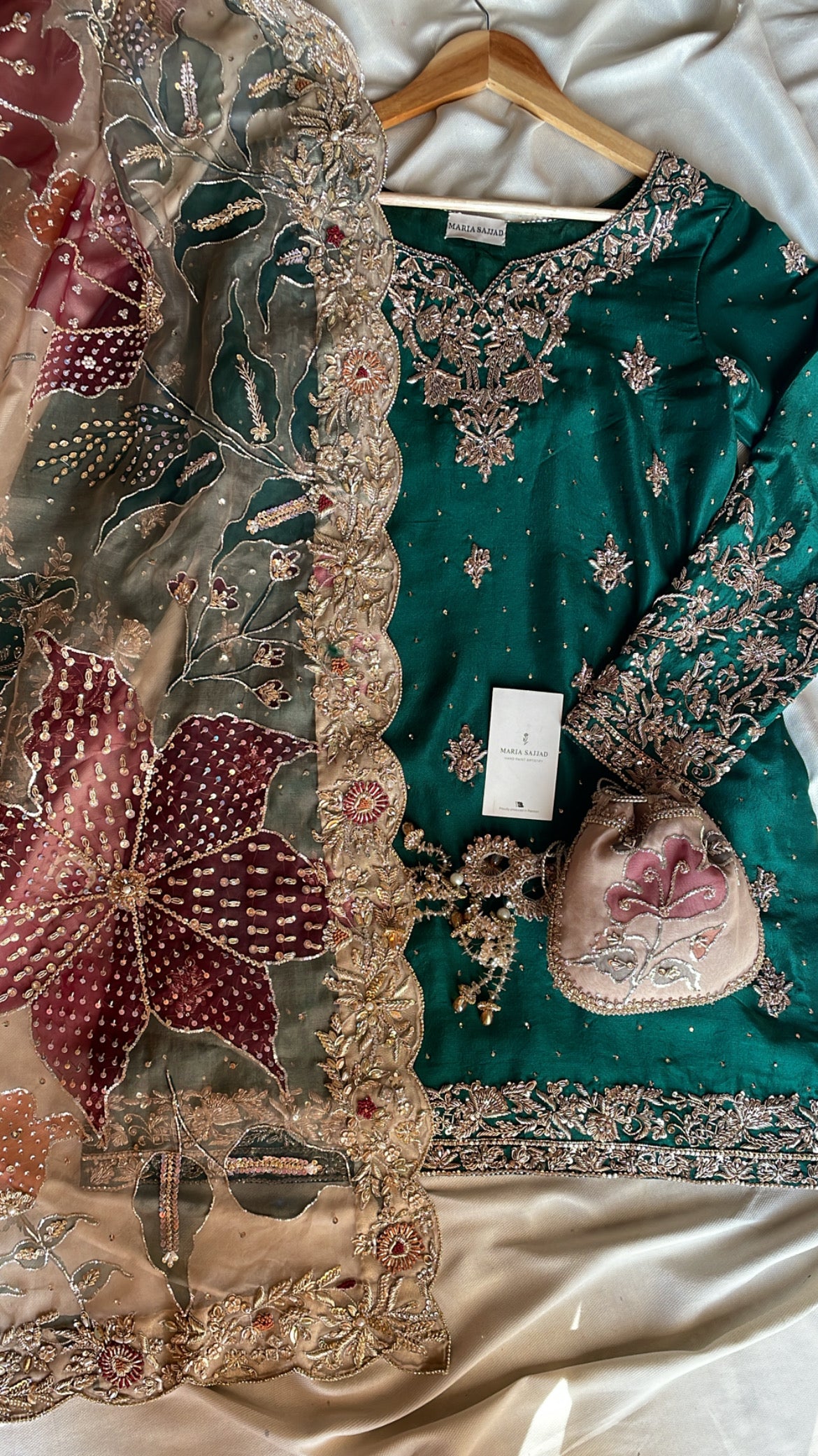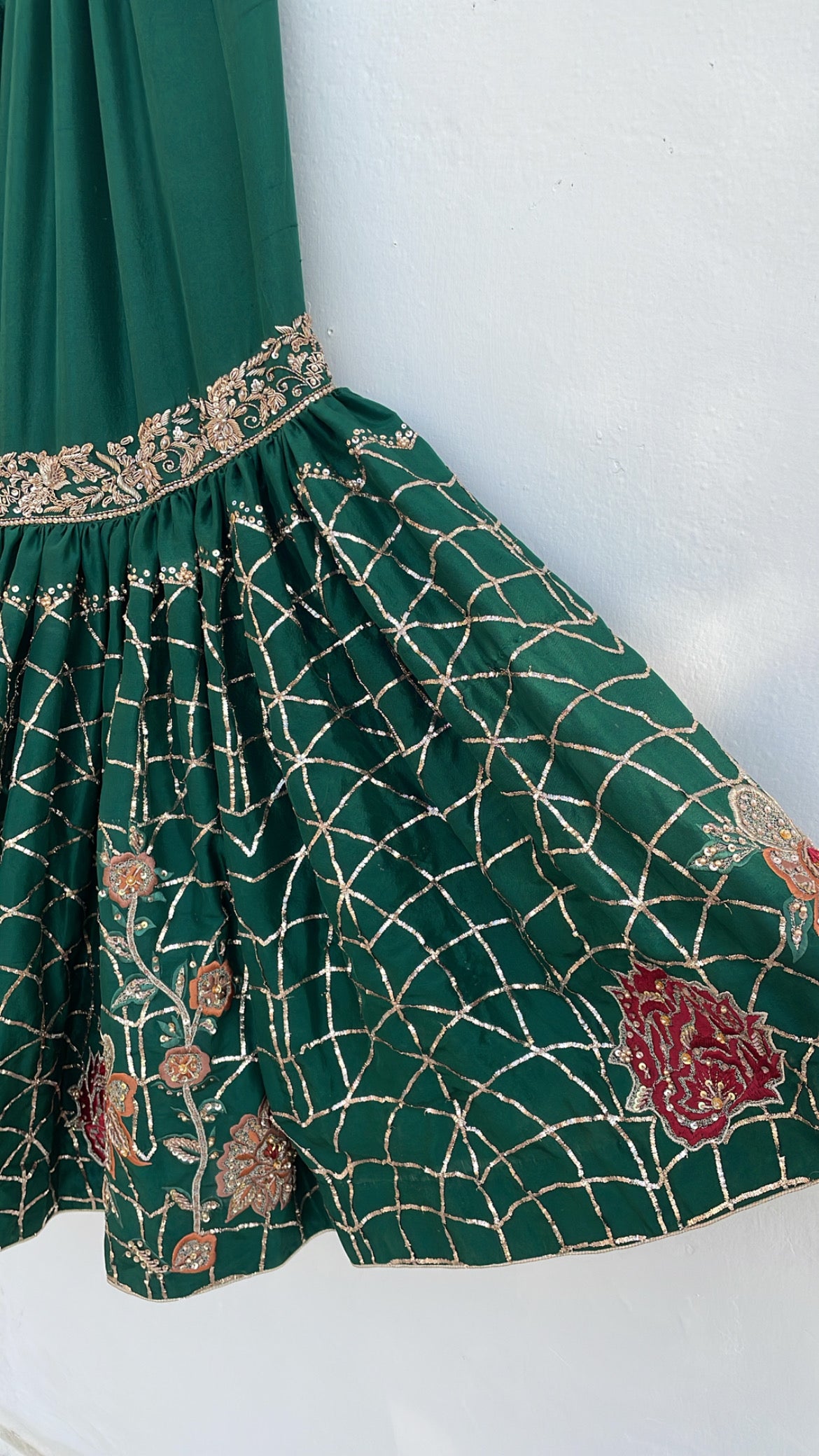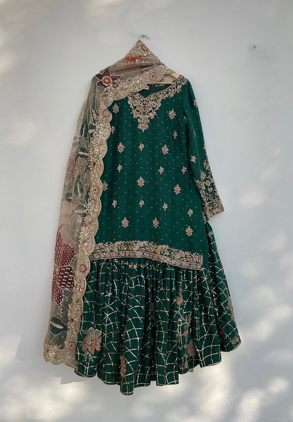 Transform your Nikkah celebration with Mehrbano, an exceptional three-piece bridal collection rendered in luxurious raw silk. This curated ensemble features a precisely embellished shirt paired with a coordinating gharara, both displaying masterful handwork that honors traditional textile craftsmanship. The accompanying hand-painted bridal dupatta serves as a distinctive finishing element, seamlessly merging contemporary aesthetics with time-honored design principles. Whether worn by the bride or a distinguished guest, this collection delivers refined elegance and ensures a memorable presence