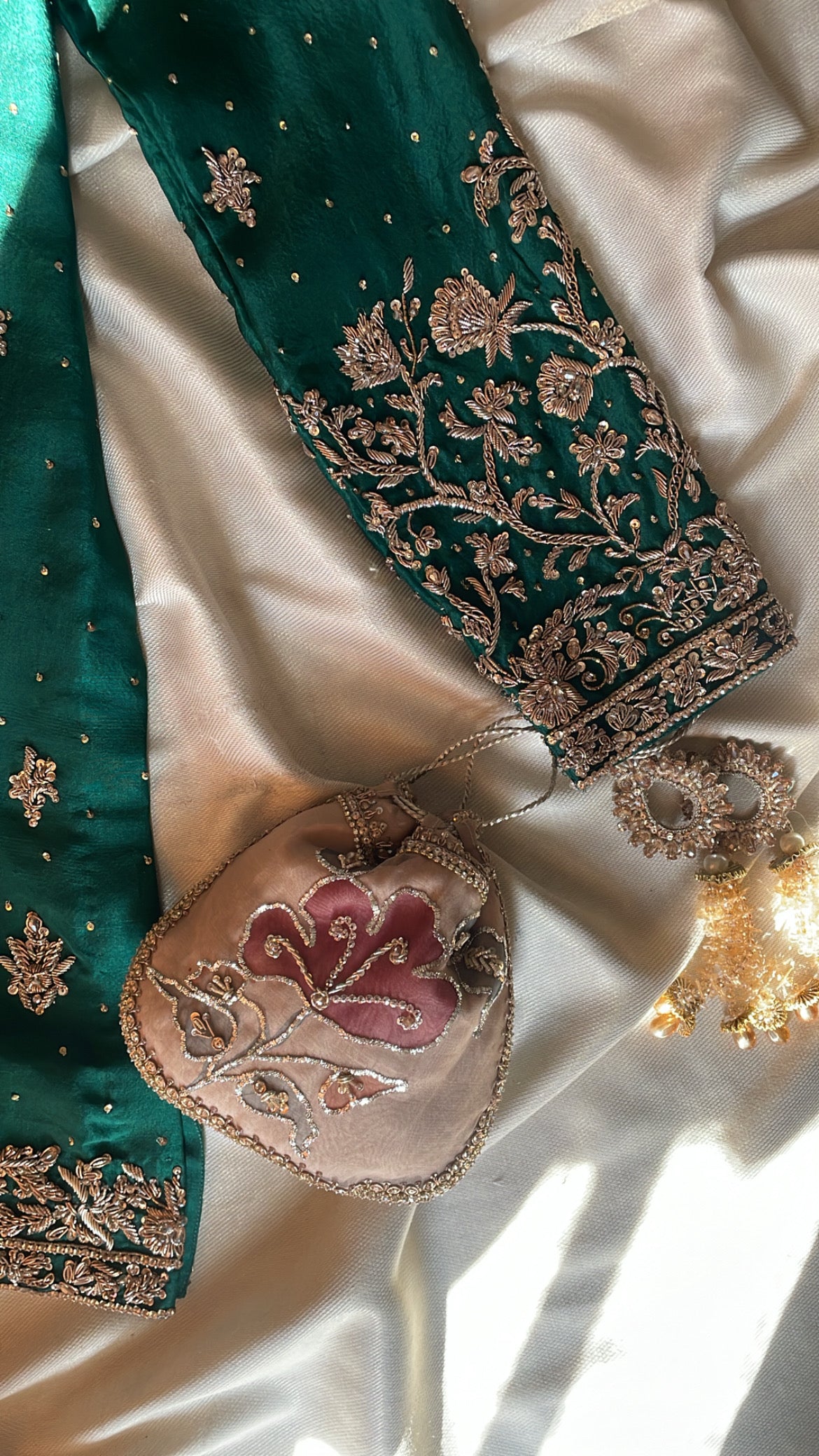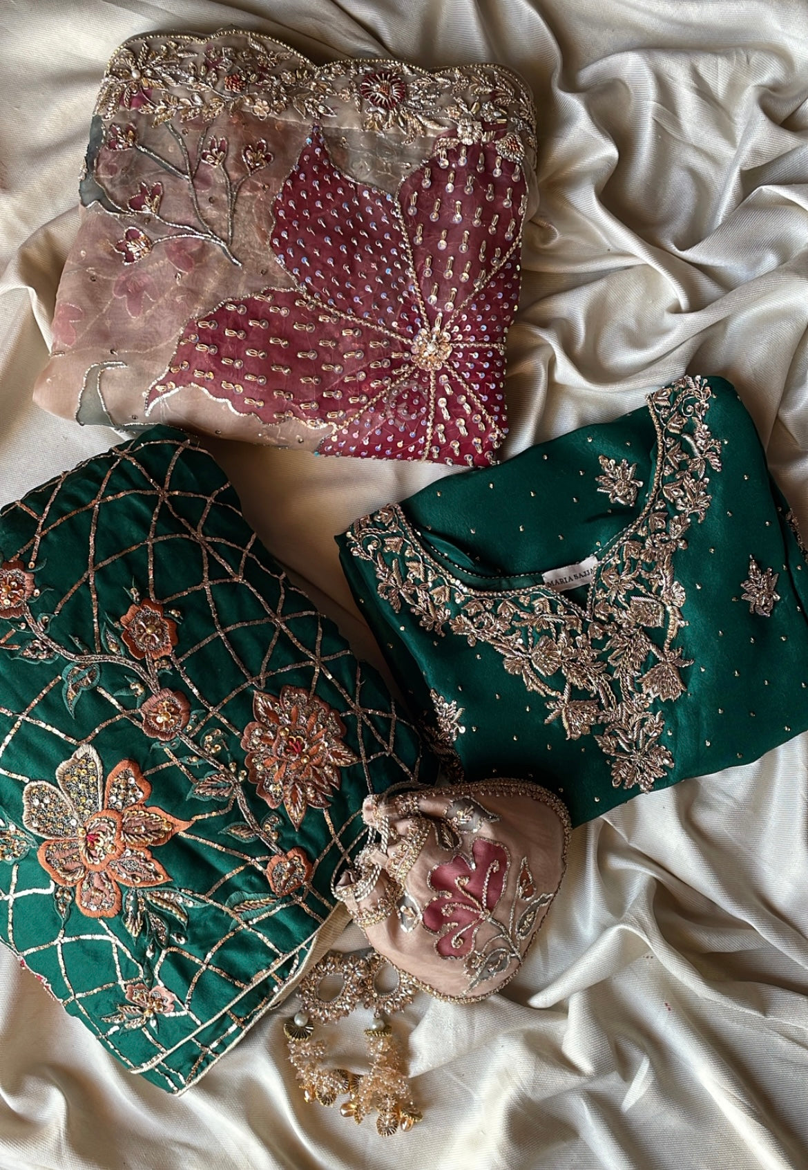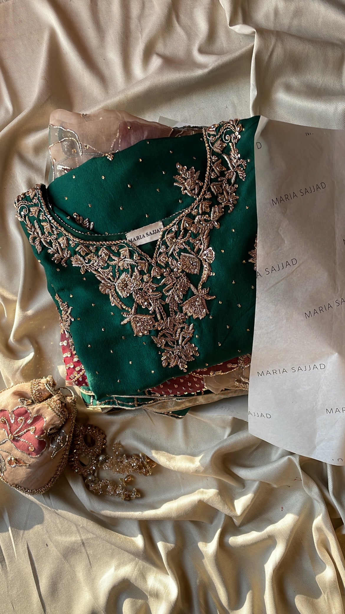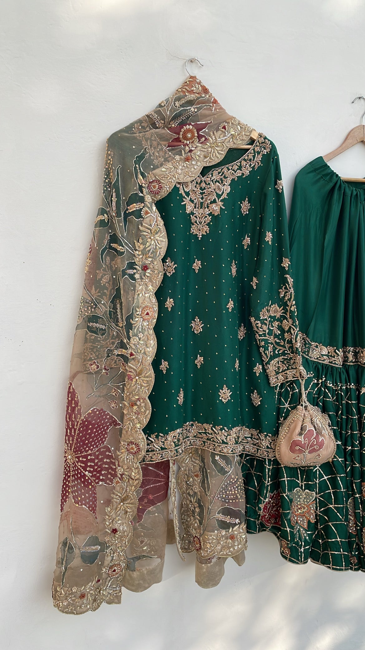 Transform your Nikkah celebration with Mehrbano, an exceptional three-piece bridal collection rendered in luxurious raw silk. This curated ensemble features a precisely embellished shirt paired with a coordinating gharara, both displaying masterful handwork that honors traditional textile craftsmanship. The accompanying hand-painted bridal dupatta serves as a distinctive finishing element, seamlessly merging contemporary aesthetics with time-honored design principles. Whether worn by the bride or a distinguished guest, this collection delivers refined elegance and ensures a memorable presence