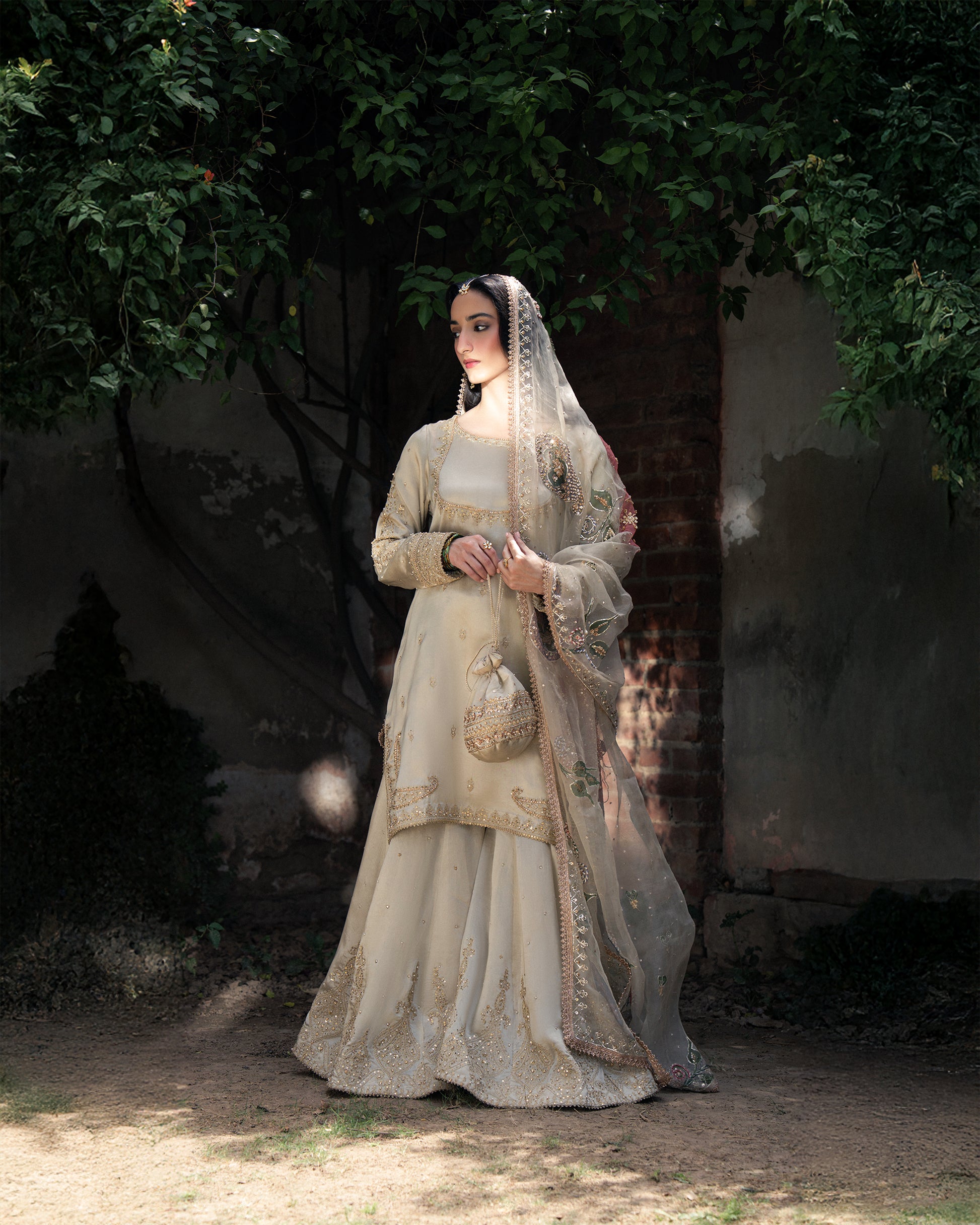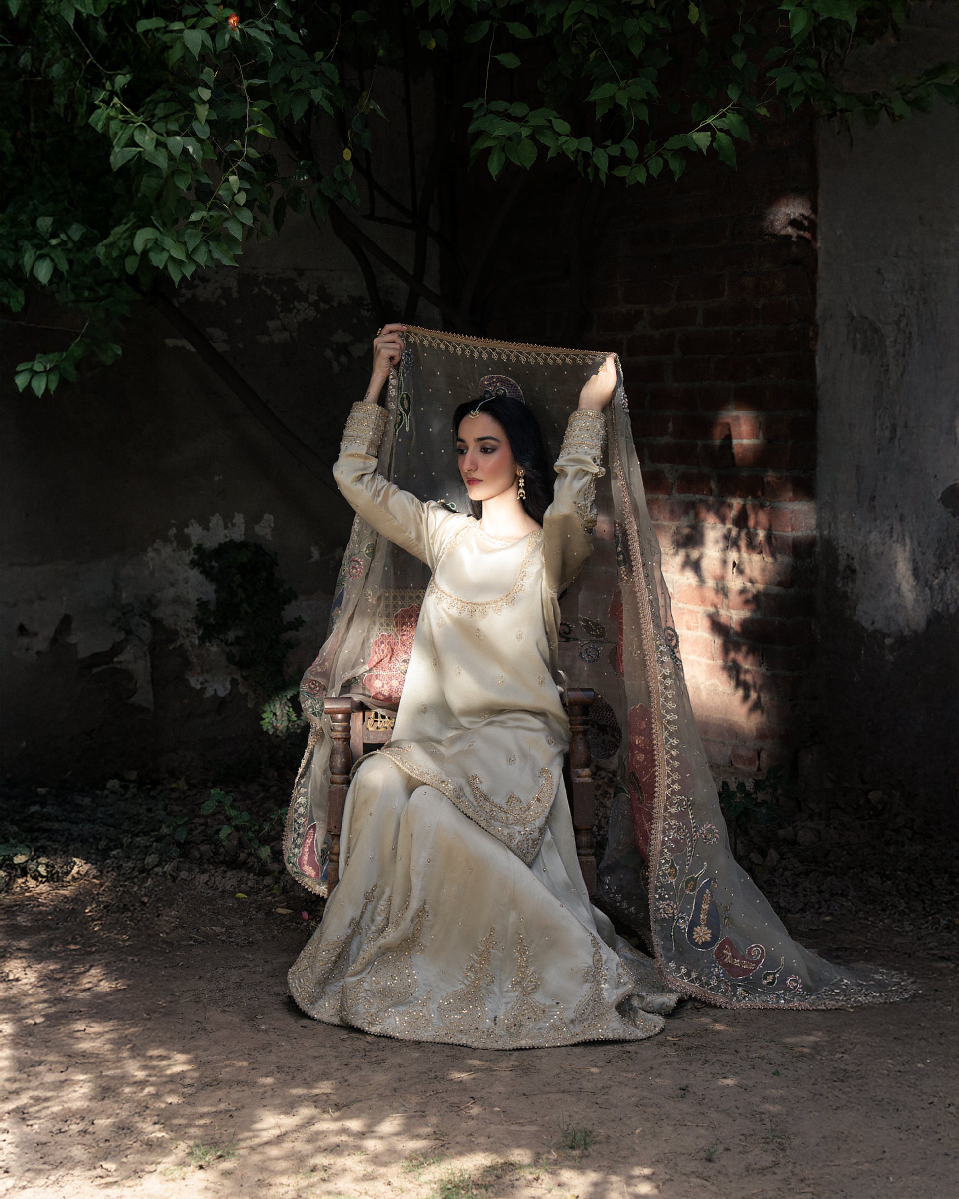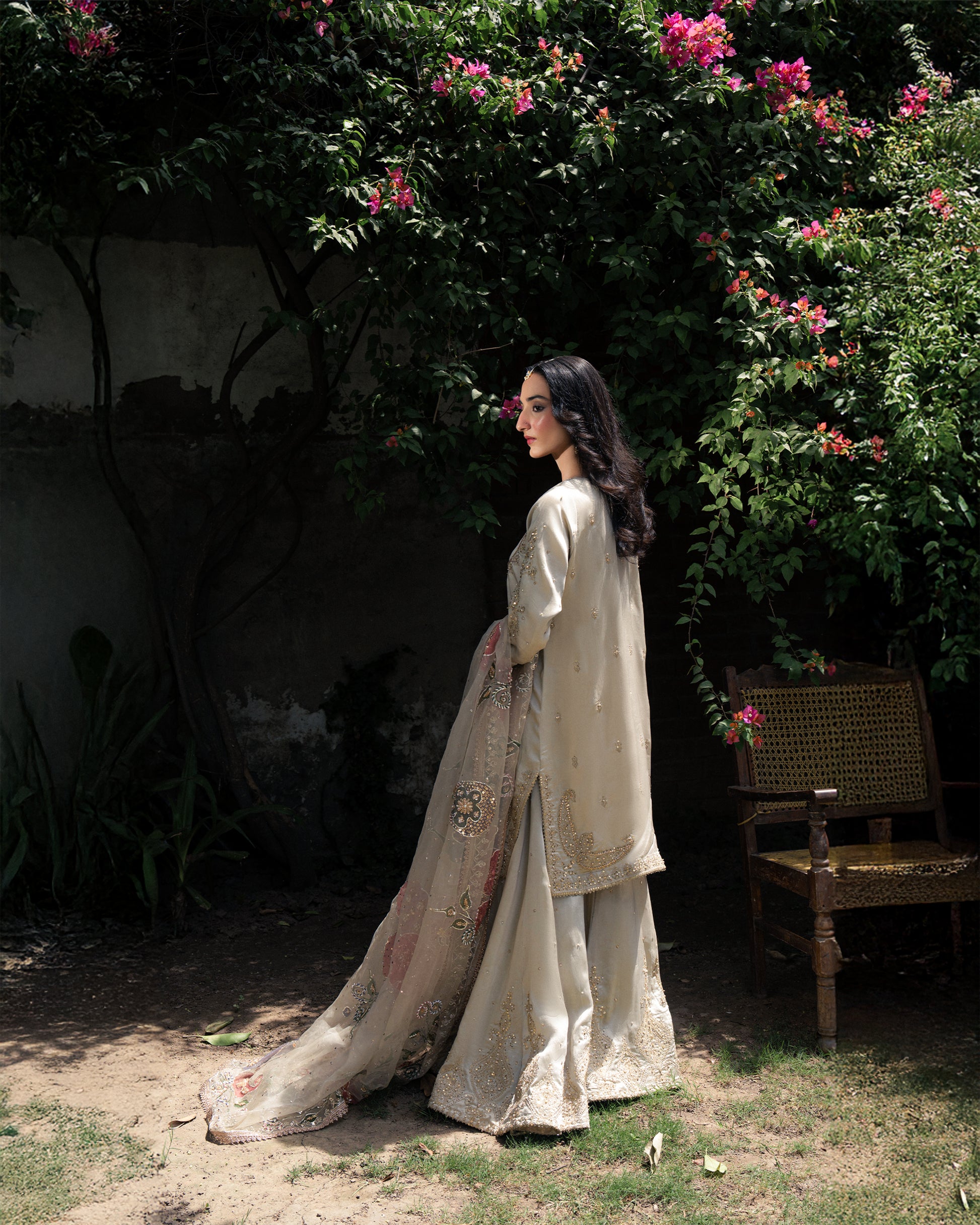 Embrace timeless sophistication with Mein Aur Tum, a meticulously crafted three-piece festive ensemble tailored for life's most memorable moments. This distinguished collection unites a hand-painted pure organza dupatta with a refined tassel silk-embellished shirt and coordinating tassel silk sharara, each element selected to reflect refined taste and exceptional artistry. Designed for weddings, engagements, and celebratory occasions, this stitched outfit delivers the polished elegance and luxurious finishes that define contemporary traditional wear.