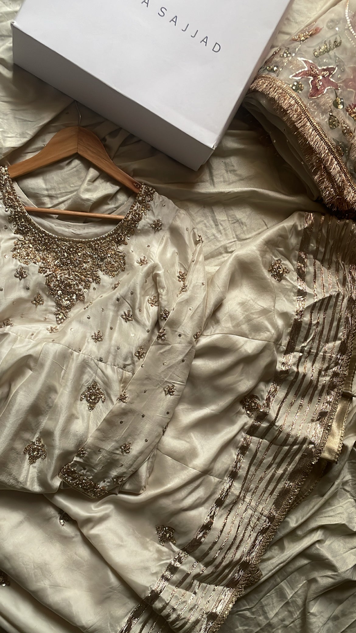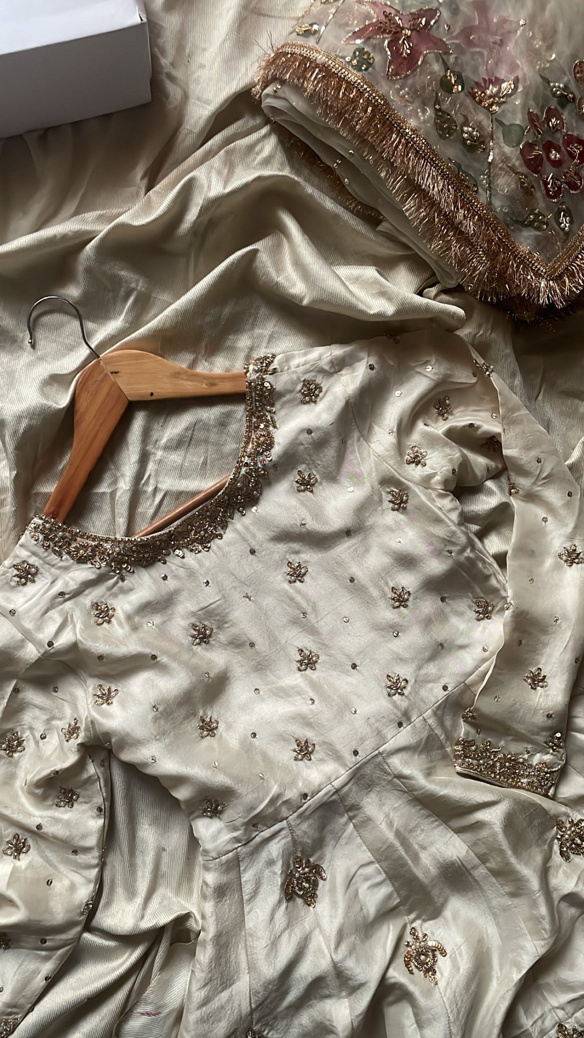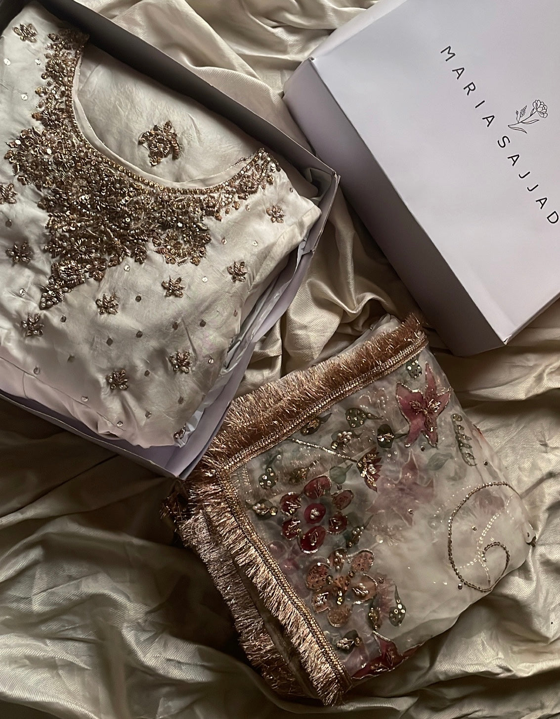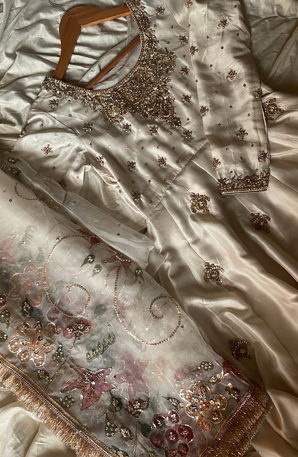 Experience timeless sophistication with our Nargis festive collection a distinguished three-piece ensemble curated for life's most significant moments. This thoughtfully assembled set pairs a hand-painted pure organza dupatta with an ornately embellished raw silk peshwas, each component reflecting superior artisanal skill and luxurious materials. Ideal for weddings, engagements, and festive occasions, this ensemble delivers the refined aesthetic and premium textures that embody grace and enduring elegance.