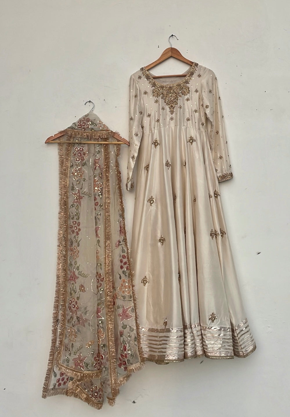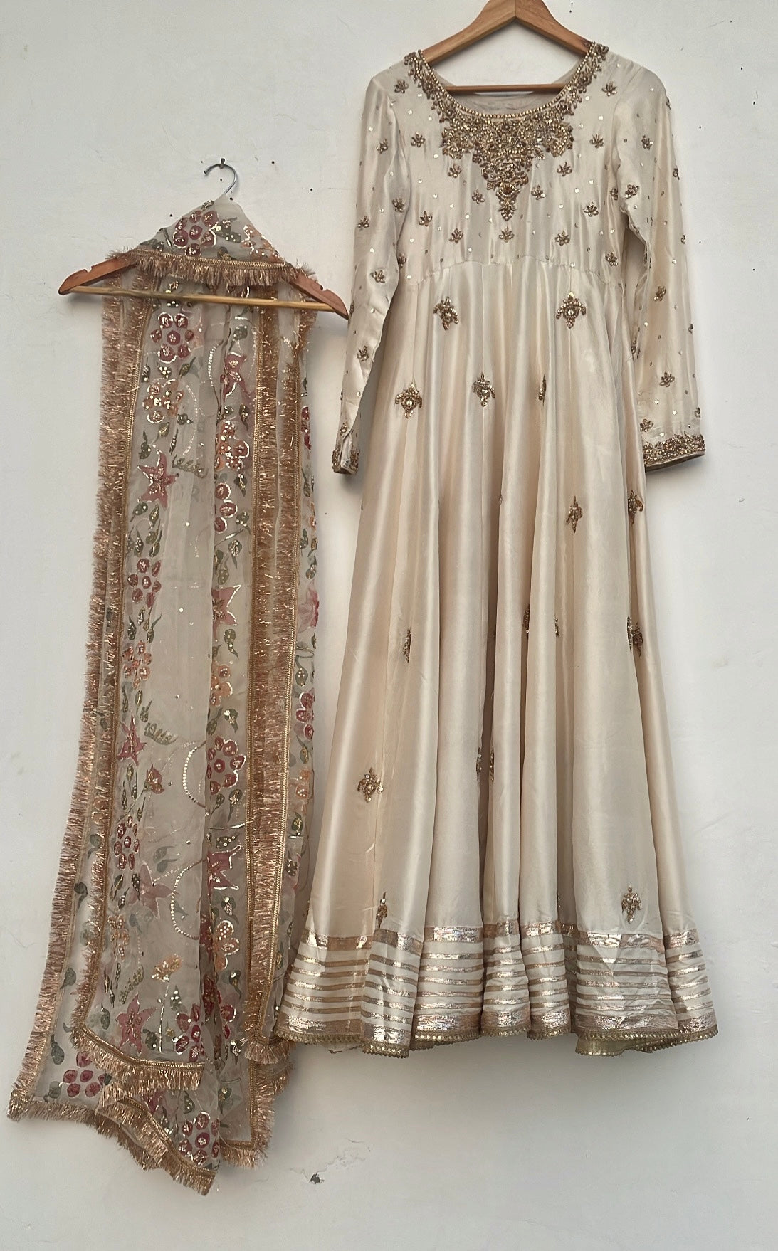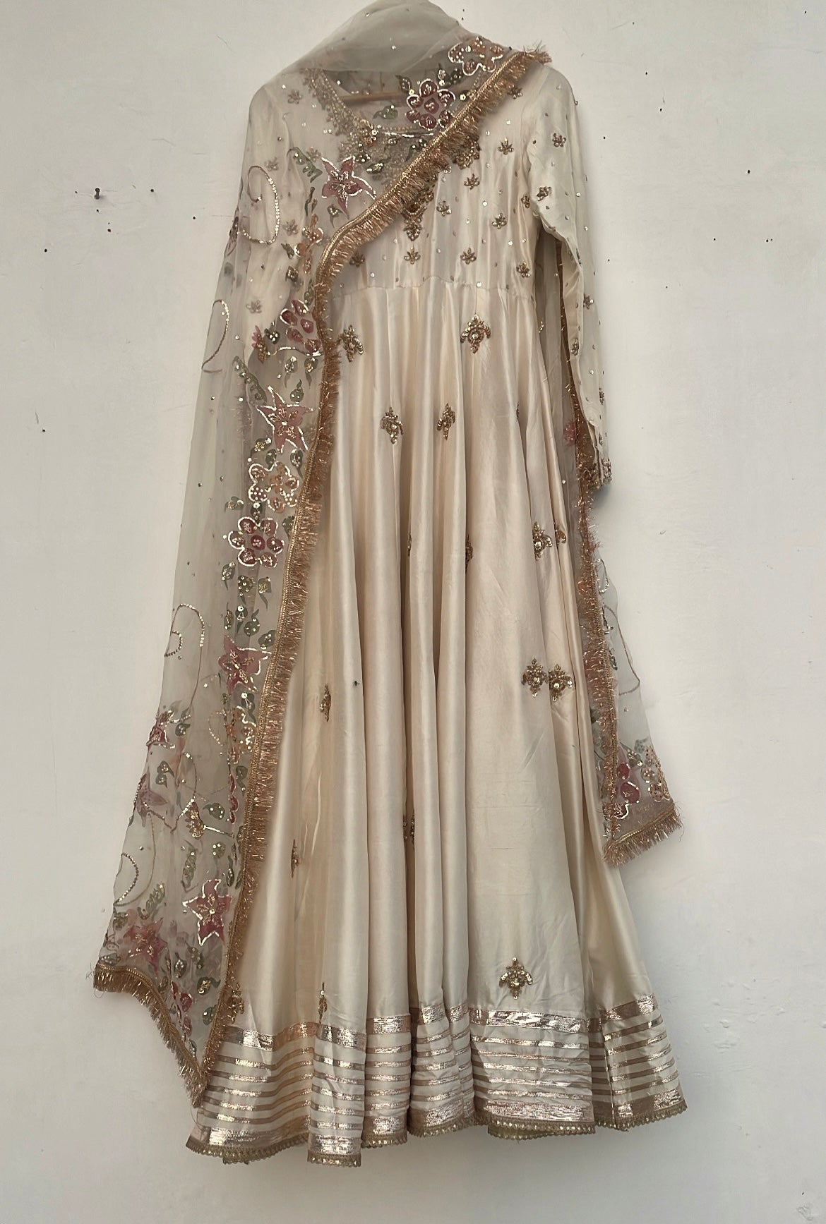 Experience timeless sophistication with our Nargis festive collection a distinguished three-piece ensemble curated for life's most significant moments. This thoughtfully assembled set pairs a hand-painted pure organza dupatta with an ornately embellished raw silk peshwas, each component reflecting superior artisanal skill and luxurious materials. Ideal for weddings, engagements, and festive occasions, this ensemble delivers the refined aesthetic and premium textures that embody grace and enduring elegance.