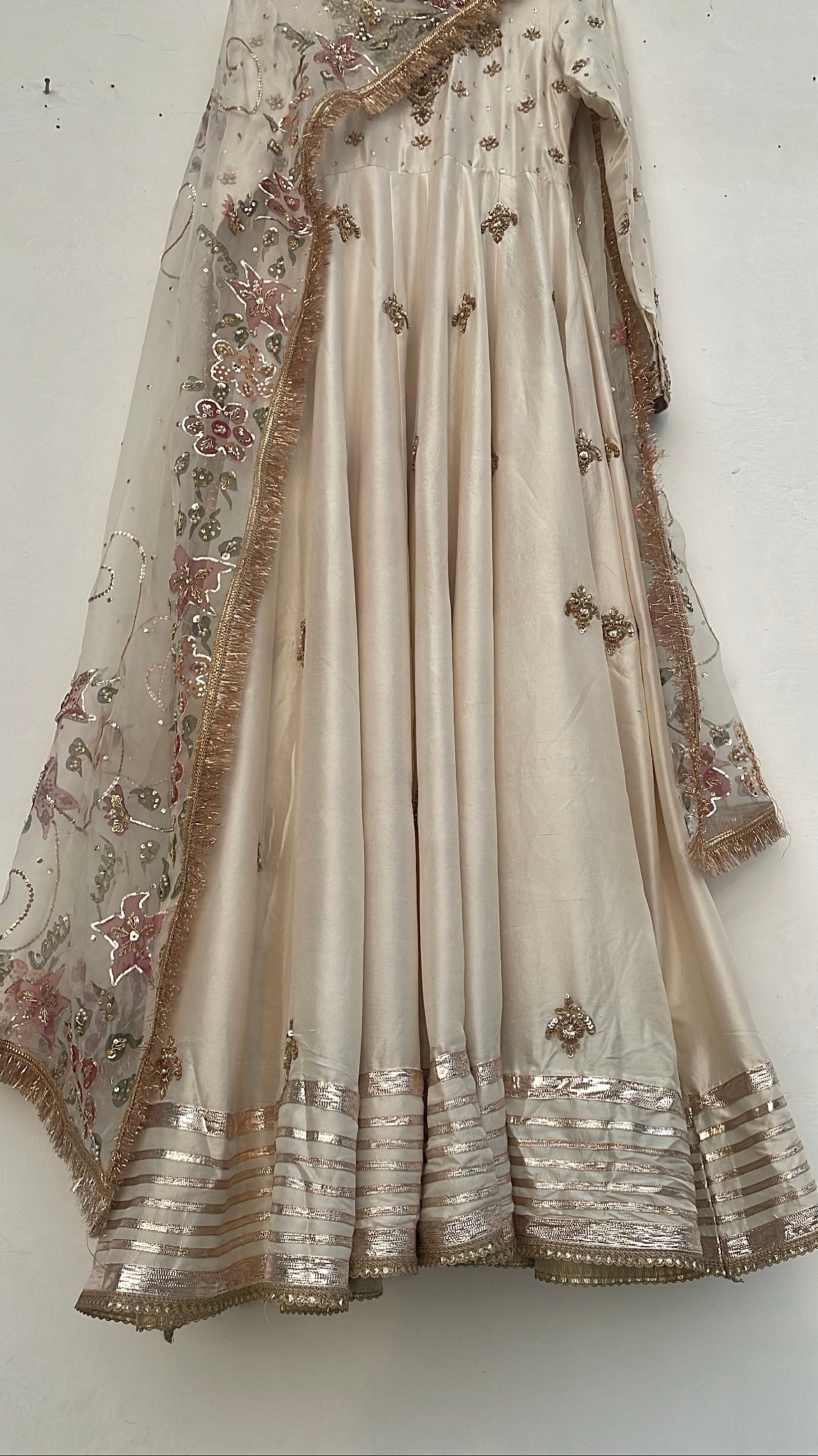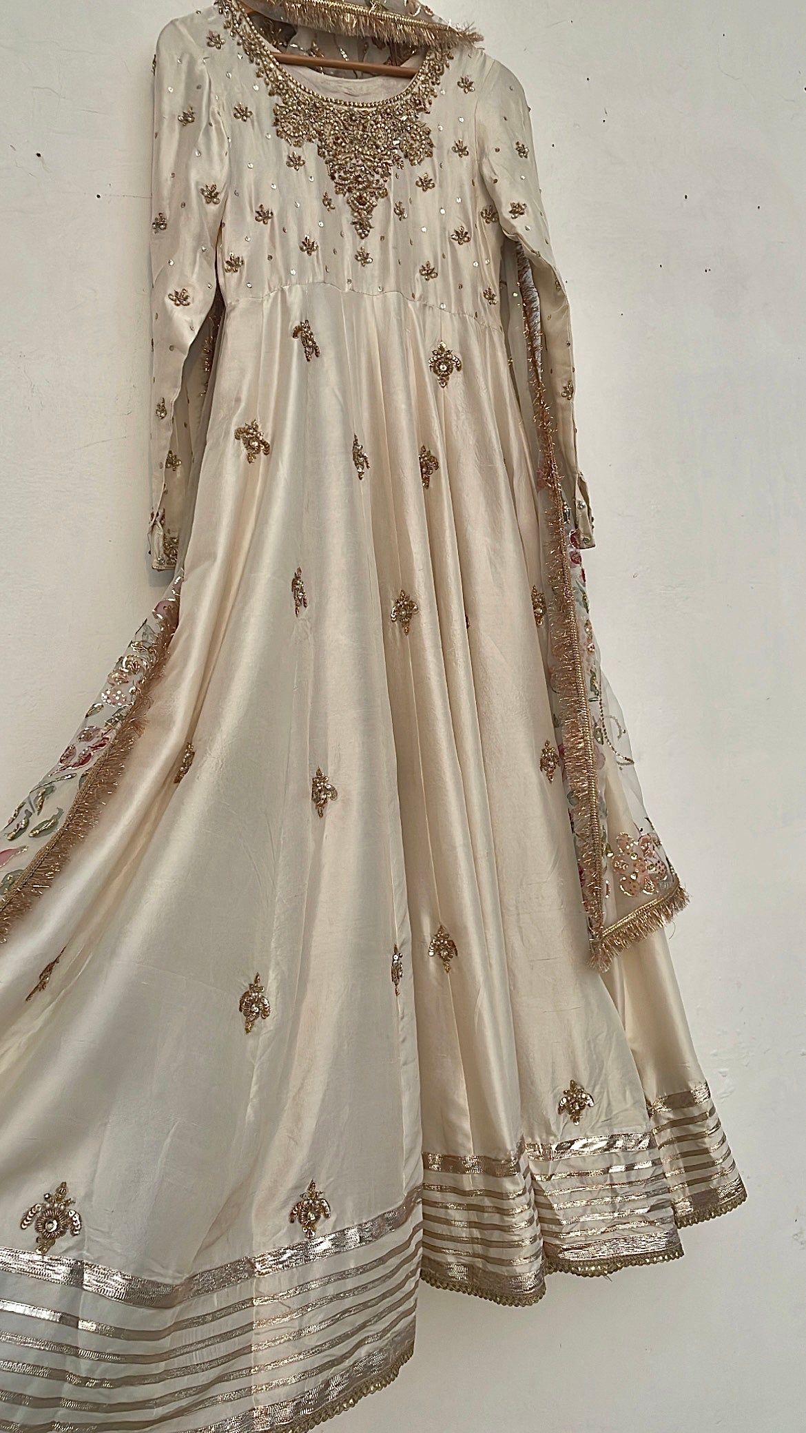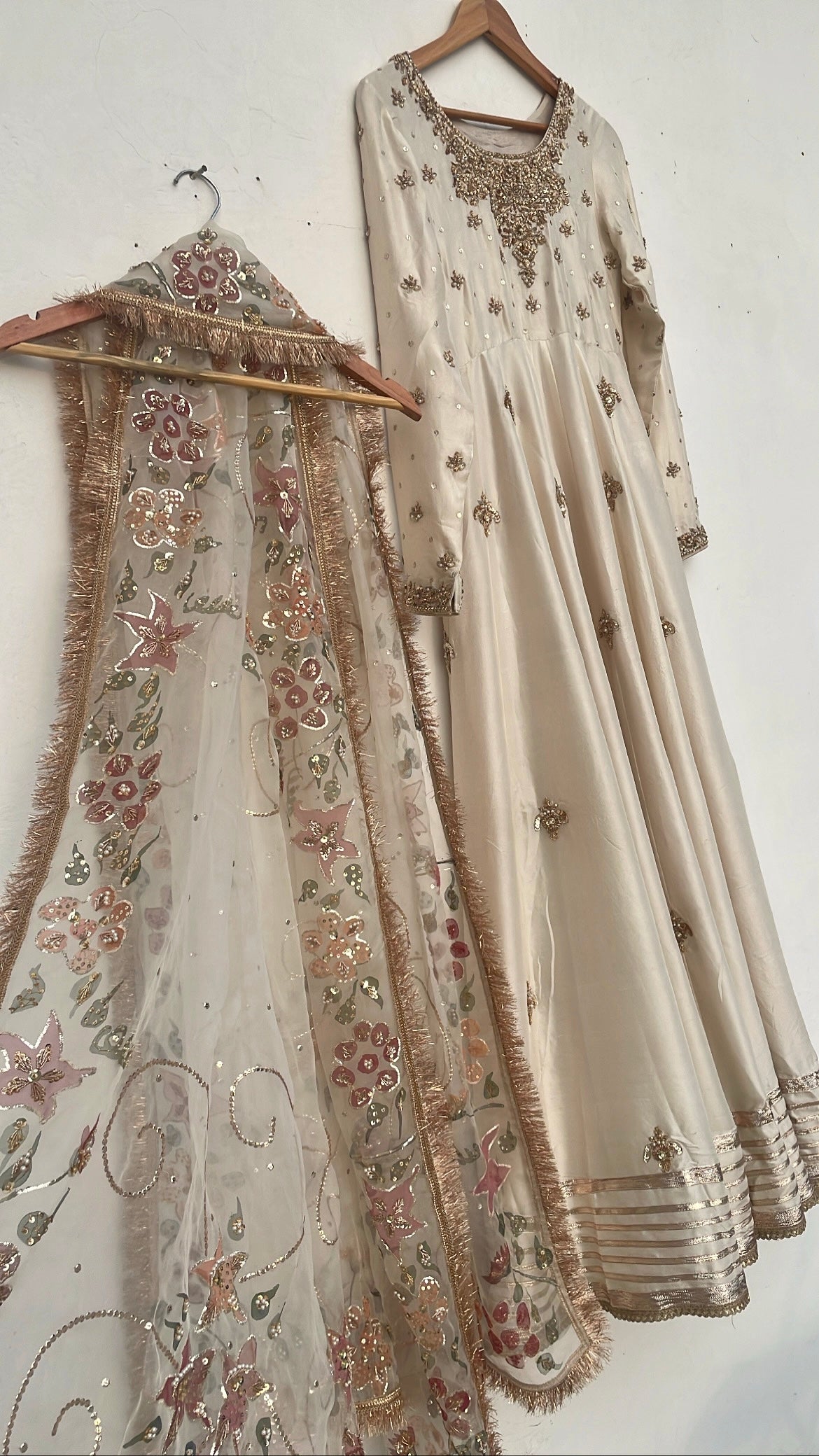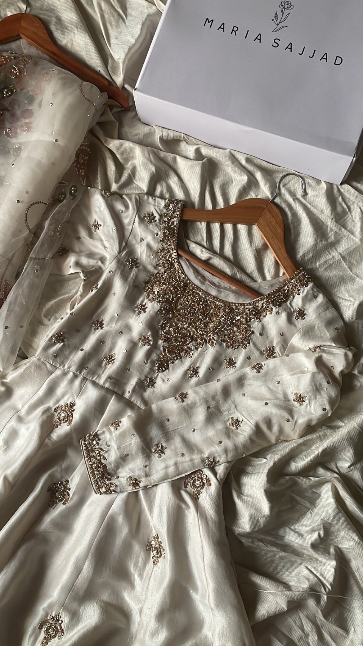 Experience timeless sophistication with our Nargis festive collection a distinguished three-piece ensemble curated for life's most significant moments. This thoughtfully assembled set pairs a hand-painted pure organza dupatta with an ornately embellished raw silk peshwas, each component reflecting superior artisanal skill and luxurious materials. Ideal for weddings, engagements, and festive occasions, this ensemble delivers the refined aesthetic and premium textures that embody grace and enduring elegance.
