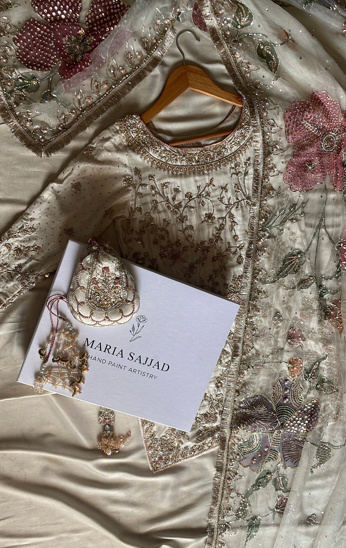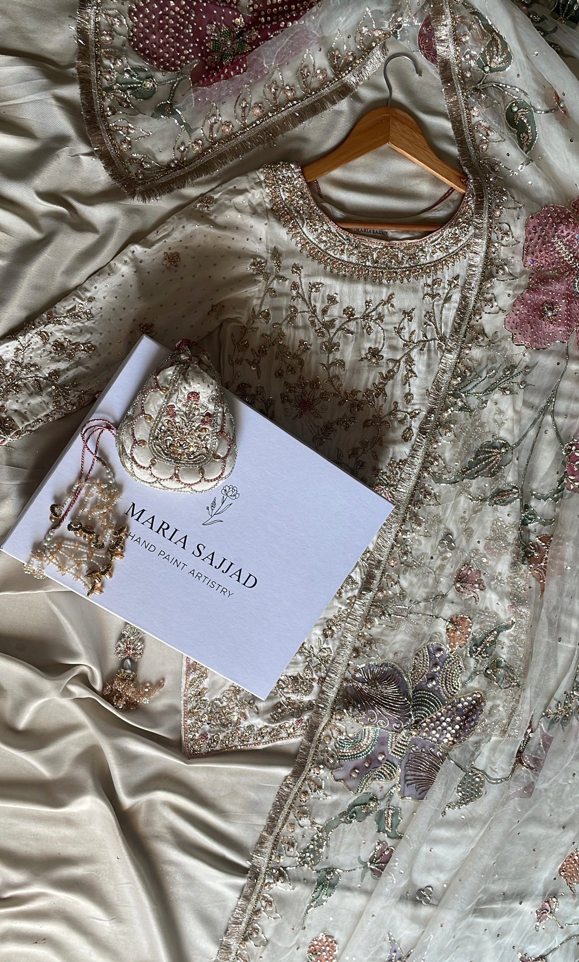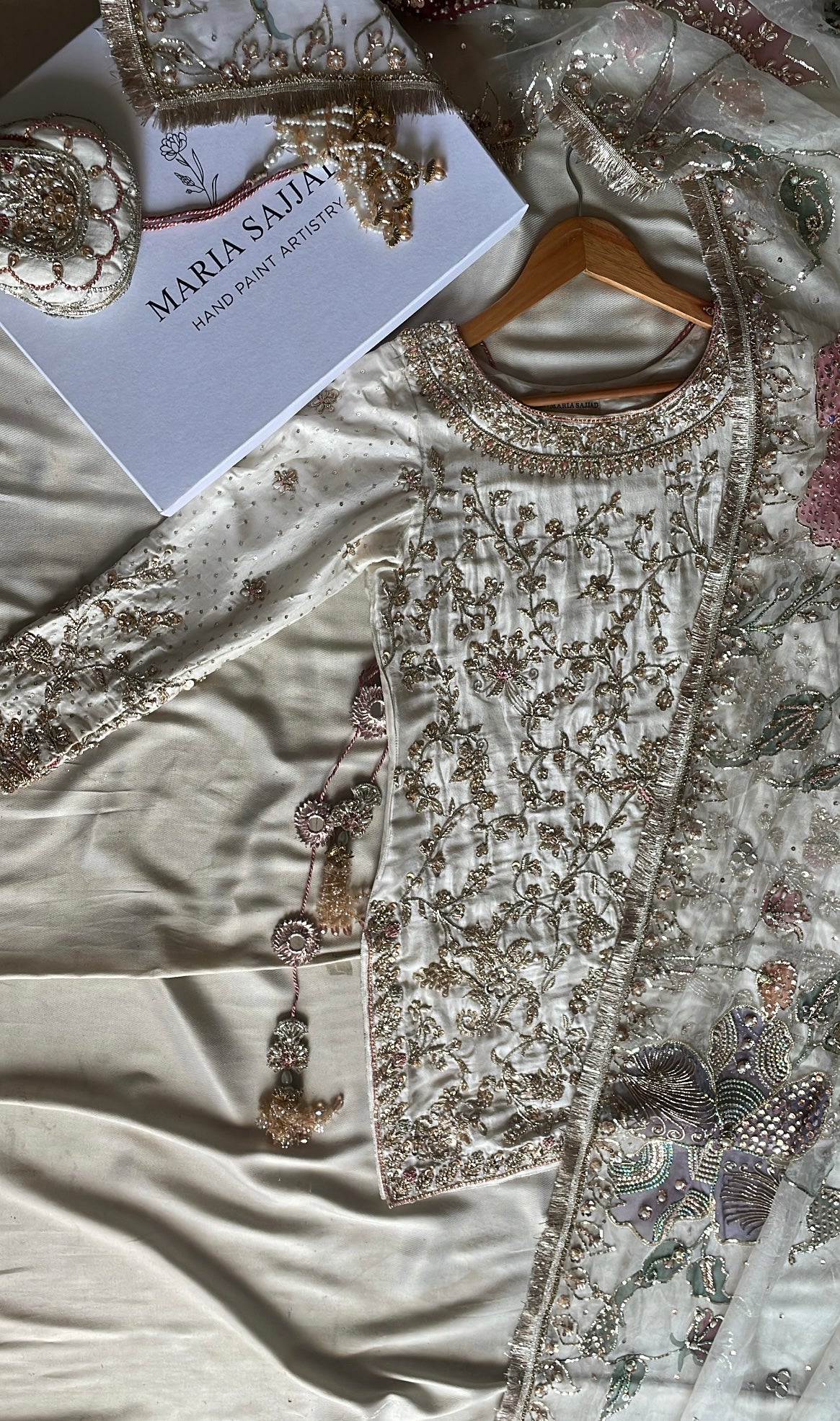 Transform your Nikkah celebration with the Nazneen ensemble, a masterpiece that seamlessly blends traditional craftsmanship with contemporary elegance. Constructed from premium pure raw silk, this collection features meticulously hand-embellished sharara and shirt that deliver understated luminosity while maintaining sophisticated proportions. The accompanying handpainted dupatta serves as an artistic statement piece, infusing individuality and romantic sensibility into your bridal presentation. The pristine ivory palette embodies ceremonial purity and refined aesthetics, making it an ideal choice for brides and wedding guests alike. This collection represents the pinnacle of heritage tailoring elevated through modern design sensibilities.