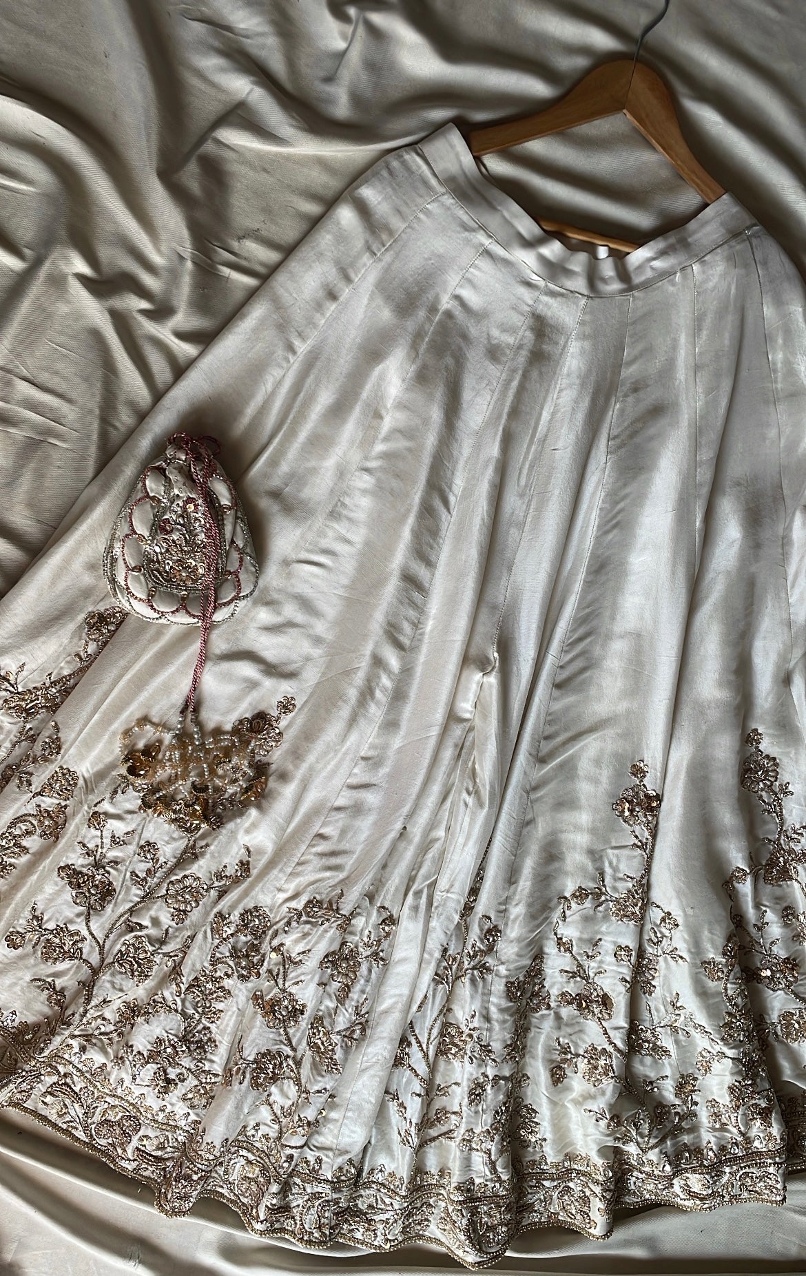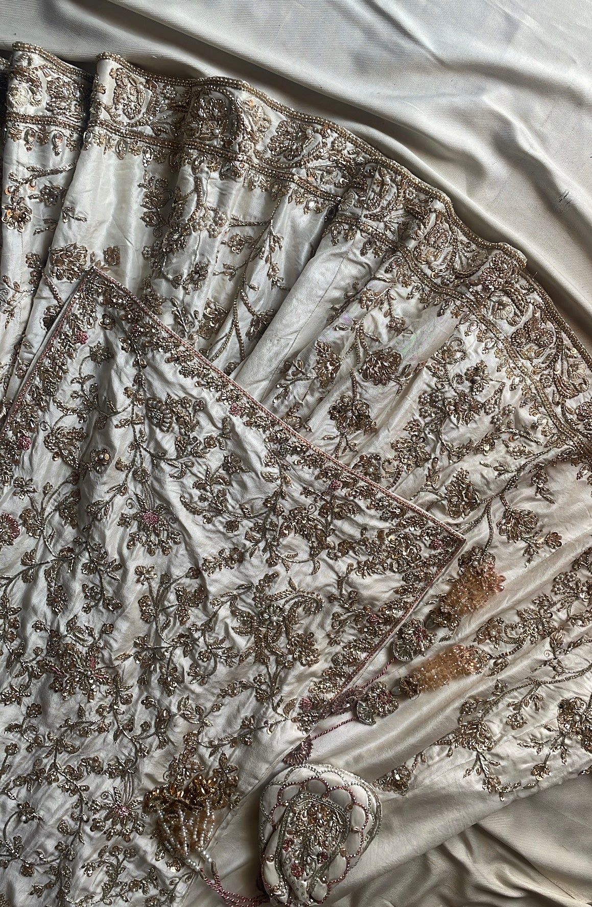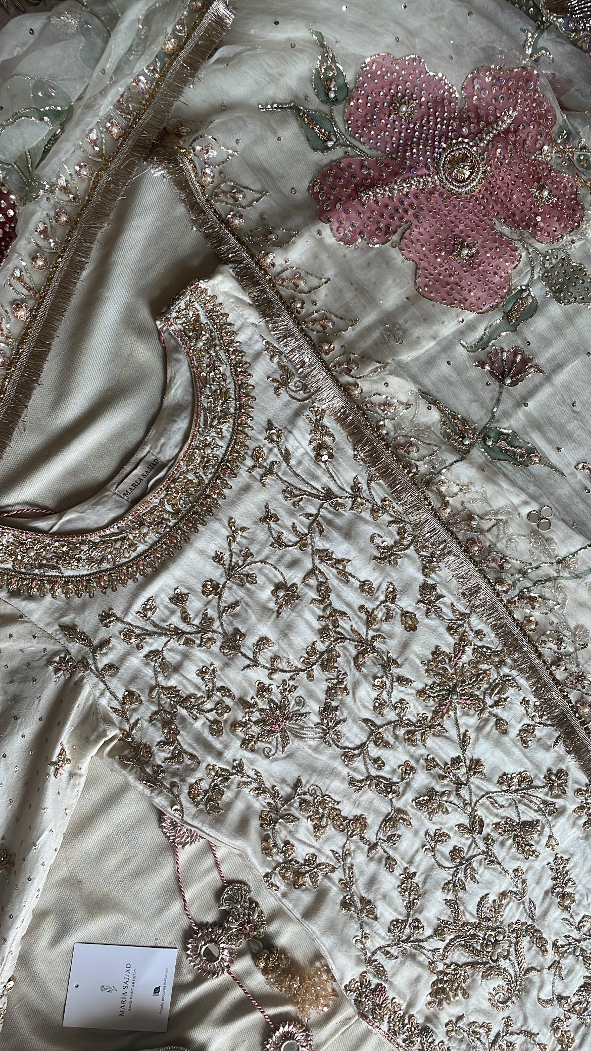 Transform your Nikkah celebration with the Nazneen ensemble, a masterpiece that seamlessly blends traditional craftsmanship with contemporary elegance. Constructed from premium pure raw silk, this collection features meticulously hand-embellished sharara and shirt that deliver understated luminosity while maintaining sophisticated proportions. The accompanying handpainted dupatta serves as an artistic statement piece, infusing individuality and romantic sensibility into your bridal presentation. The pristine ivory palette embodies ceremonial purity and refined aesthetics, making it an ideal choice for brides and wedding guests alike. This collection represents the pinnacle of heritage tailoring elevated through modern design sensibilities.
