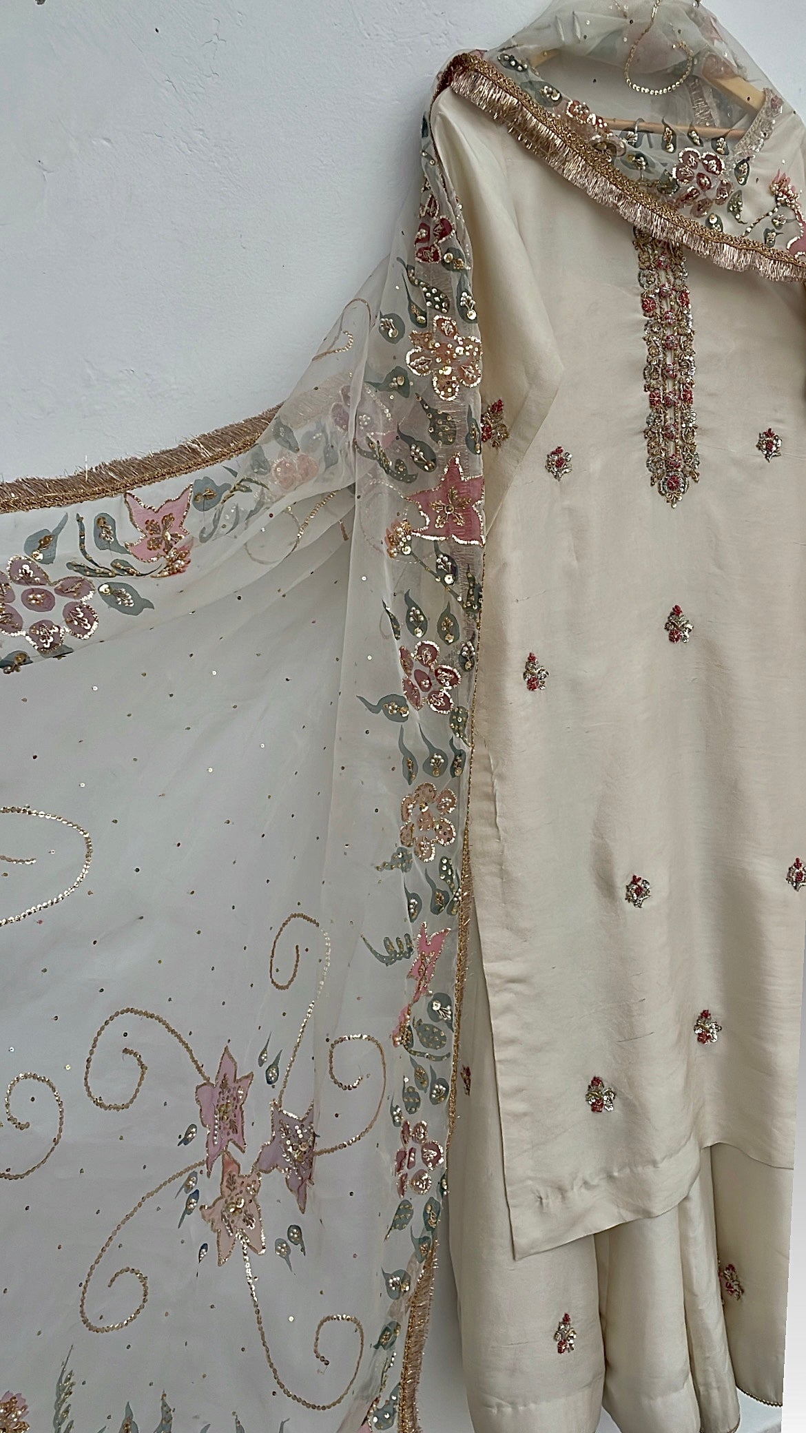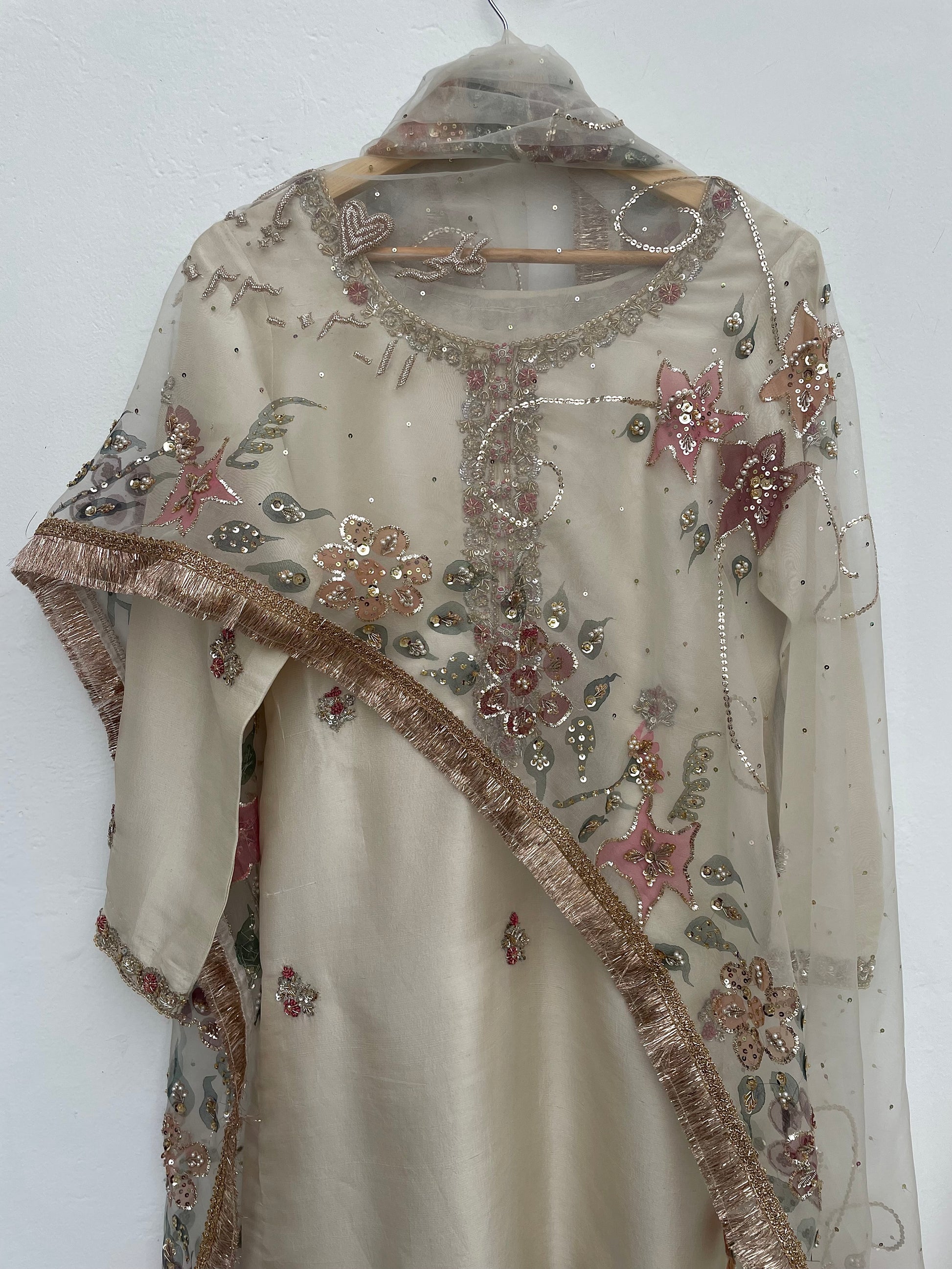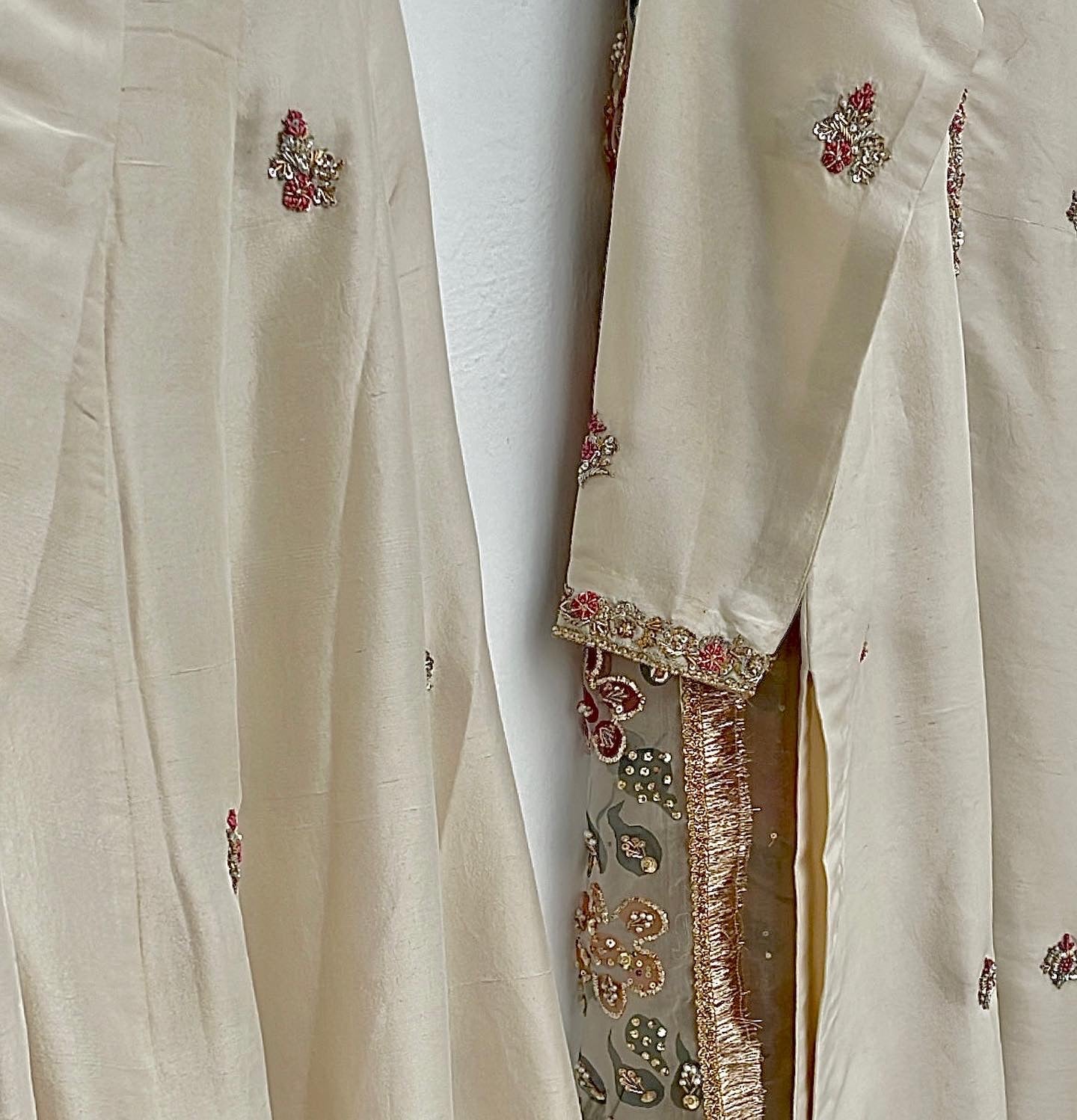 Experience refined elegance with our Nusrat festive collection—a distinguished three-piece ensemble crafted for your most memorable occasions. This thoughtfully assembled set pairs a hand-painted pure organza dupatta with an ornately embellished raw silk shirt and coordinating embellished raw silk sharara, each component demonstrating exceptional artisanal skill. Designed for weddings, engagements, and festive celebrations, this ensemble combines luxurious materials with meticulous detailing to create a look of understated sophistication and timeless grace.