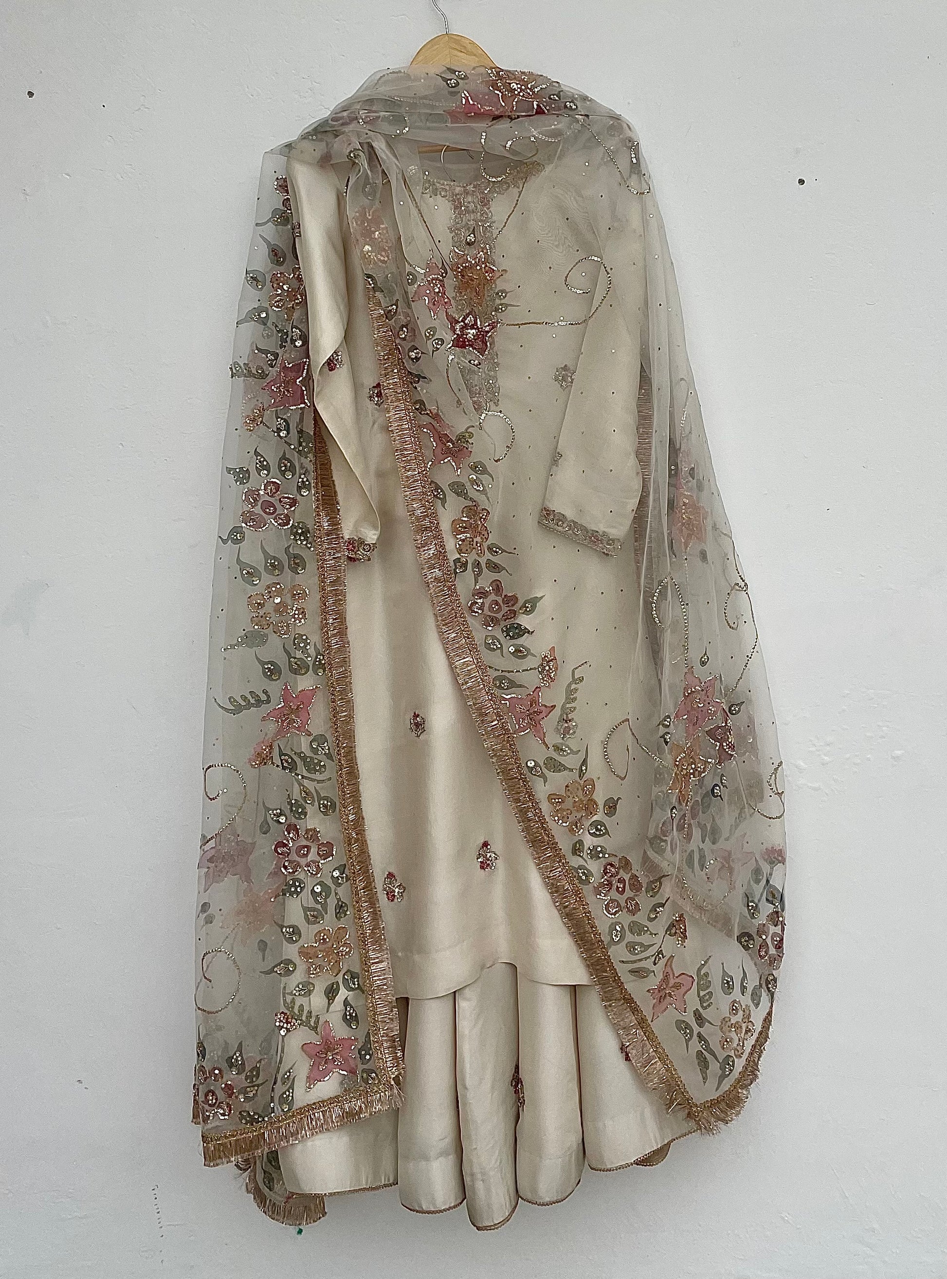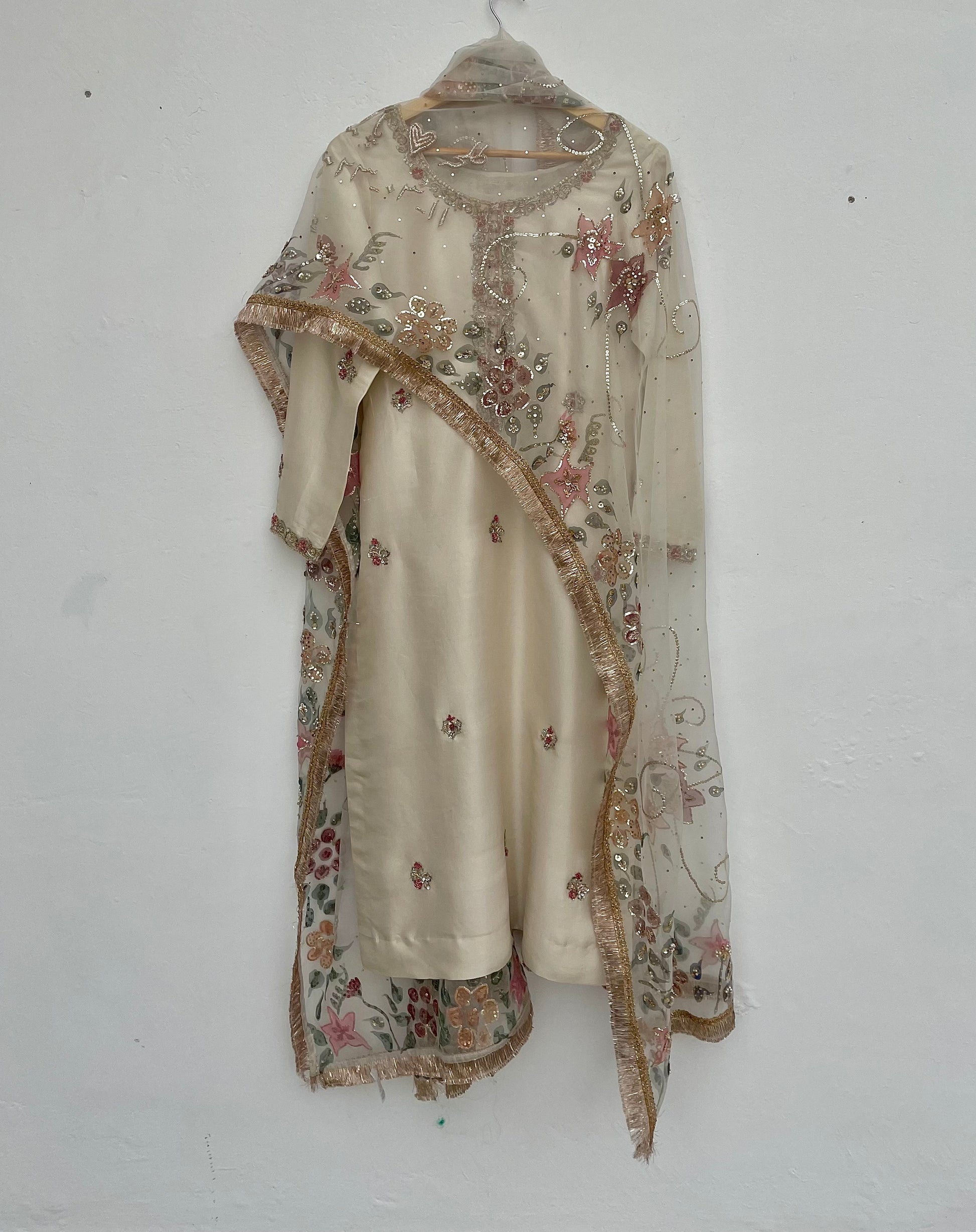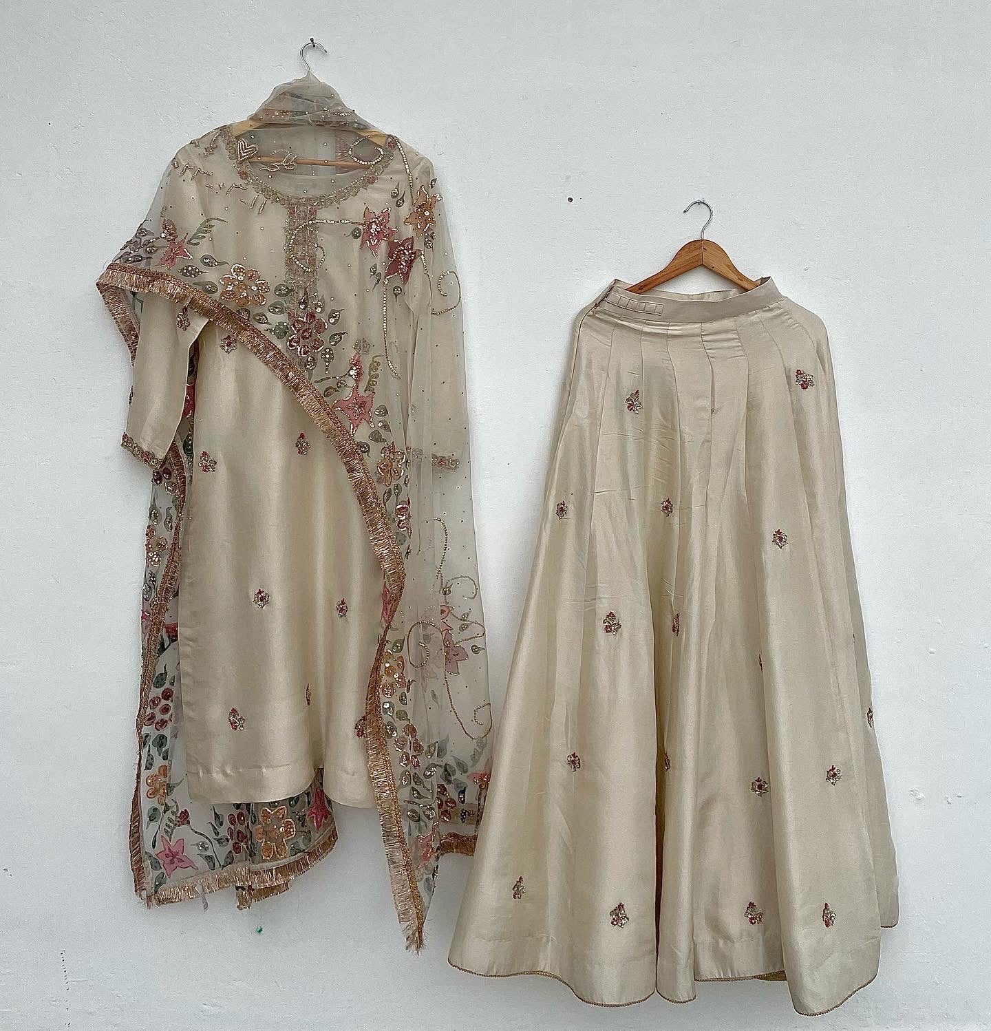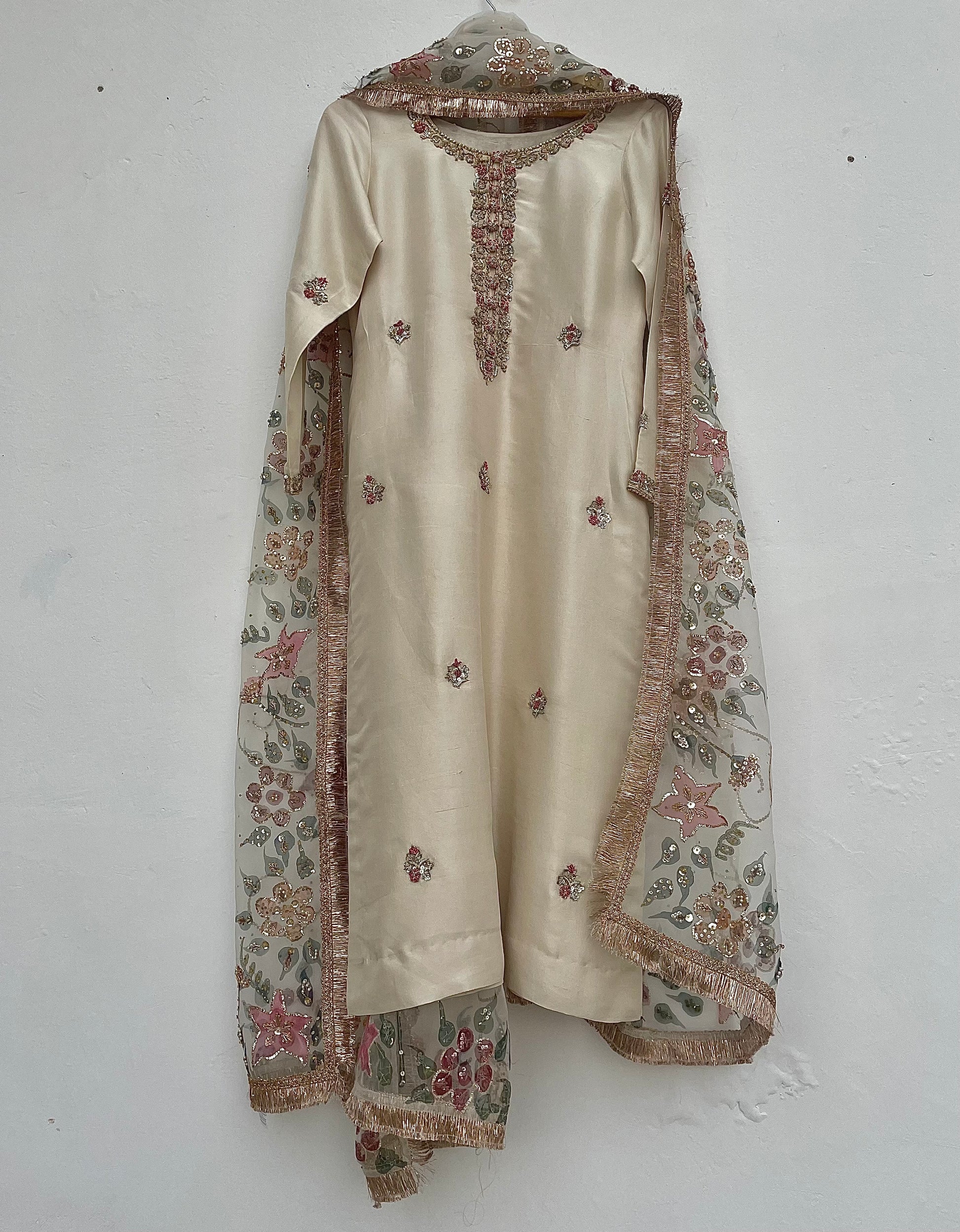 Experience refined elegance with our Nusrat festive collection—a distinguished three-piece ensemble crafted for your most memorable occasions. This thoughtfully assembled set pairs a hand-painted pure organza dupatta with an ornately embellished raw silk shirt and coordinating embellished raw silk sharara, each component demonstrating exceptional artisanal skill. Designed for weddings, engagements, and festive celebrations, this ensemble combines luxurious materials with meticulous detailing to create a look of understated sophistication and timeless grace.