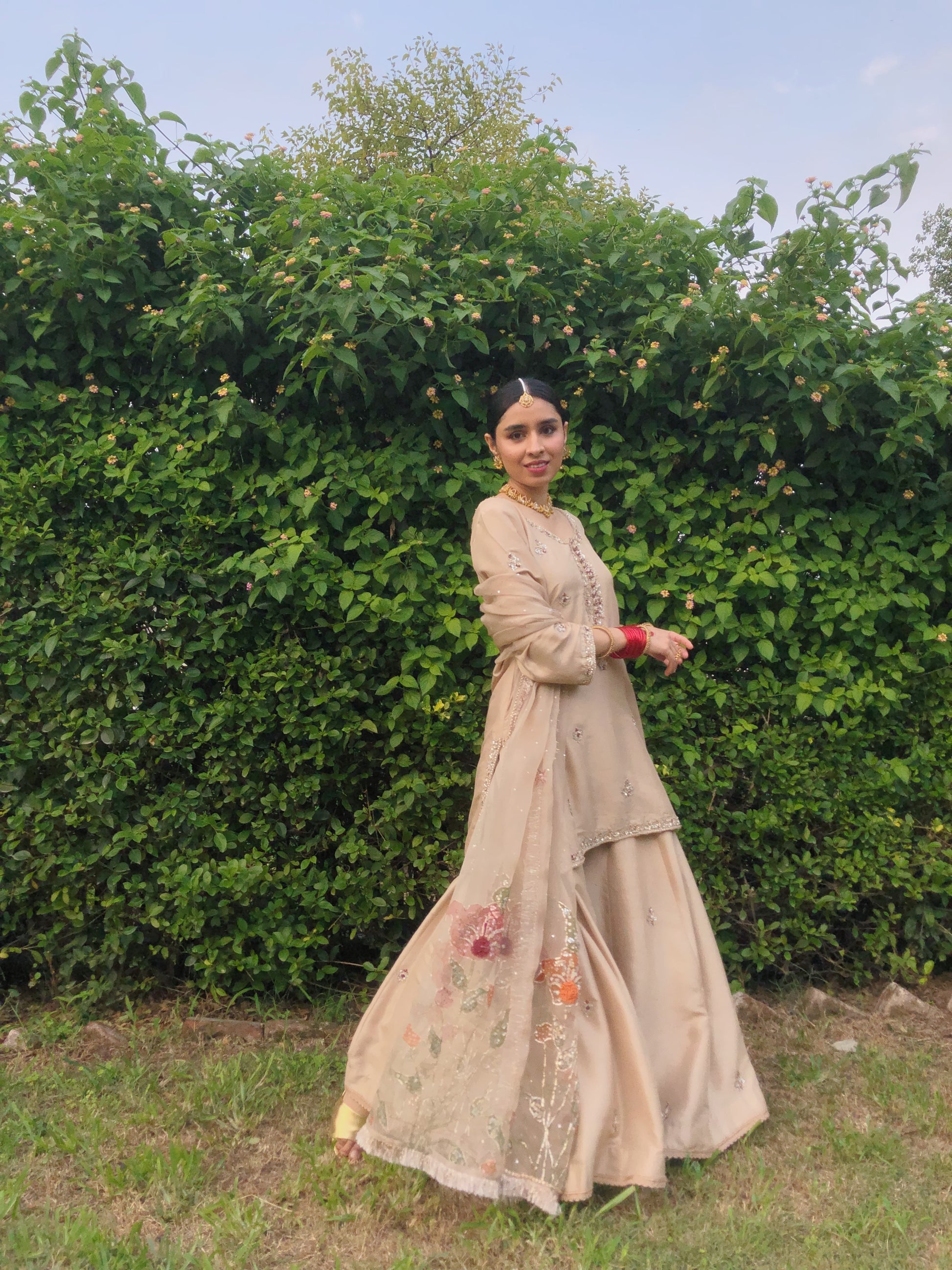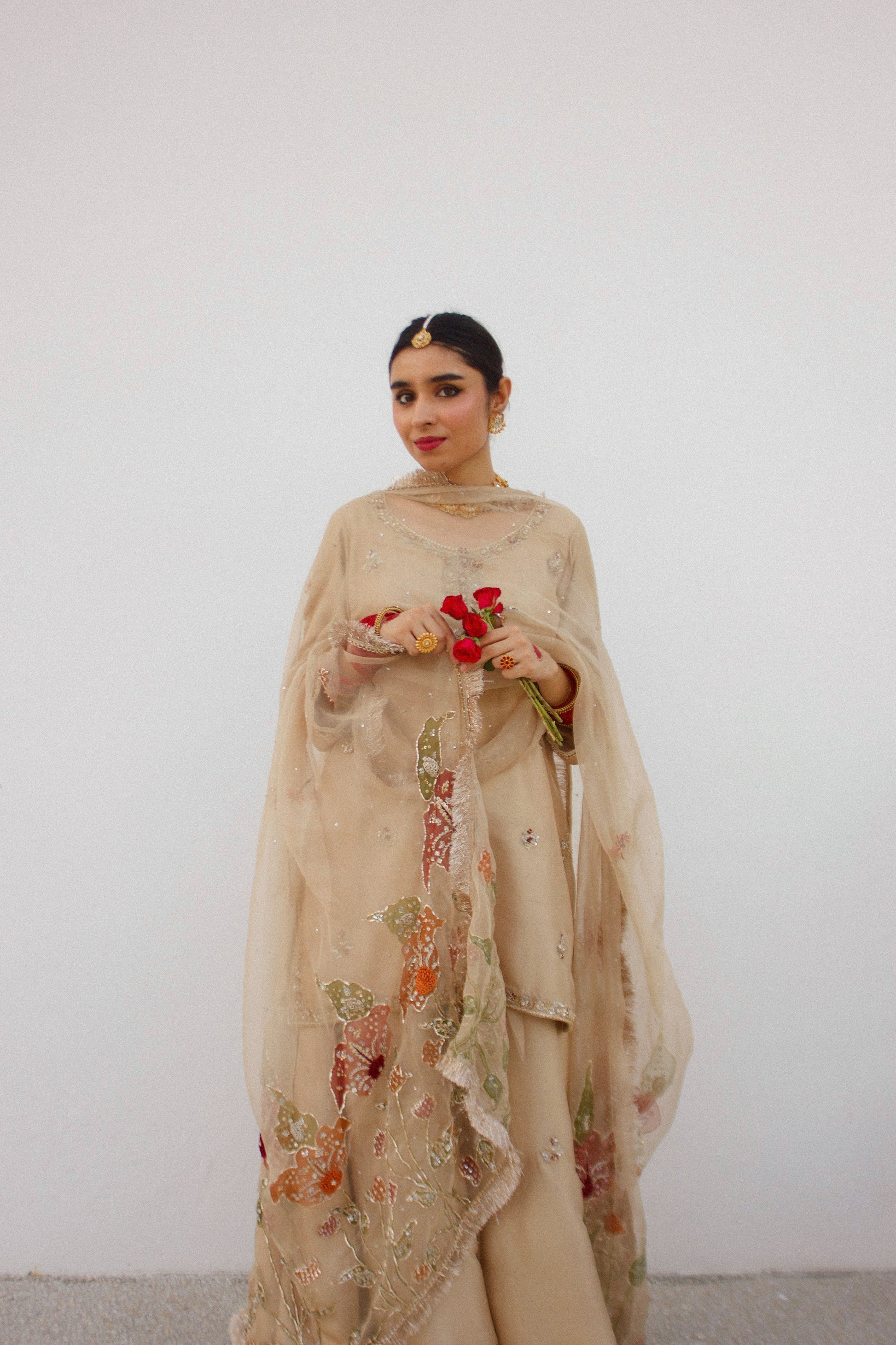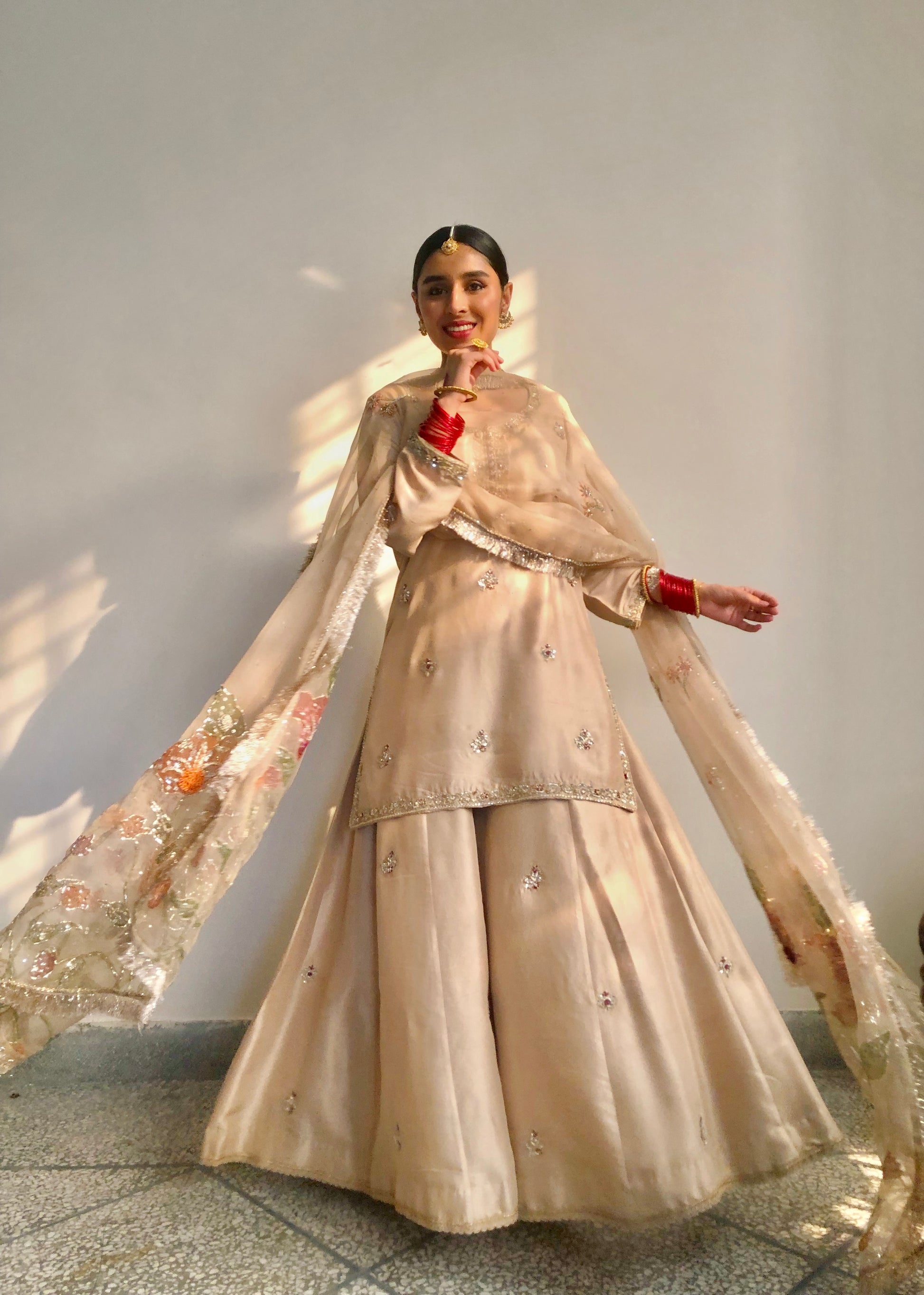Embrace refined elegance with our Rano festive collection—a sophisticated three-piece ensemble crafted for your most important celebrations. This distinguished set combines a hand-painted pure organza dupatta with an artfully embellished raw silk shirt and coordinating embellished raw silk sharara pants, each piece reflecting meticulous artisanal execution and premium quality. Designed for weddings, engagements, and festive occasions, this ensemble delivers the sumptuous materials and intricate detailing that create an unforgettable impression of grace and timeless sophistication.