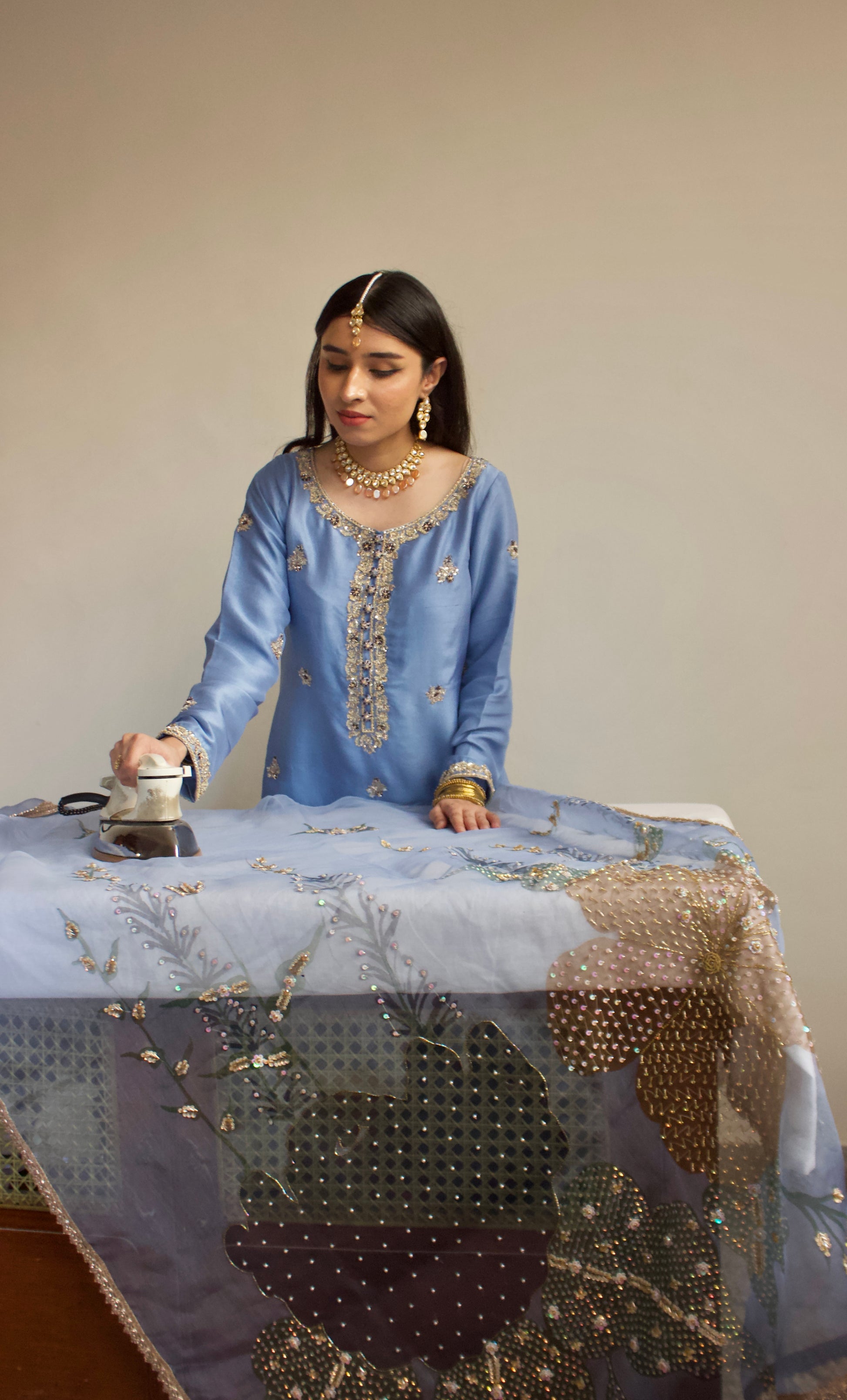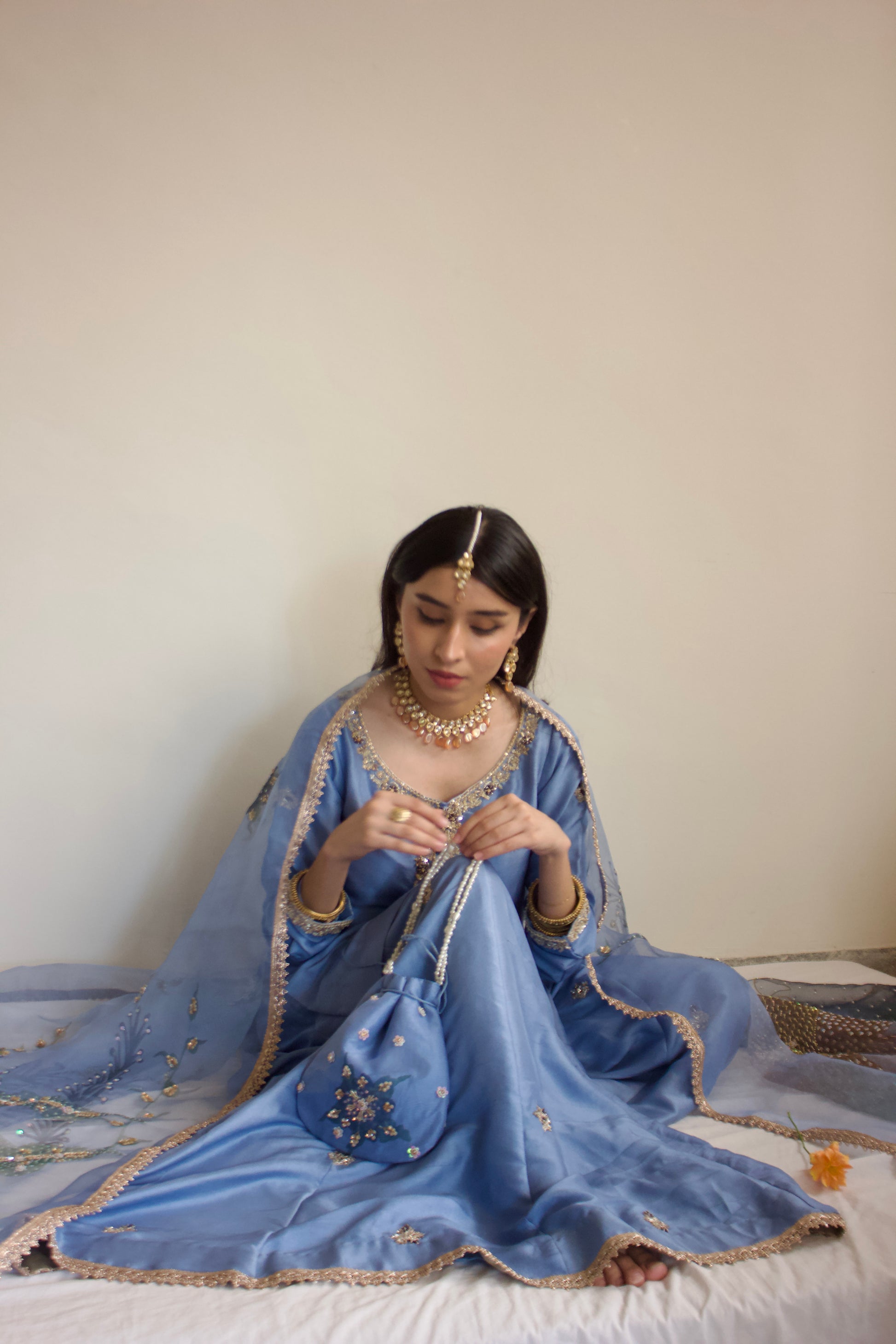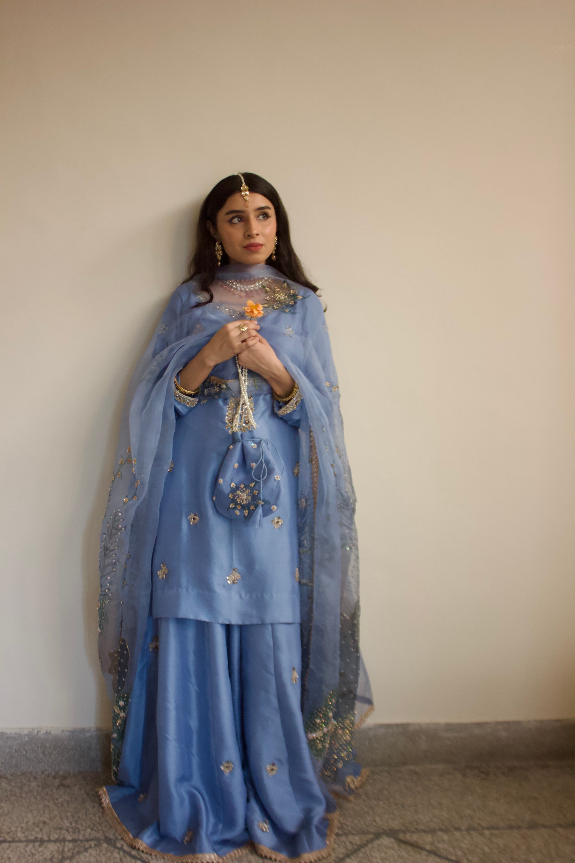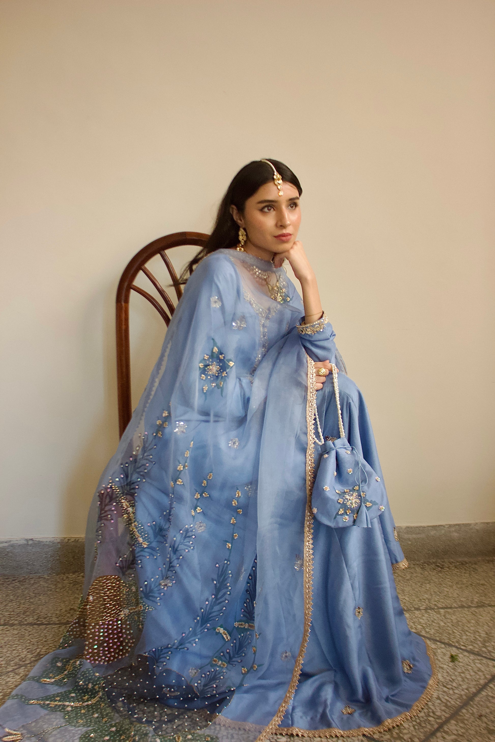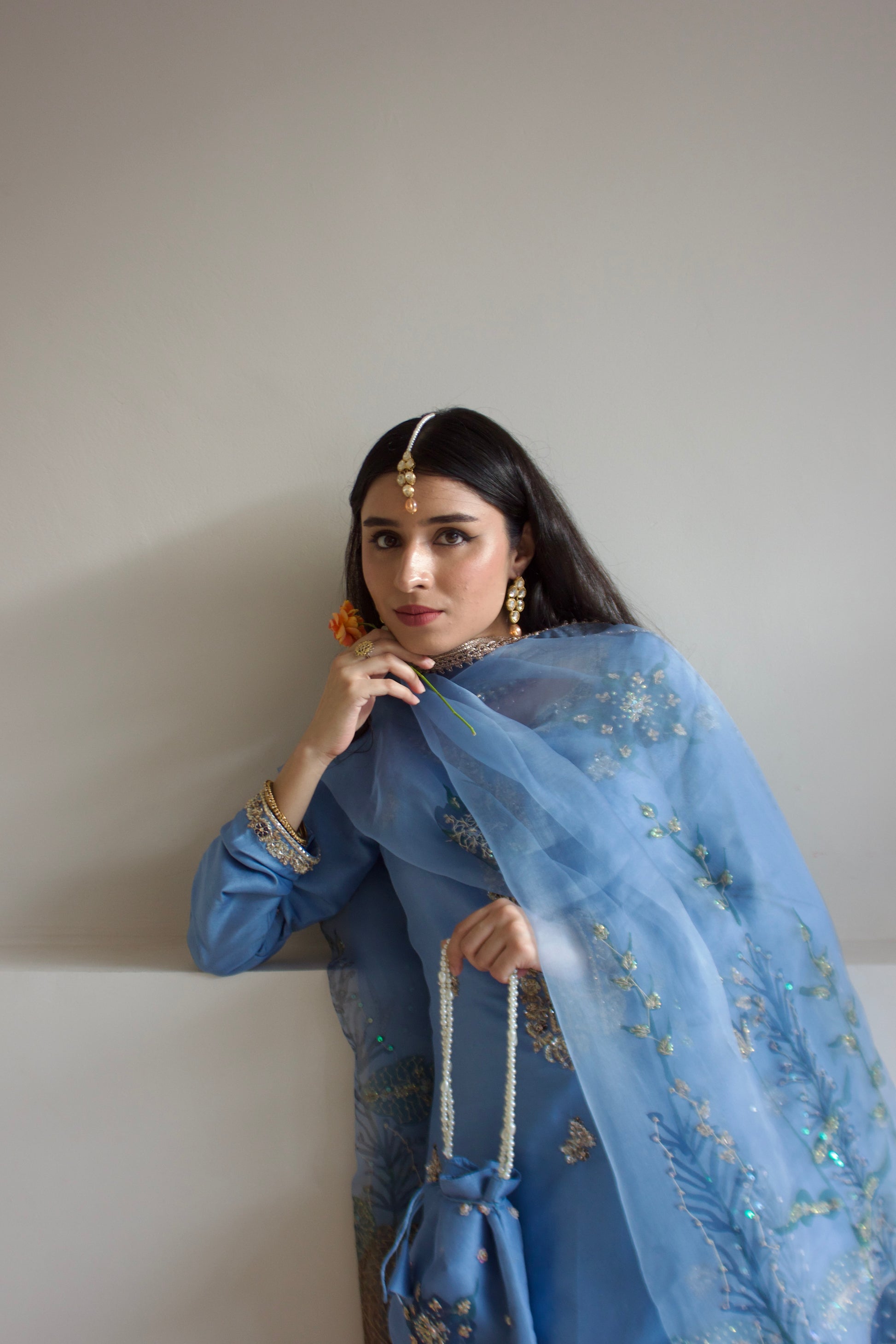 Elevate your festive wardrobe with our Rano Blue ensemble—a refined three-piece collection designed for occasions that matter. This curated set brings together a hand-painted pure organza dupatta with a meticulously embellished raw silk shirt and coordinating embellished raw silk sharara, each component exemplifying superior artisanal execution. Perfect for weddings, engagements, and festive celebrations, this ensemble combines luxurious materials with intricate detailing to create an impression of timeless elegance and sophisticated grace.