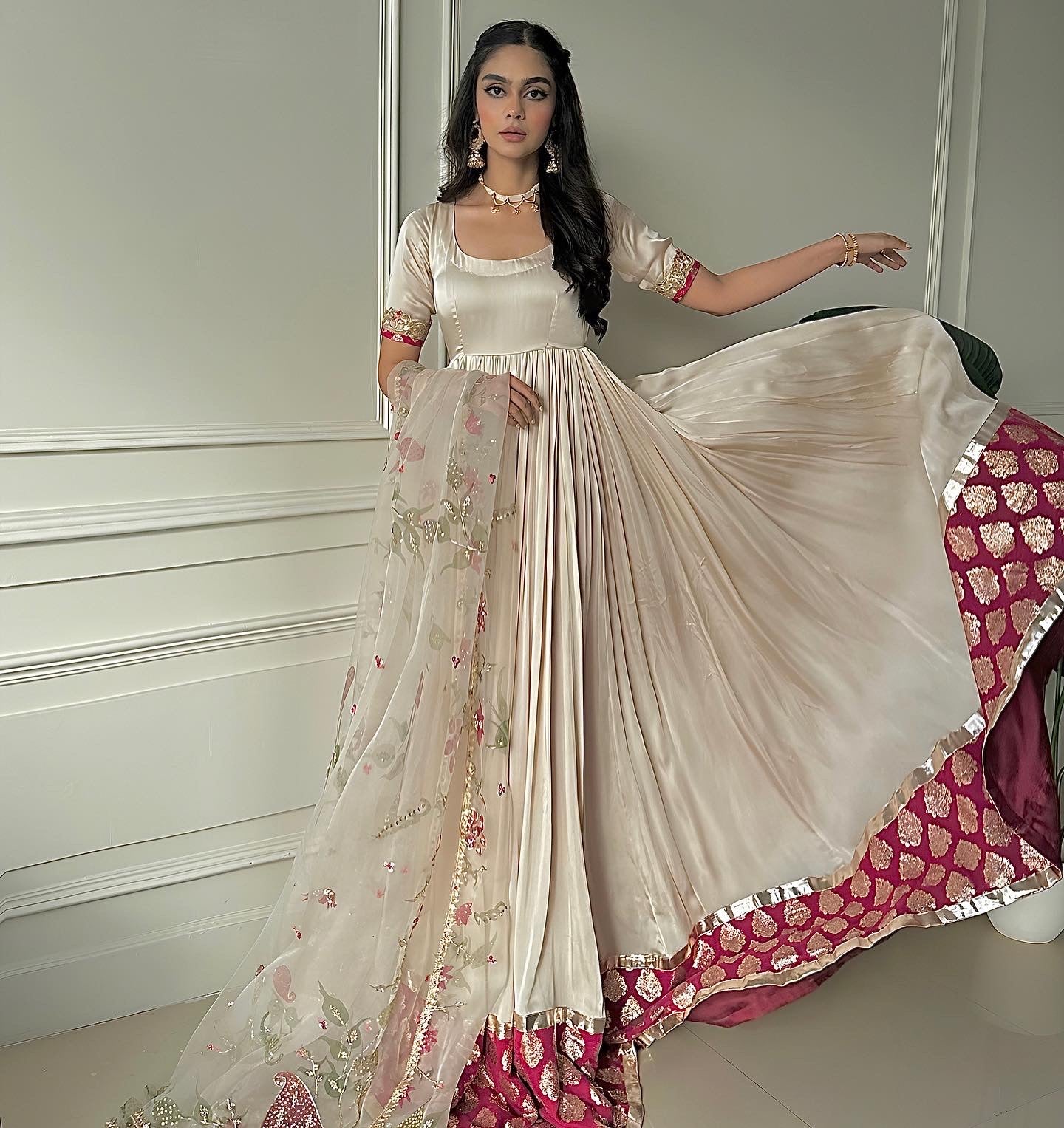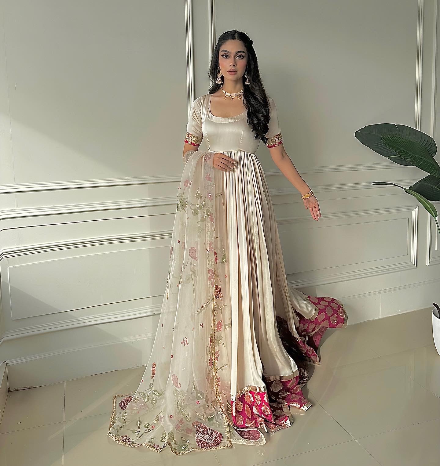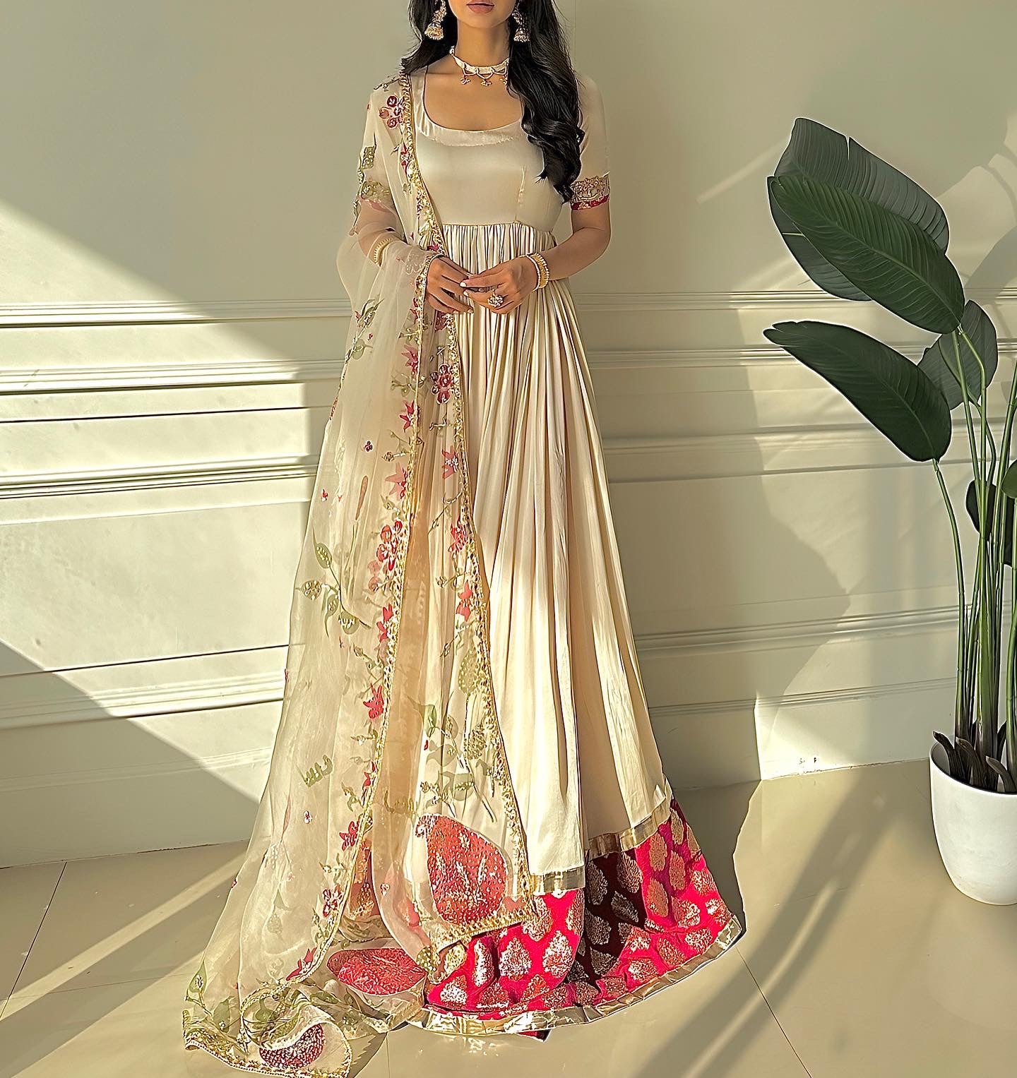 Embrace timeless sophistication with our Roha Peshwas collection—a distinguished two-piece ensemble curated for your most significant celebrations. This refined set combines a hand-painted pure organza dupatta with an elegantly crafted shamoze peshwas, each element reflecting superior artisanal mastery and premium materials. Ideal for weddings, engagements, and festive occasions, this ensemble delivers the polished aesthetic and luxurious texture that embodies grace and understated elegance.