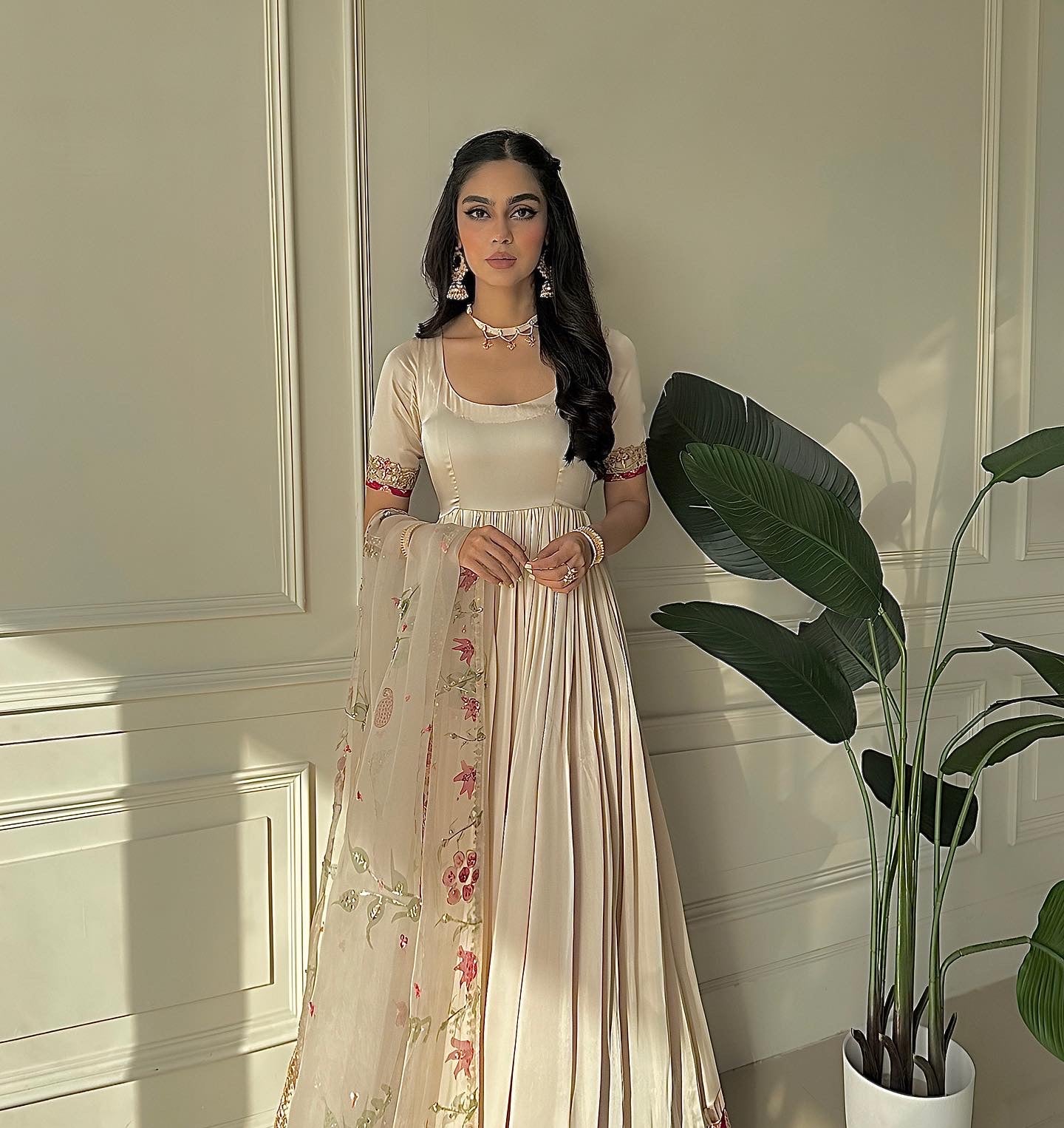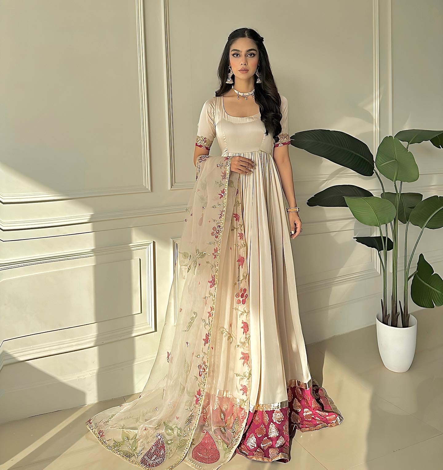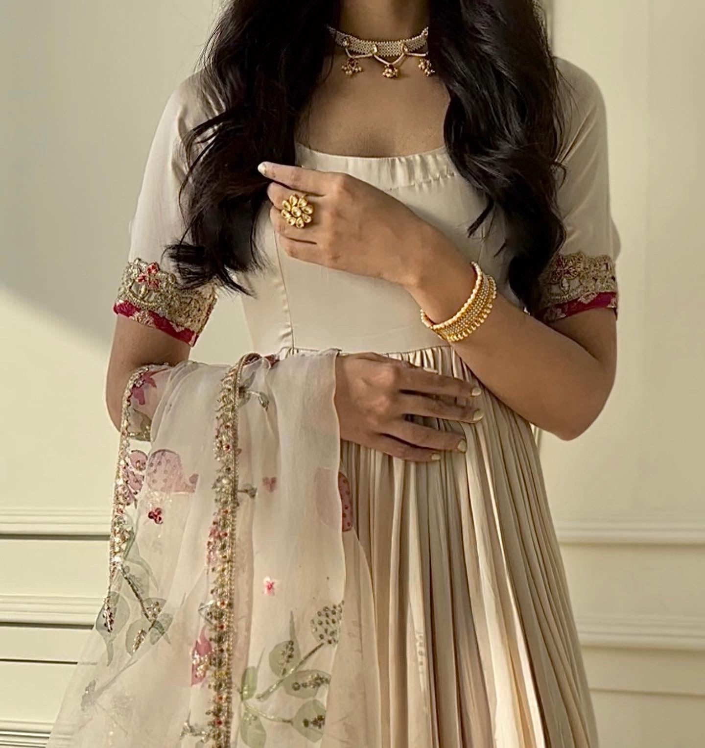 Embrace timeless sophistication with our Roha Peshwas collection—a distinguished two-piece ensemble curated for your most significant celebrations. This refined set combines a hand-painted pure organza dupatta with an elegantly crafted shamoze peshwas, each element reflecting superior artisanal mastery and premium materials. Ideal for weddings, engagements, and festive occasions, this ensemble delivers the polished aesthetic and luxurious texture that embodies grace and understated elegance.