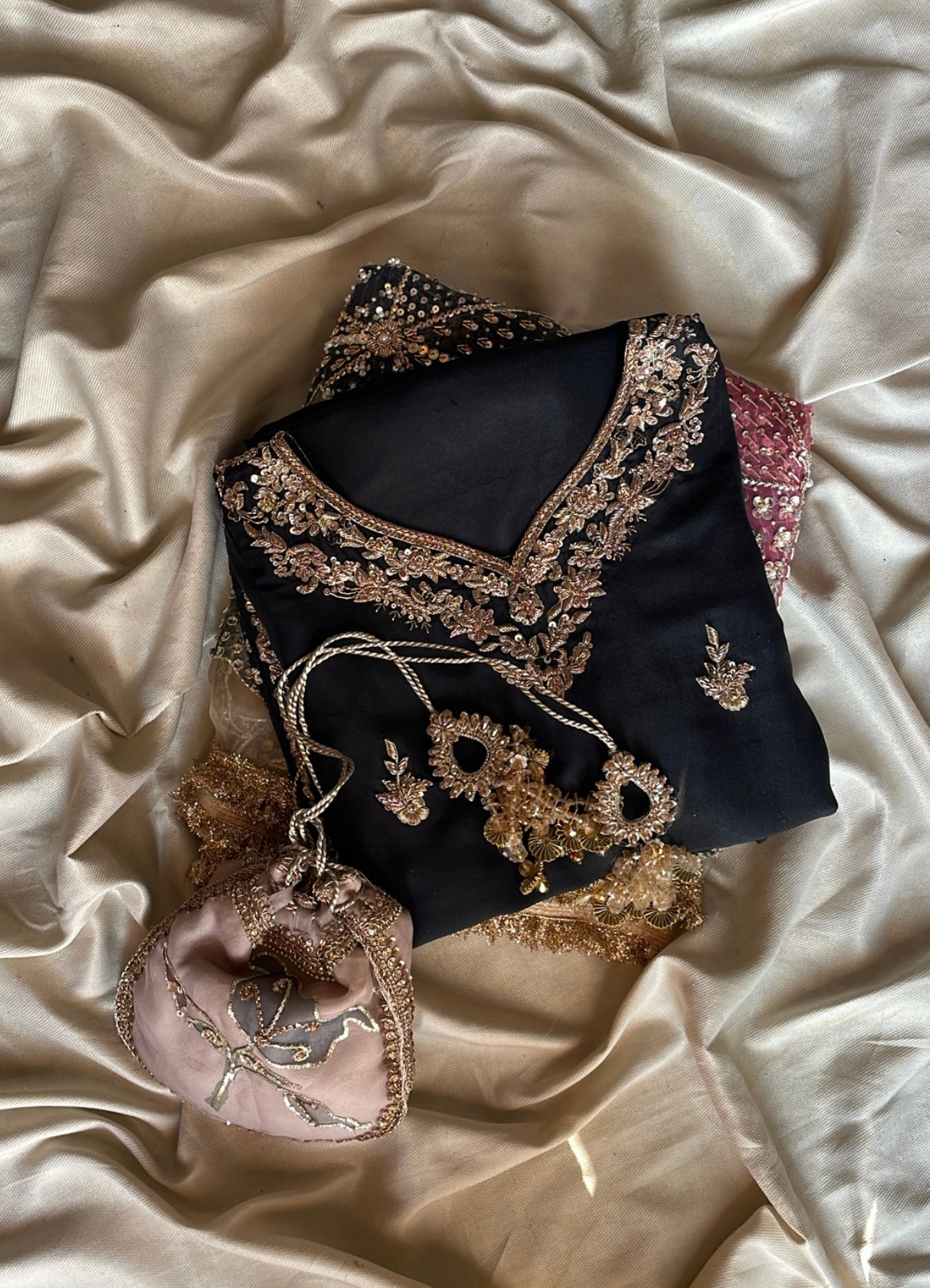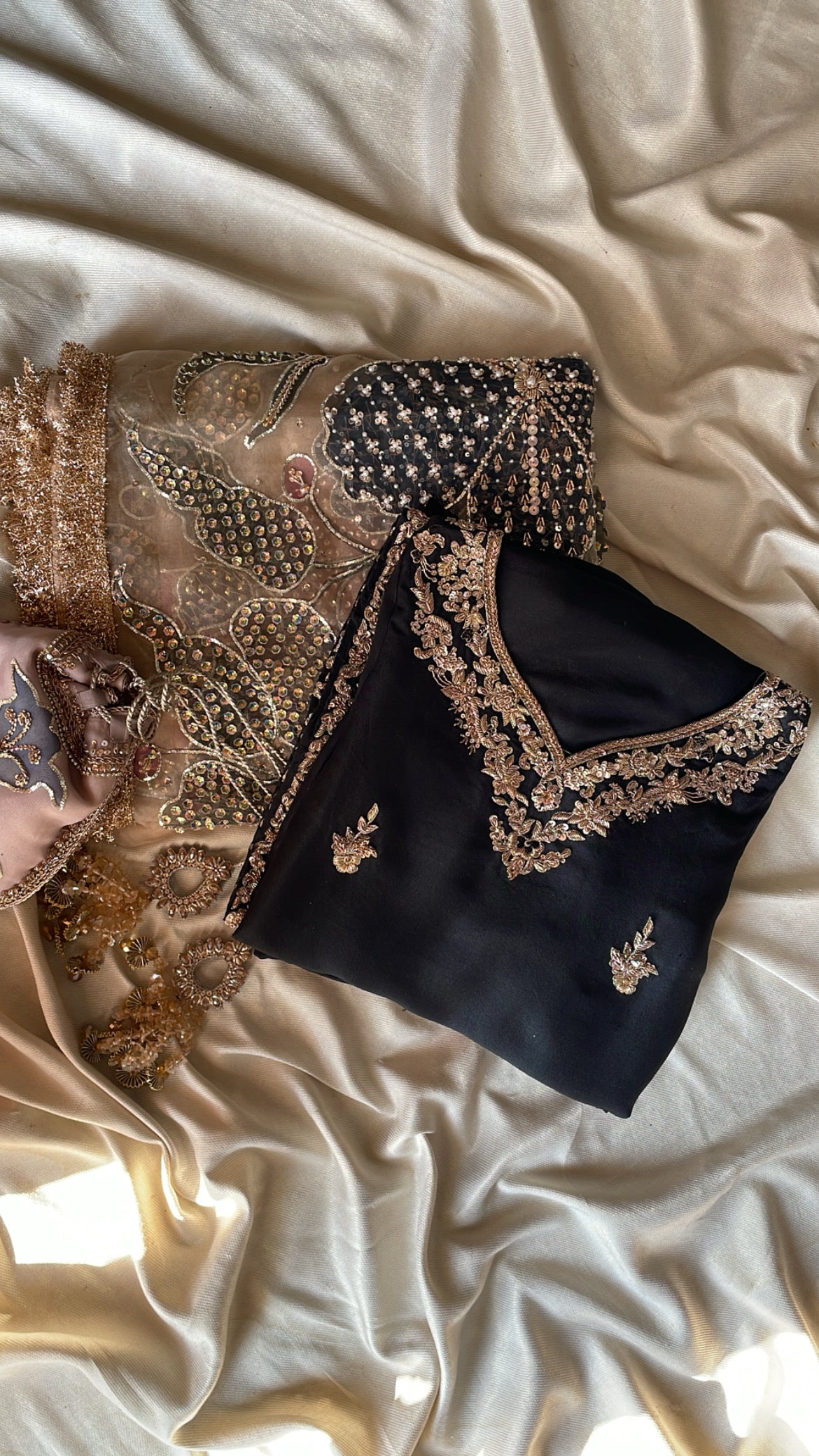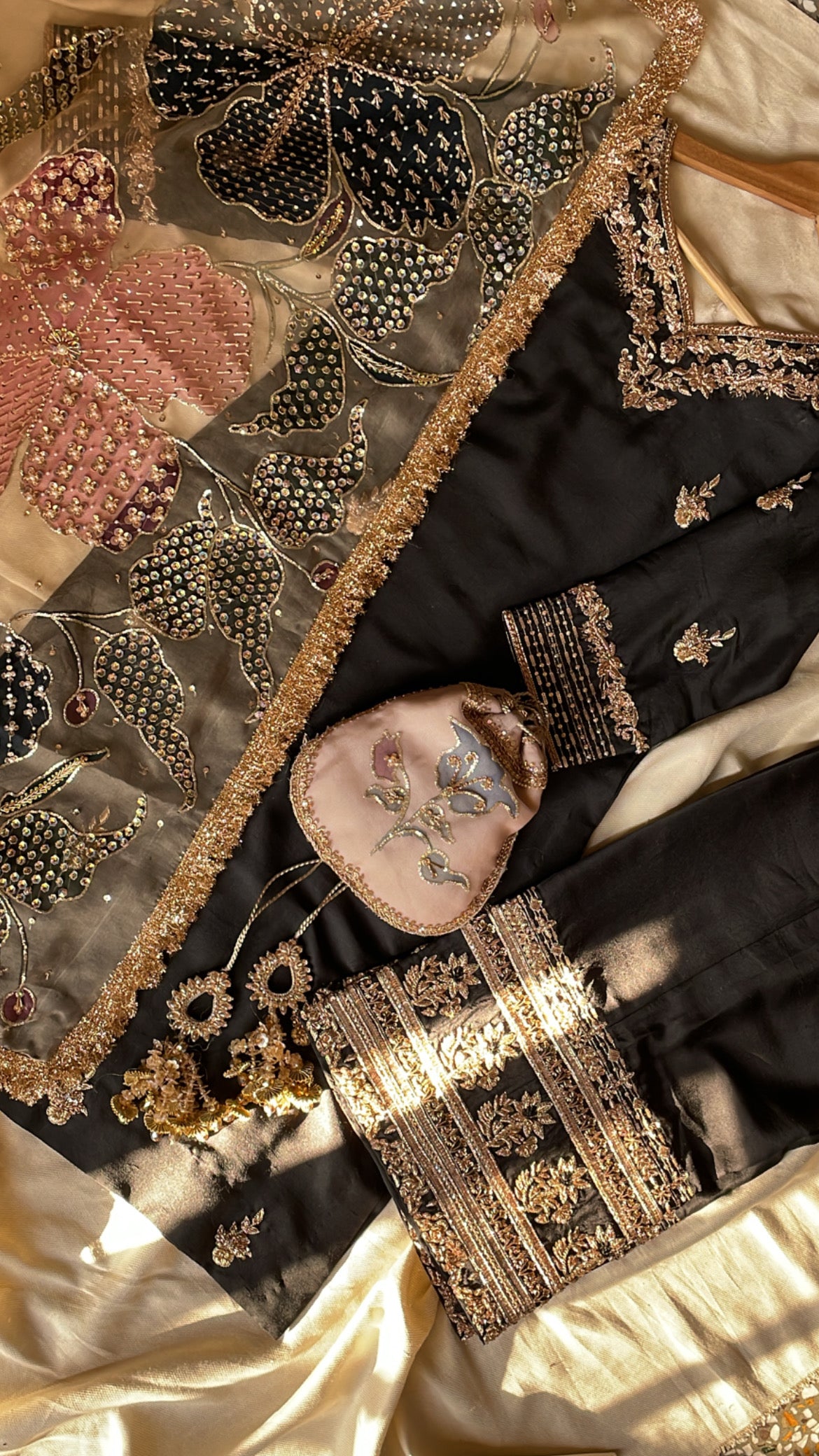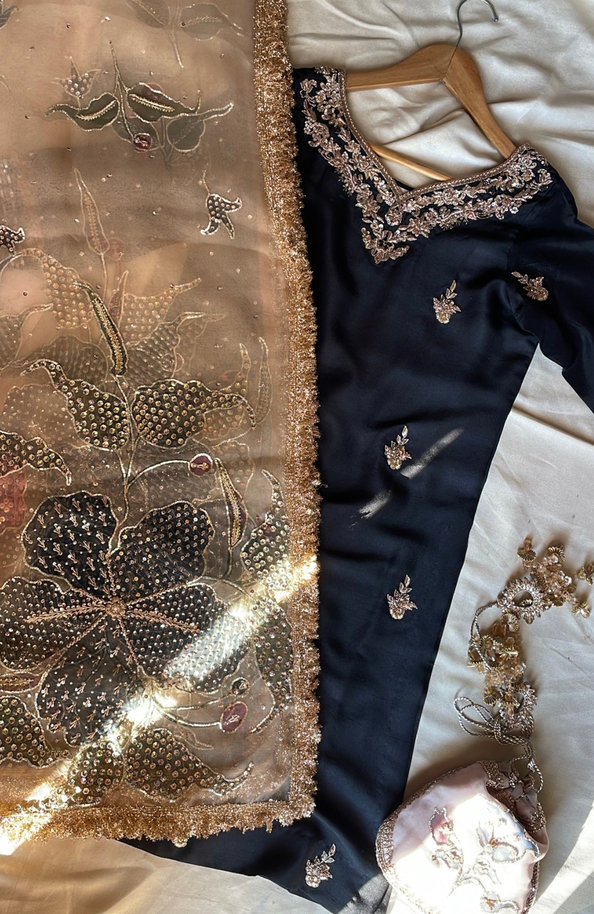 Unveil your most radiant self with Rukhsar, an expertly curated three-piece festive ensemble tailored for life's most significant moments. This refined collection unites a hand-painted pure organza dupatta with a meticulously embellished raw silk shirt and coordinating embellished raw silk shalwar, creating a harmonious composition of artistry and luxury. Designed for weddings, engagements, and festive celebrations, each thoughtfully crafted piece demonstrates exceptional workmanship and premium materials that embody grace and timeless elegance.