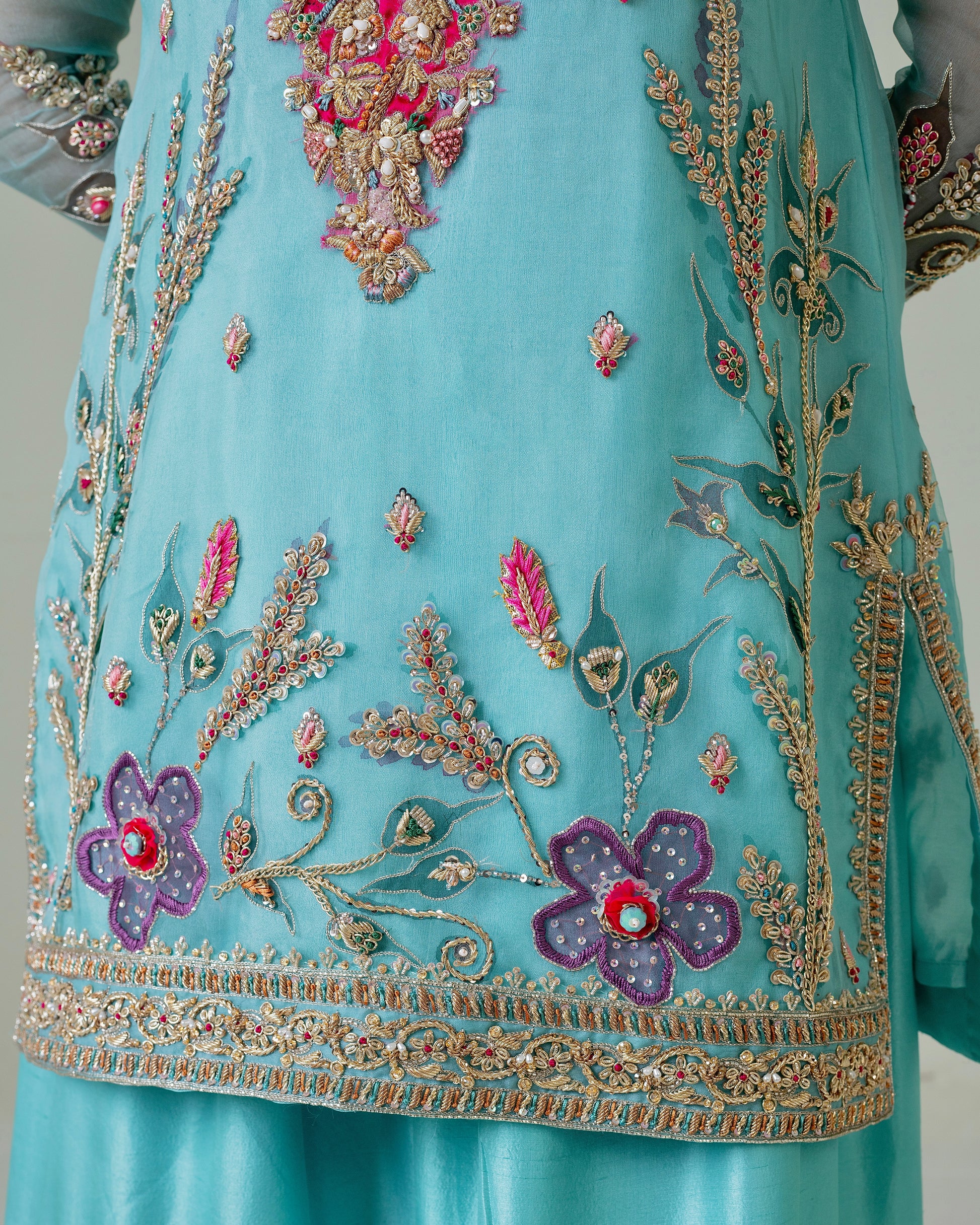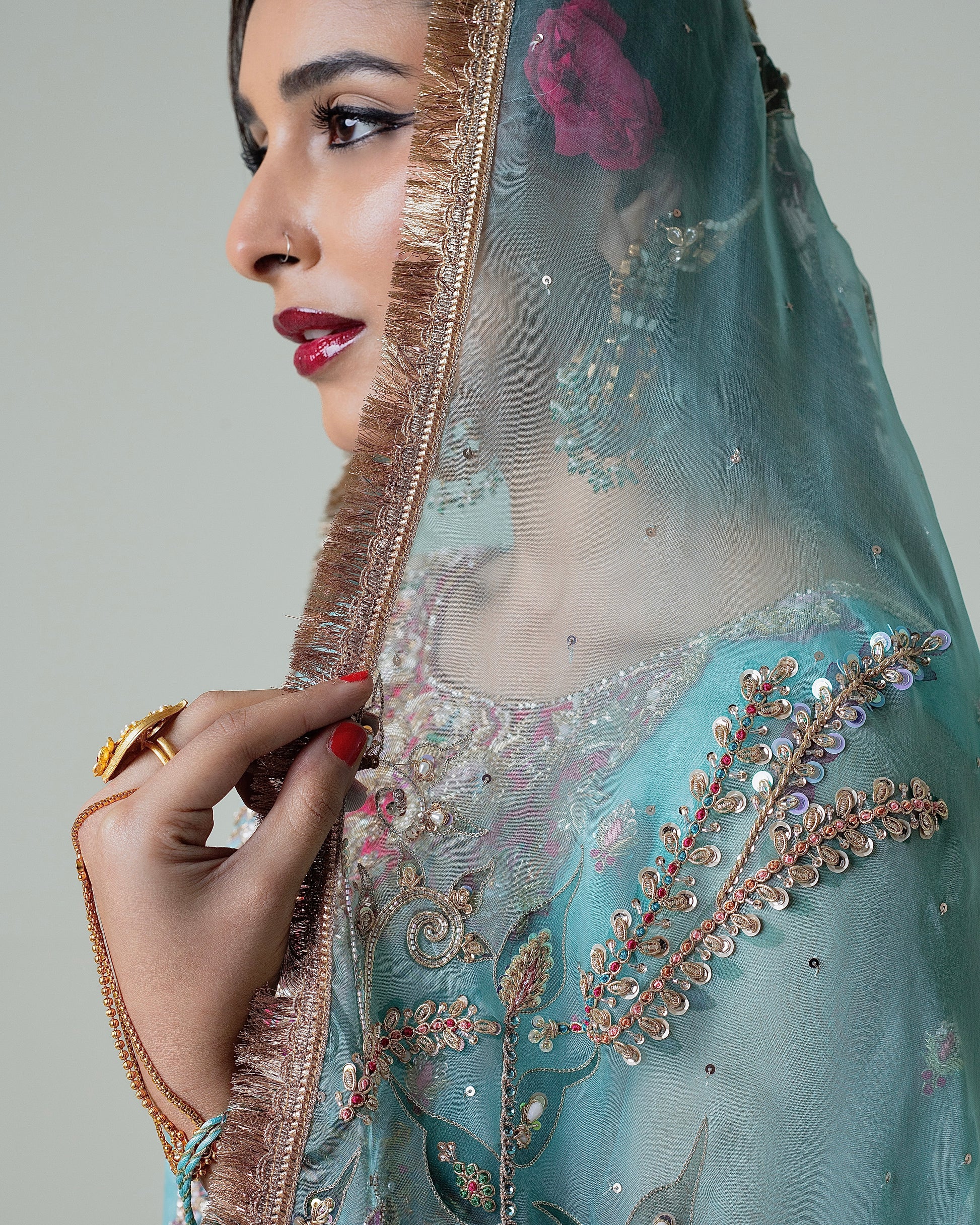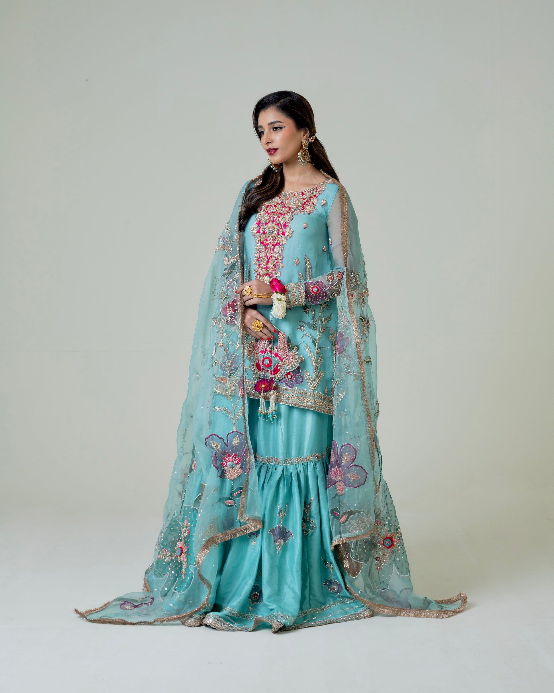 Embrace timeless sophistication with the Shahbano ensemble, a meticulously curated three-piece collection designed for your most significant moments. Featuring a hand-painted pure organza dupatta, an intricately embellished organza kurta, and a complementary raw silk gharara, this set exemplifies exceptional artisanal craftsmanship. The thoughtful combination of premium fabrics and detailed embellishments creates an understated yet commanding presence, perfect for weddings, engagements, and festive celebrations. Each piece reflects our dedication to quality and refined design, allowing you to celebrate with confidence and cultural grace.