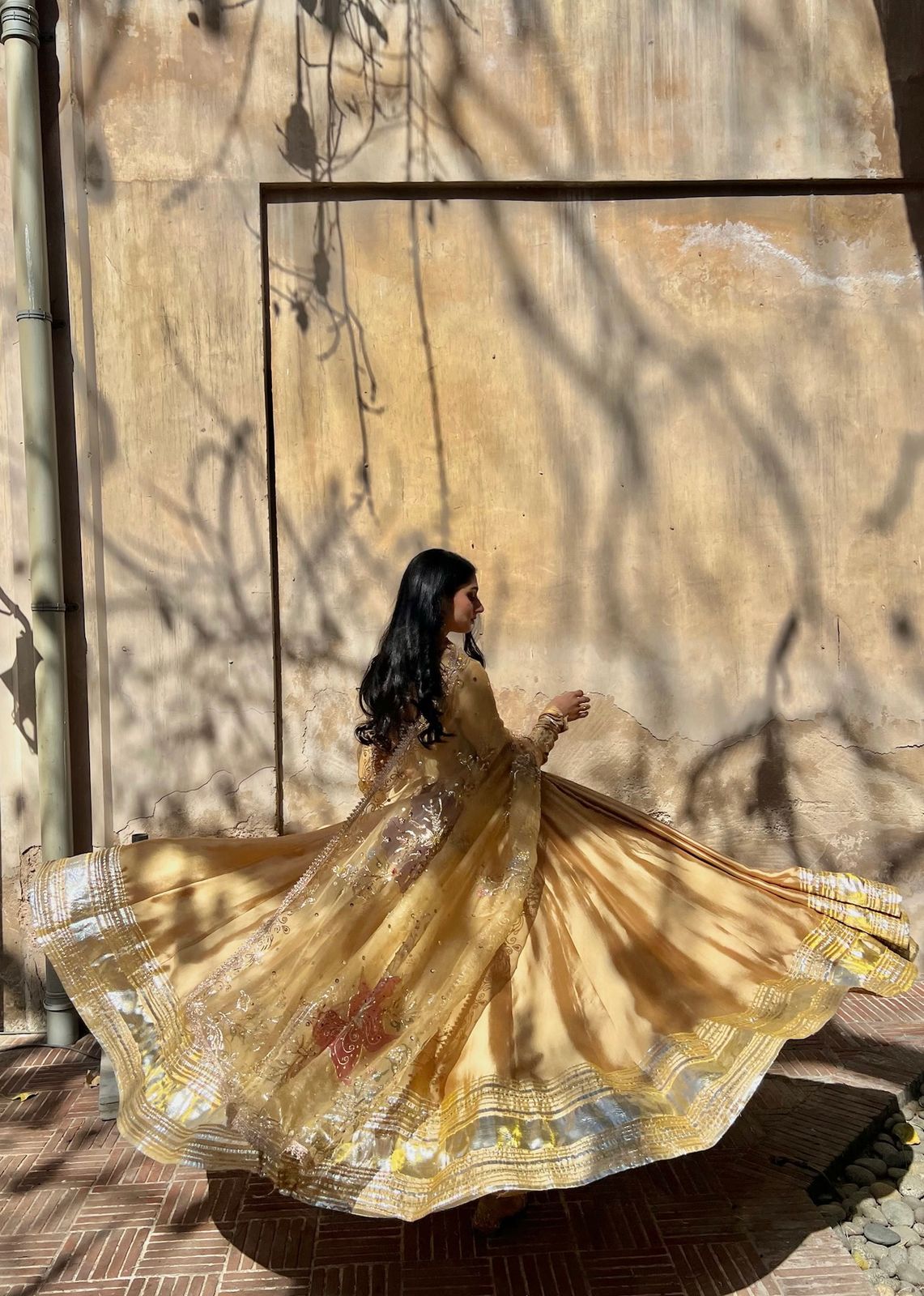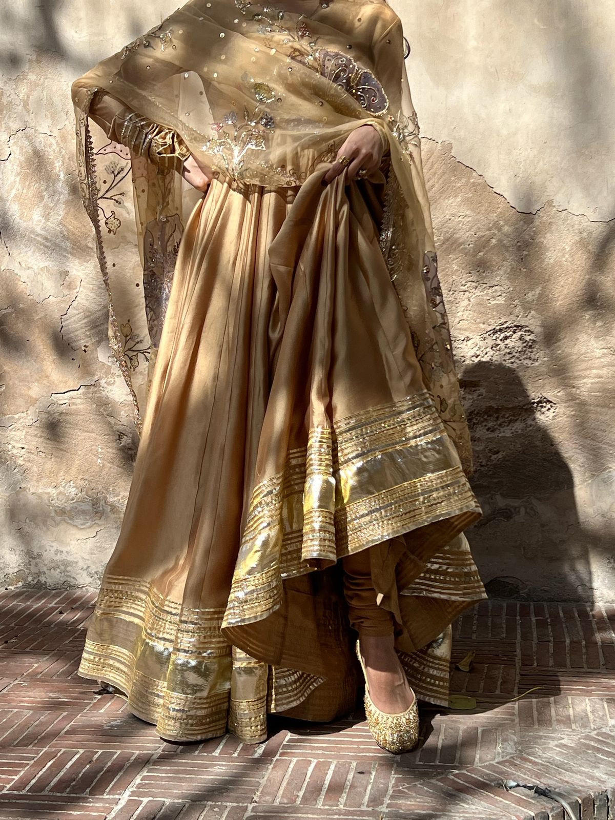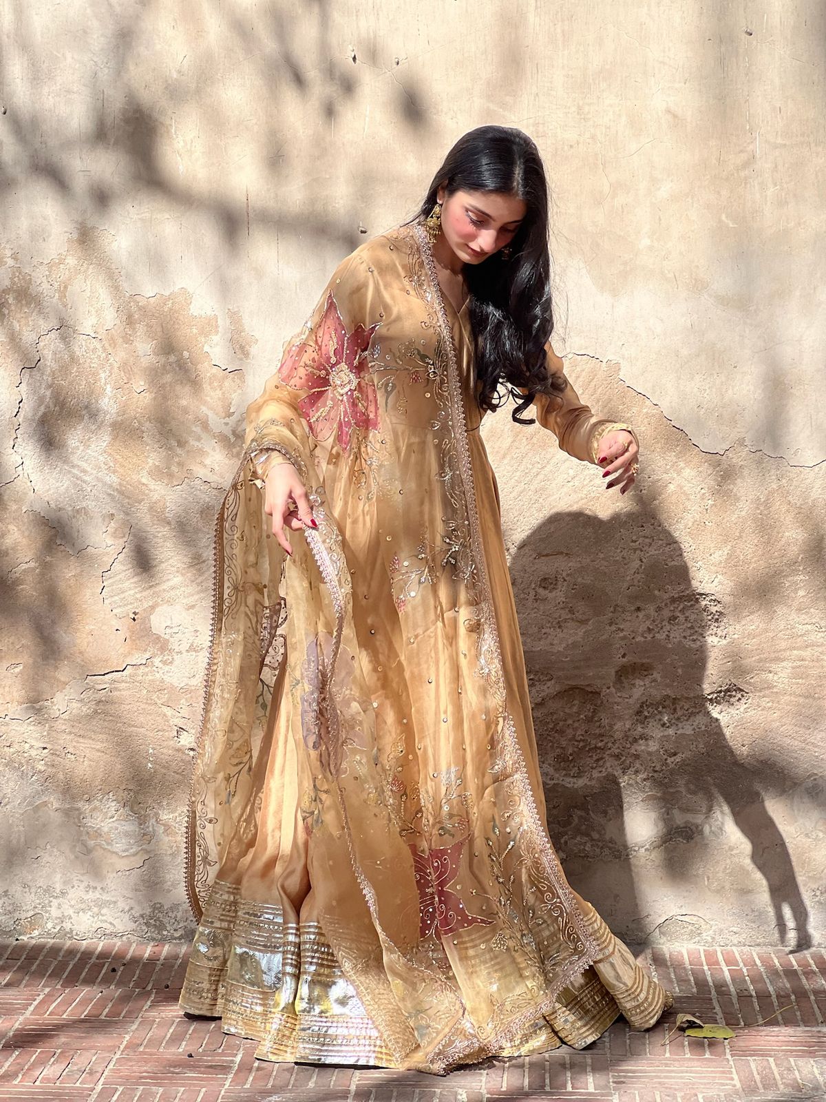 Discover understated luxury with Sooraj, a sophisticated flared peshwas that seamlessly blends traditional aesthetics with contemporary grace. Constructed from premium materials, this voluminous silhouette moves fluidly with natural elegance, making it an exceptional choice for weddings, festive occasions, and cultural celebrations. The ensemble is elevated by an exquisite hand-painted dupatta, a testament to artisanal mastery where each carefully applied stroke creates a distinctive narrative. The supple, gracefully draping fabric enhances your silhouette while introducing refined color and artistic detail that distinguishes your festive presentation.