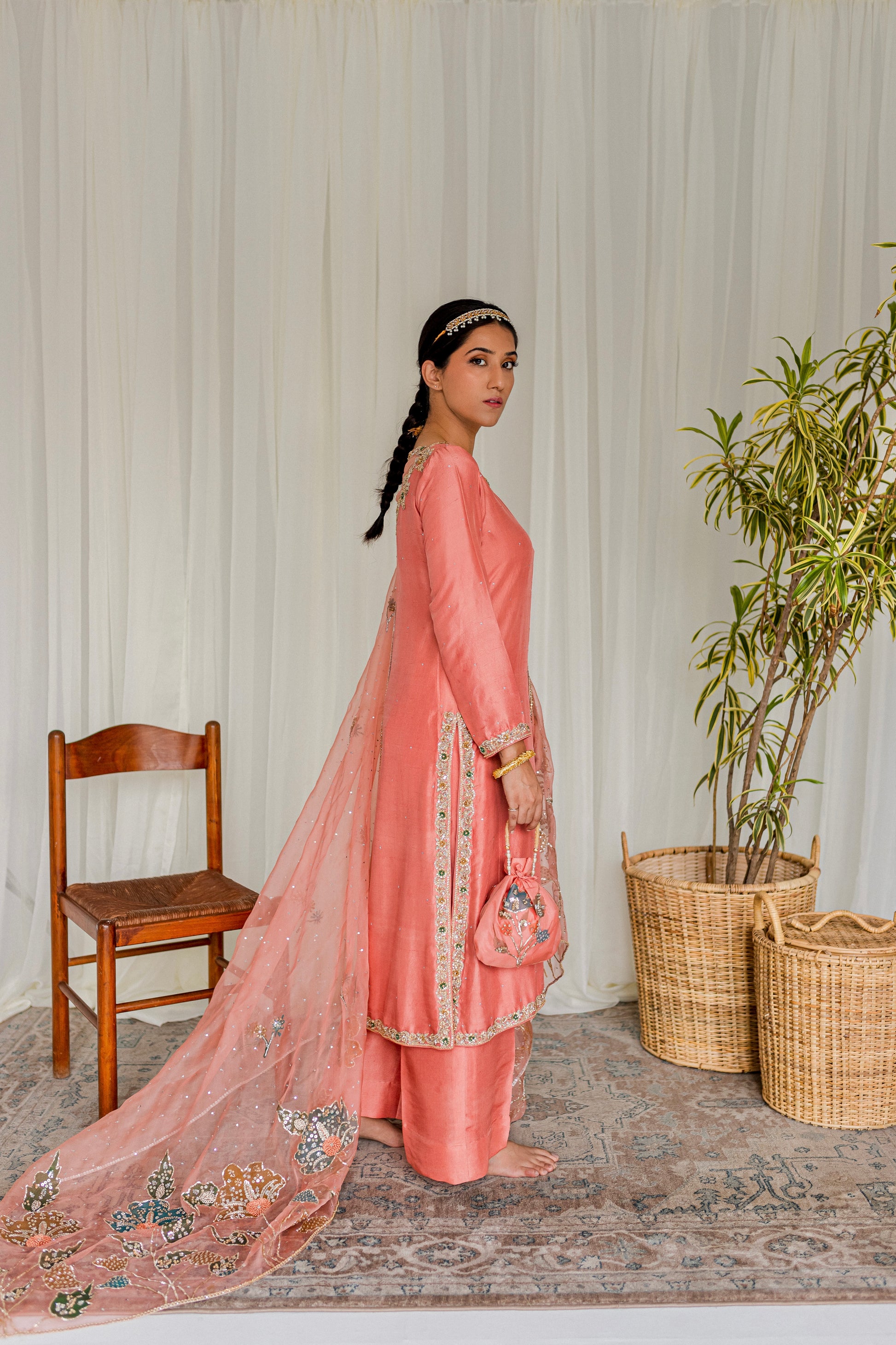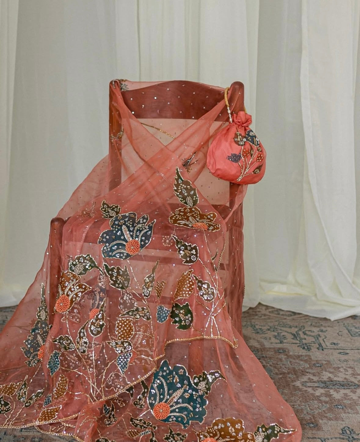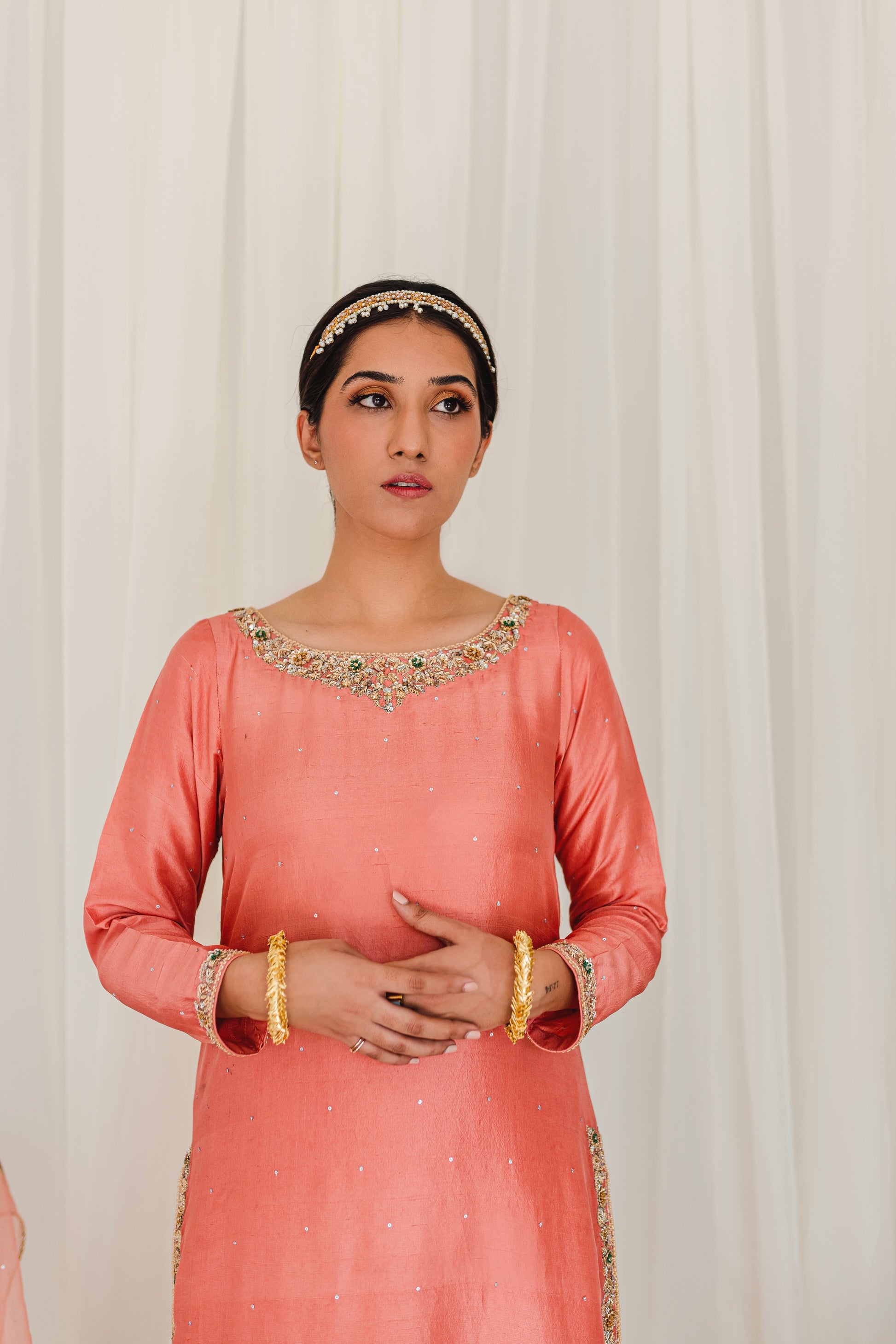 Zarish presents a sophisticated three-piece ensemble designed for discerning occasions. This collection combines a hand-painted organza dupatta with an intricately embellished raw silk shirt and coordinating raw silk trousers. The thoughtful pairing of premium fabrics and artisanal detailing creates a refined aesthetic suitable for elevated celebrations and formal gatherings.